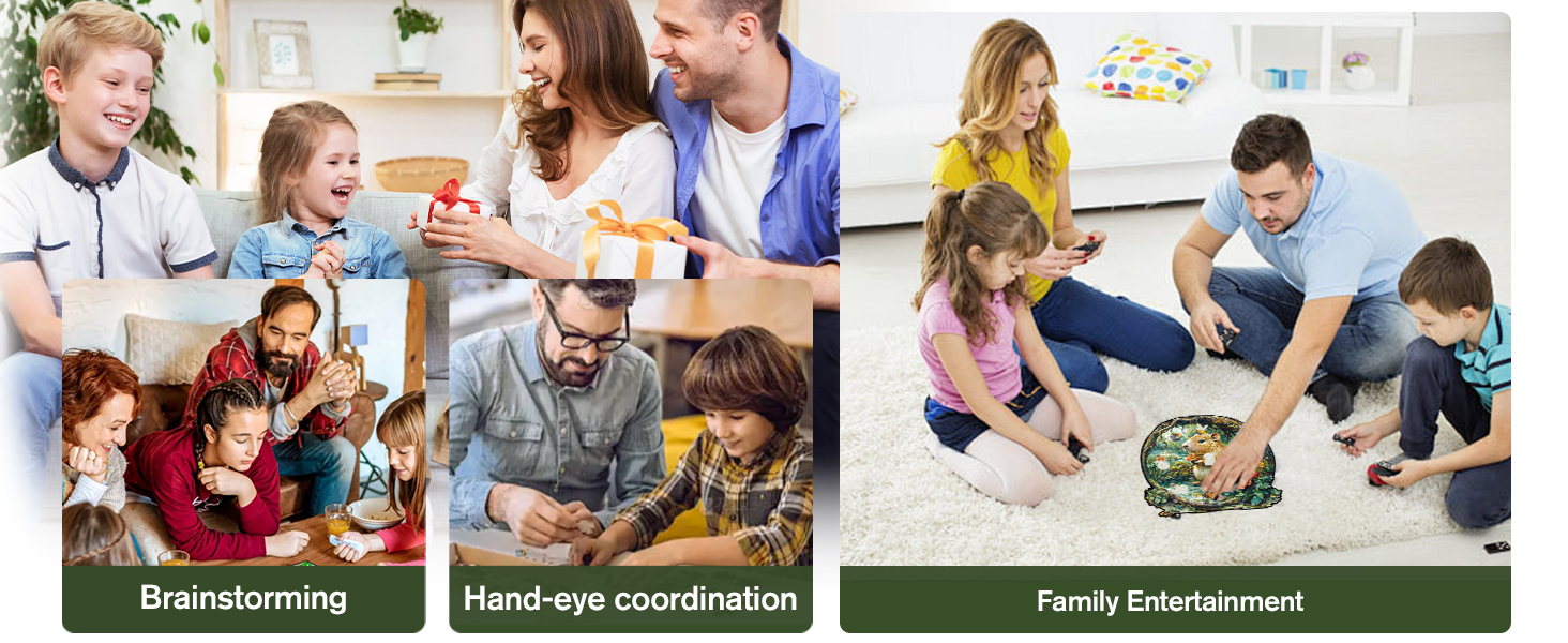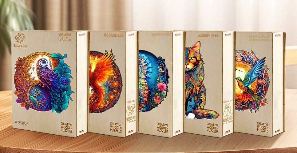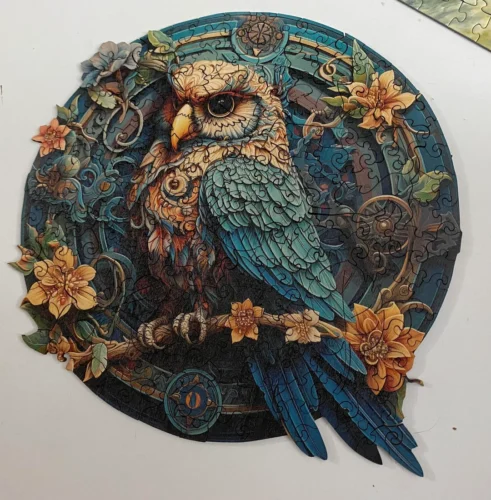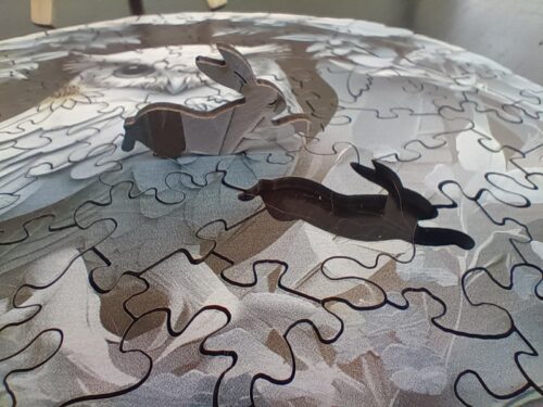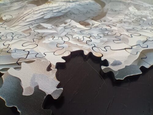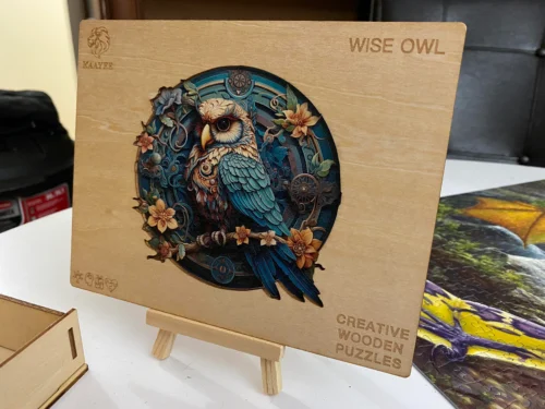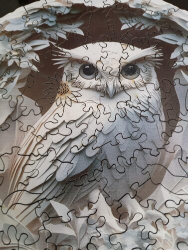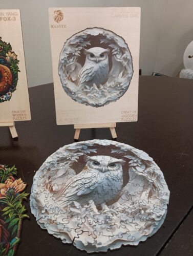 We were looking for "quiet afternoon or evening" puzzles to get some no-screen time. We were intriguided by the intricated shapes and we really liked the choice and quality of the pictures. So we bought the 100 pieces "Snow Owl" from KAAYE.The puzzle is well made. The shape of the puzzle pieces are a nice change from the classic puzzle pieces and offer a nice new challenge. They fit perfectly. They are sturdy, thick and heavy enough they do not stick to paws (kitties always participate).The picture is as beautiful as advertised and the 3D effect (or depth) is really neat.