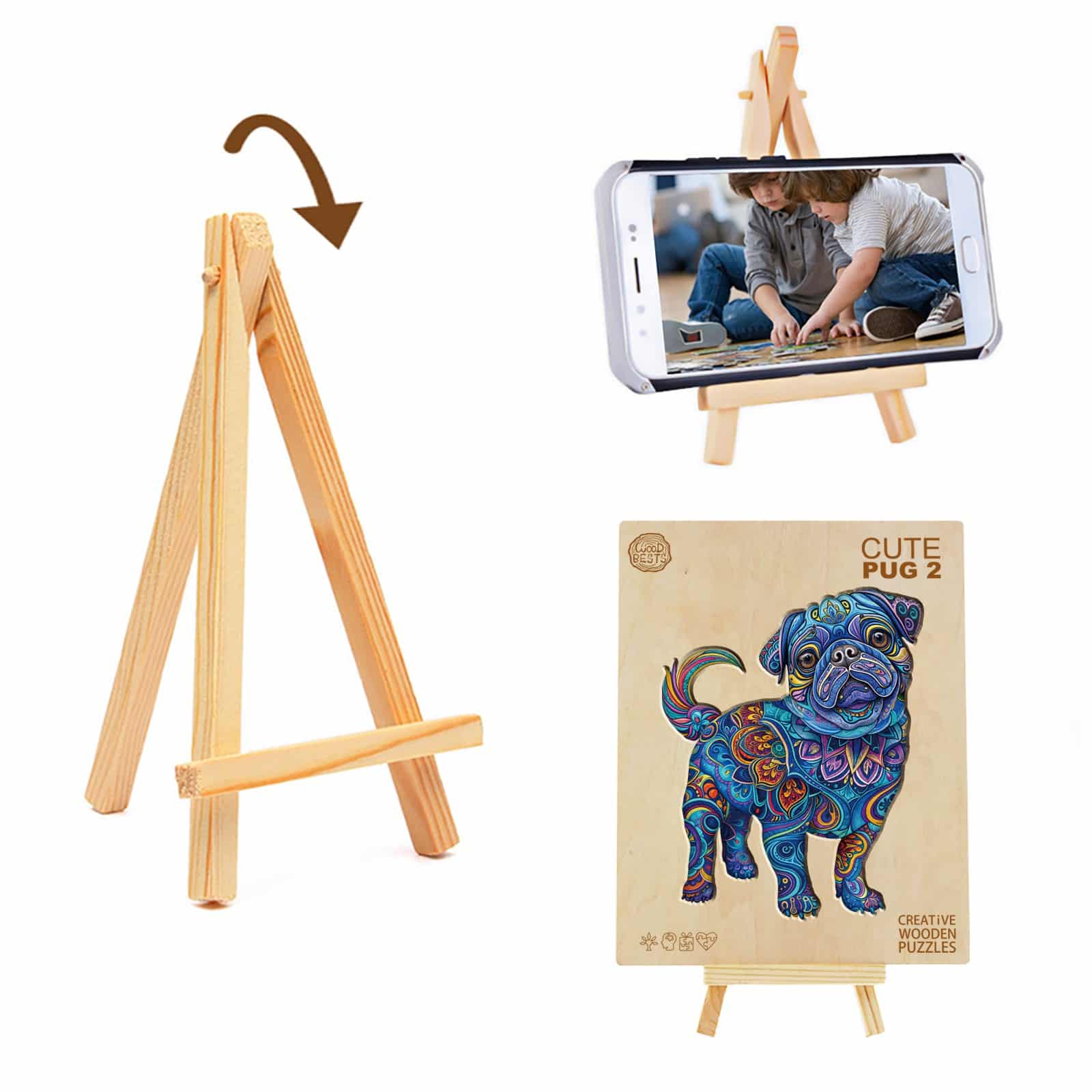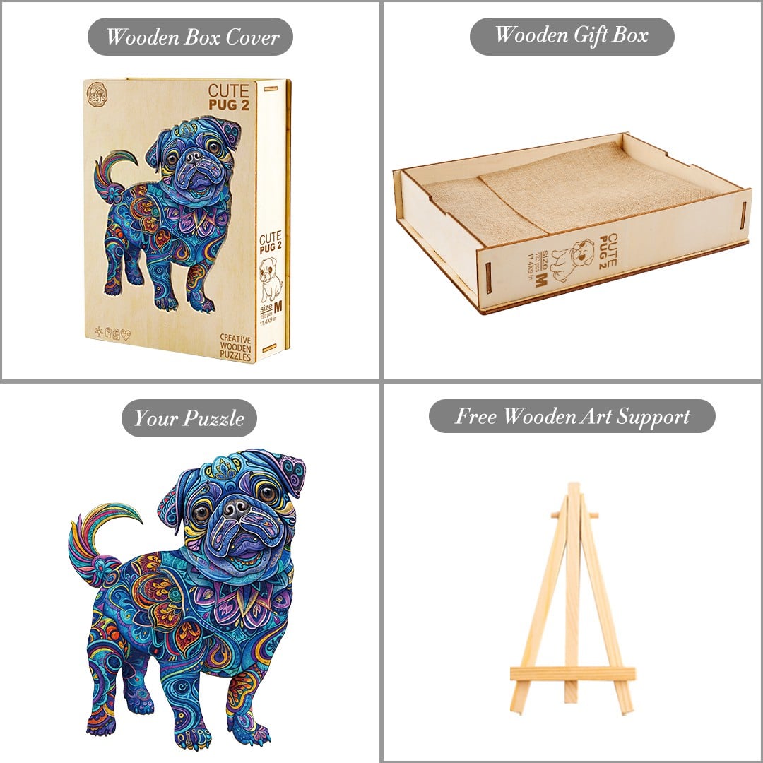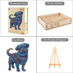 This delightful wooden jigsaw puzzle showcases a stunningly intricate and colorful design of a pug. With its vivid patterns and playful details, this puzzle is sure to captivate dog lovers and art enthusiasts alike. Each precision-cut wooden piece fits together seamlessly, creating a high-quality, long-lasting puzzle experience. Perfect for relaxation, mental stimulation, and a touch of joy, this puzzle makes an eye-catching addition to any collection or a thoughtful gift for puzzle lovers.