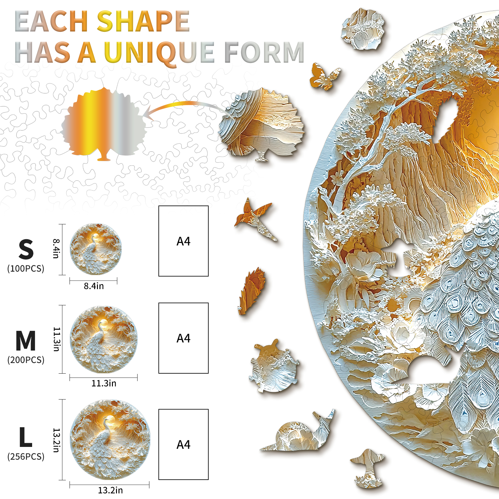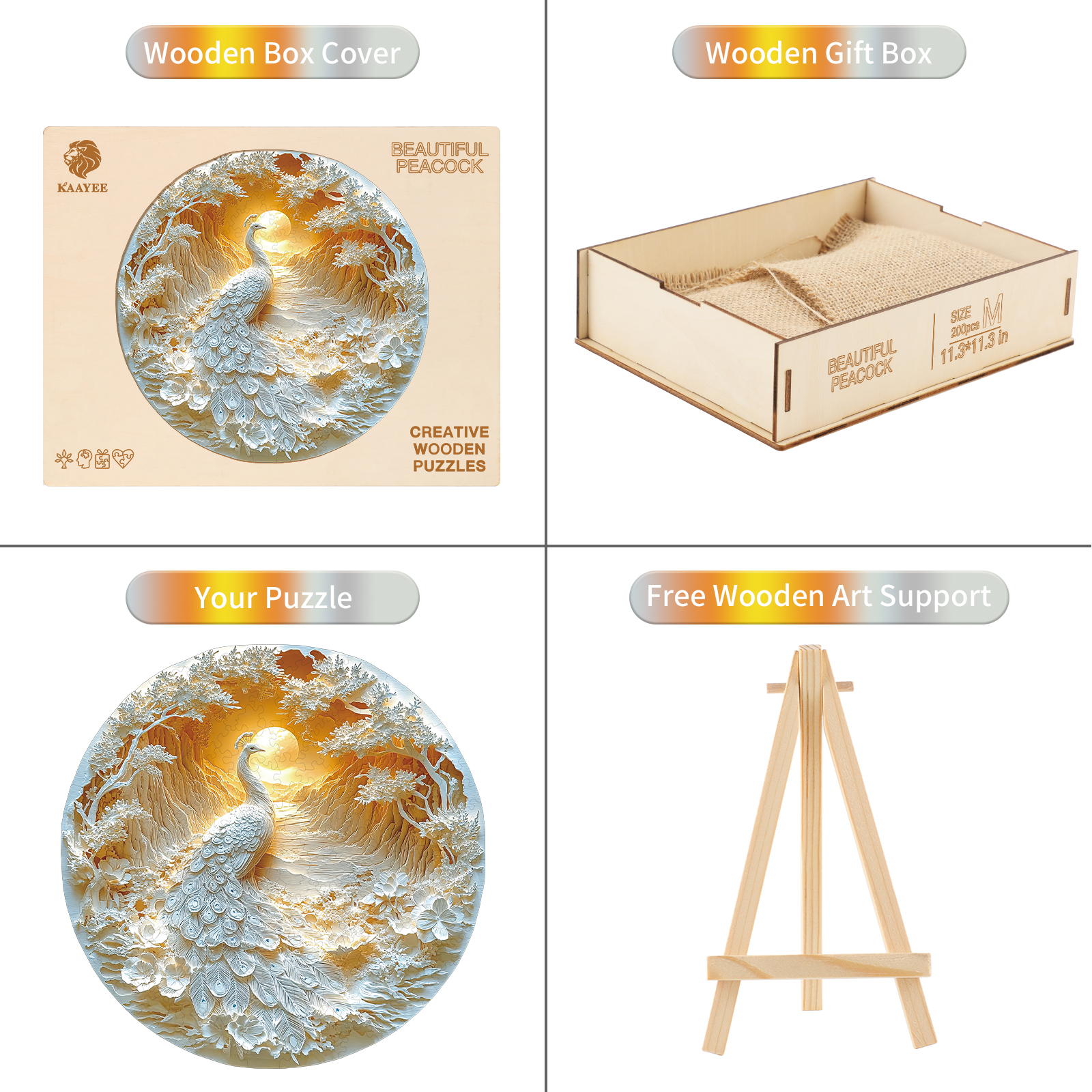 This breathtaking Kaayee wooden puzzle features a magnificent white peacock as the central figure, set against a stunning, ethereal landscape. The entire scene is crafted with an incredible sense of depth and texture, reminiscent of a delicate paper-cut artwork or a finely carved sculpture, predominantly in shades of ivory and white. The proud peacock, with its intricately detailed feathers, gazes towards a brilliant, large sun rising or setting between distant mountains, casting a warm, golden glow that illuminates the scene. Surrounding the peacock are beautifully rendered white trees and lush foliage, adding to the serene and mystical atmosphere.
