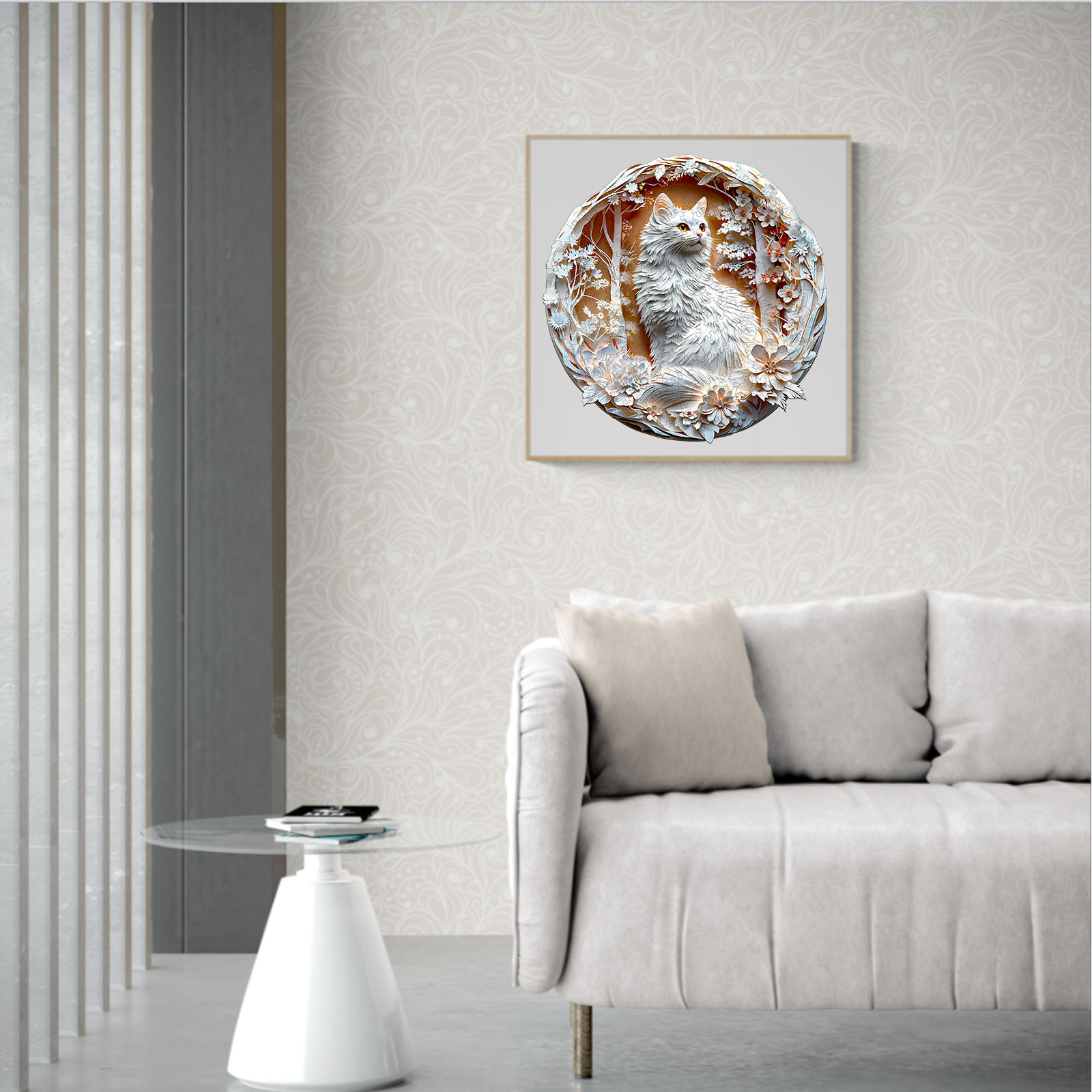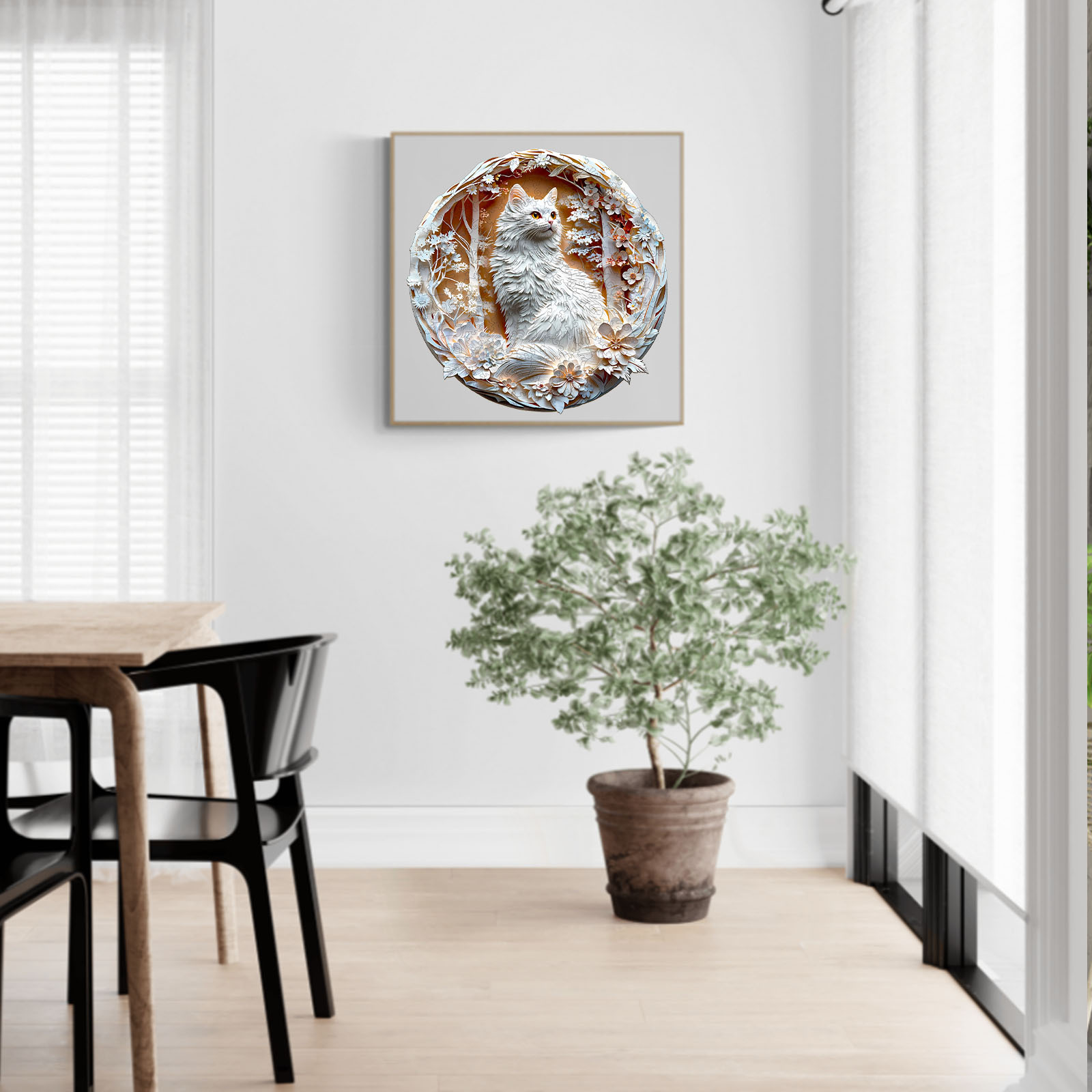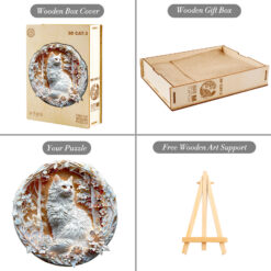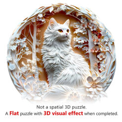 Step into a world of serene beauty with our “Winter Blossom Feline” wooden jigsaw puzzle by Kaayee. This exquisite puzzle showcases a magnificent white cat with warm, amber eyes, gracefully positioned amidst a delicate, wintry floral and tree scene. The intricate design gives the impression of layered paper cutouts, creating a unique depth and ethereal quality.Each piece of this Kaayee wooden puzzle is crafted with precision, ensuring a seamless and satisfying assembly experience. As you bring this captivating image to life, you’ll admire the subtle textures and the soft, glowing background that highlights the pristine white of the cat and the frosted blossoms.