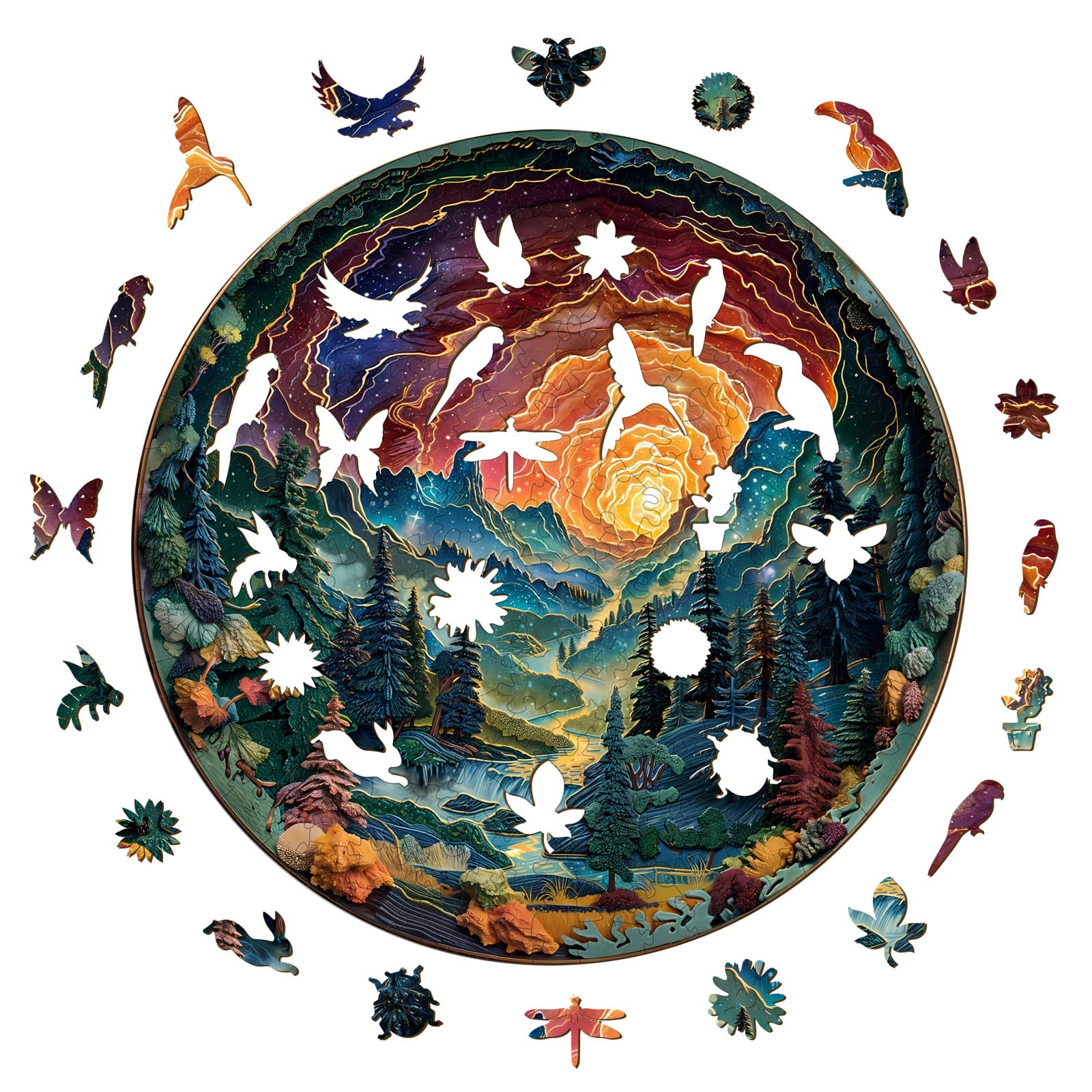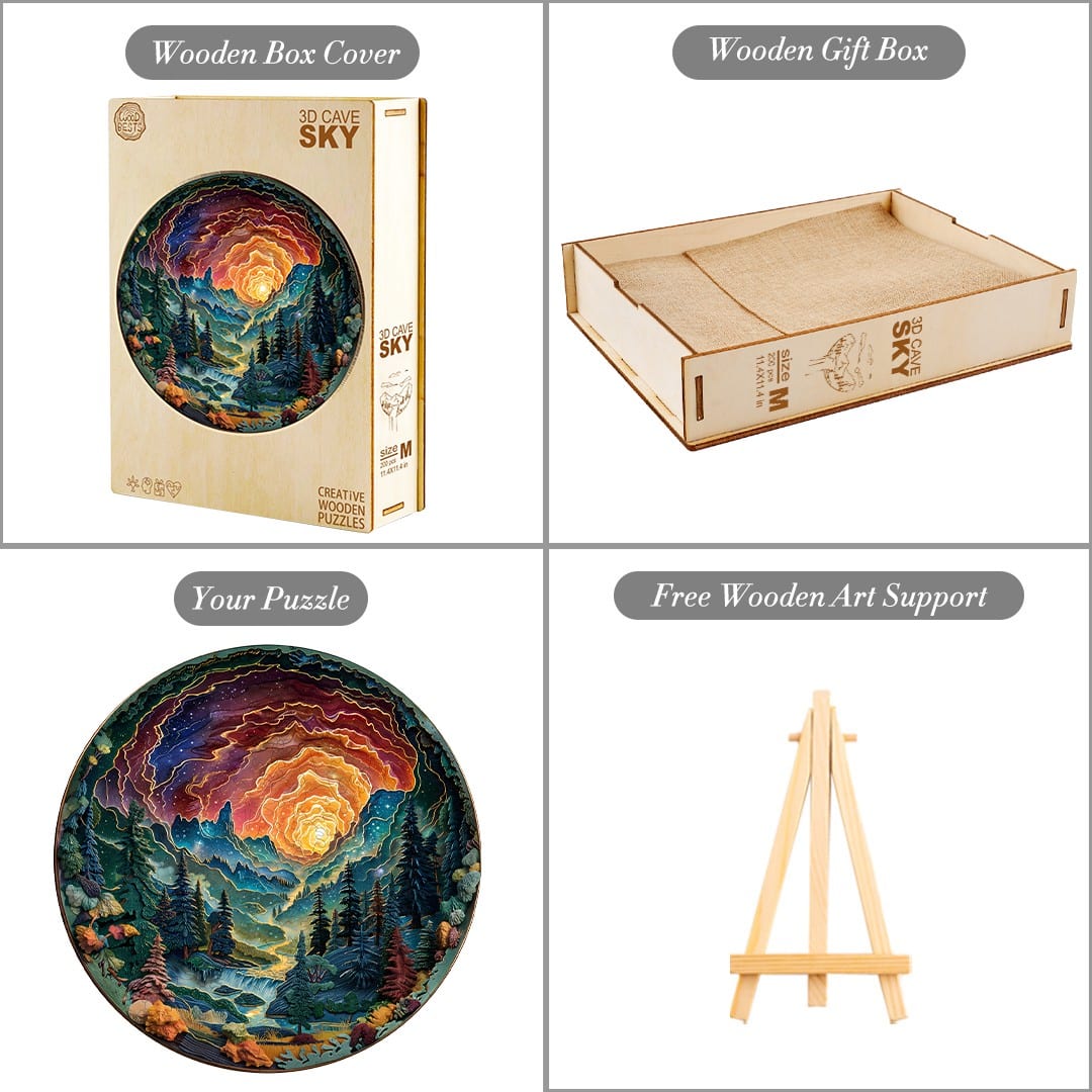 Welcome to our 3-D vision inside of the cave series, which is intended to display different landscape of 3-D effect with flat puzzle. This is the fourth cave, and through this cave you could see a picture of the wonderland under the beautiful sunset. There are all kinds of trees here, sweet springs, and in the evening, there are many fireflies in the sky. If you had the opportunity to enter the world in this cave, would you want to give it a try?