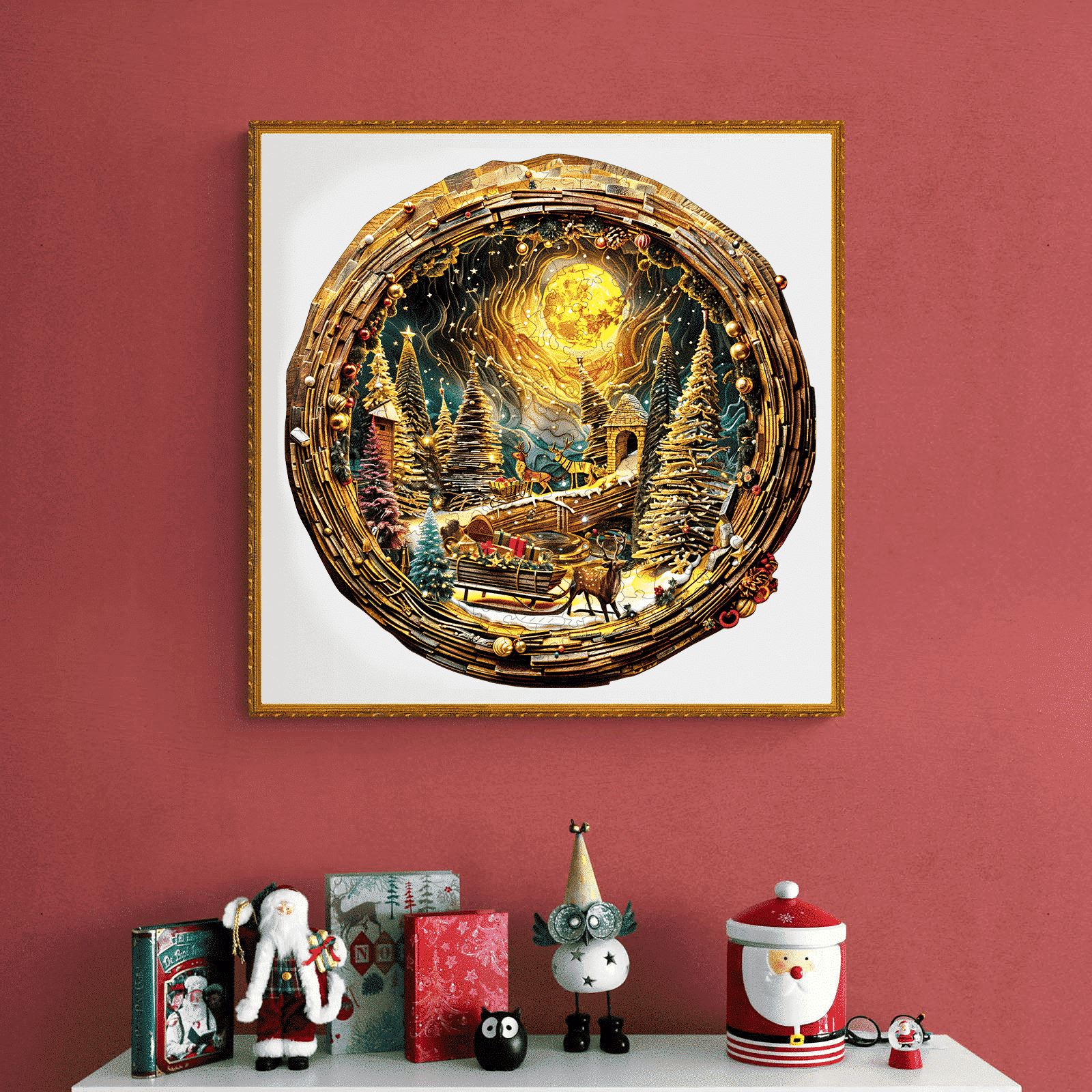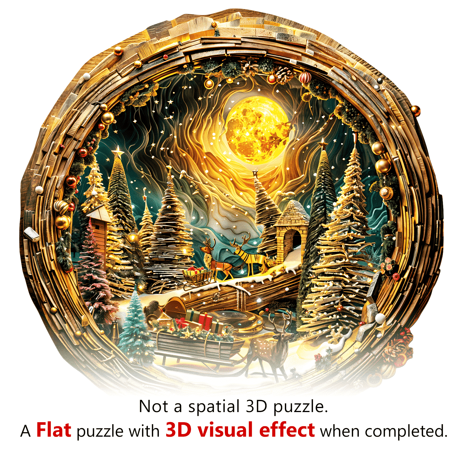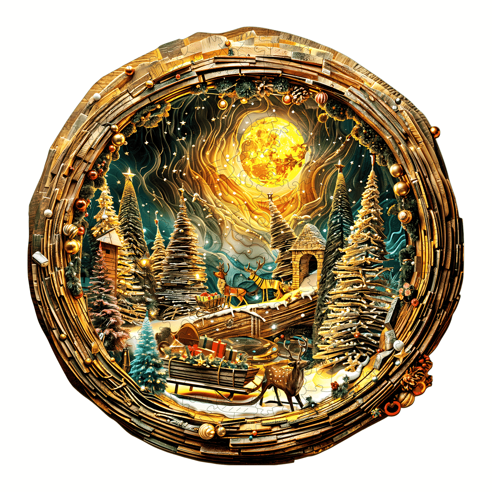Experience the magic of the season with the Christmas Eve 2 wooden puzzle. This breathtaking scene captures a peaceful winter night with snow-covered pine trees, a glowing full moon, and a charming village nestled in the background. In the foreground, reindeer pull a sleigh filled with Christmas gifts, while festive decorations sparkle around the scene. The puzzle’s intricate design and rich details evoke the wonder of a cozy, festive evening. Perfect for holiday enthusiasts, this puzzle makes an ideal seasonal activity or a beautiful gift that embodies the warmth and joy of Christmas Eve.