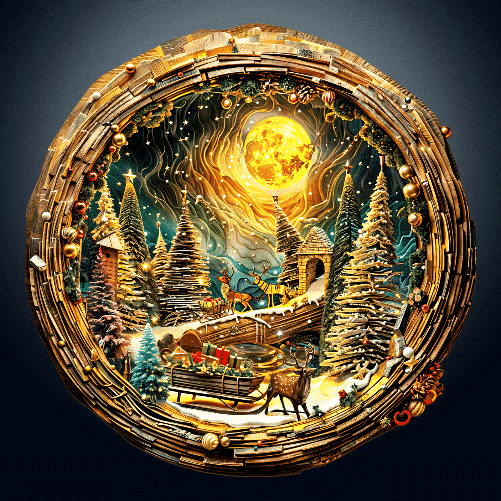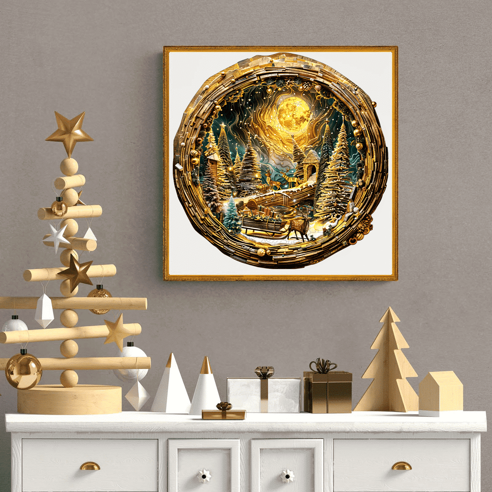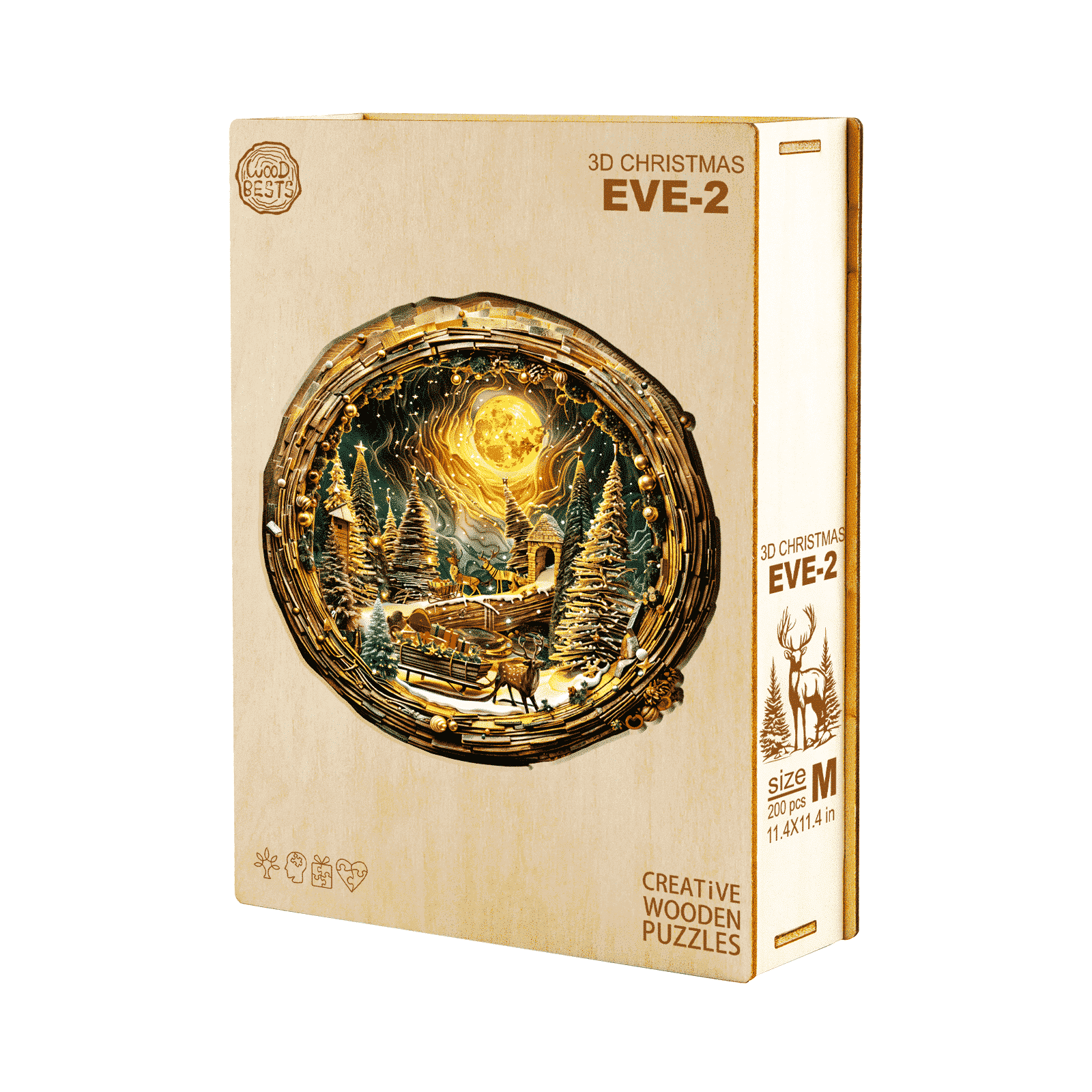 Experience the magic of the season with the Christmas Eve 2 wooden puzzle. This breathtaking scene captures a peaceful winter night with snow-covered pine trees, a glowing full moon, and a charming village nestled in the background. In the foreground, reindeer pull a sleigh filled with Christmas gifts, while festive decorations sparkle around the scene. The puzzle’s intricate design and rich details evoke the wonder of a cozy, festive evening. Perfect for holiday enthusiasts, this puzzle makes an ideal seasonal activity or a beautiful gift that embodies the warmth and joy of Christmas Eve.