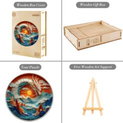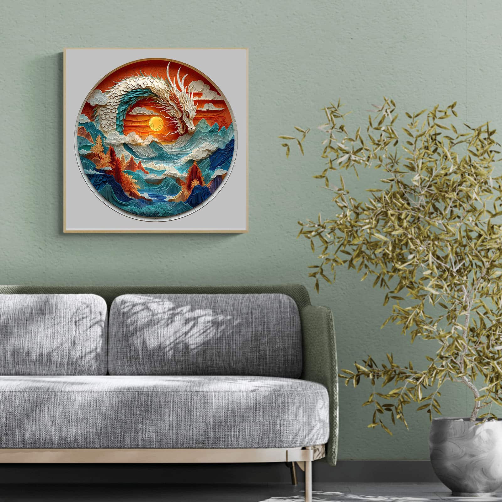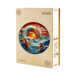 The Colorful Dragon wooden puzzle is a visually captivating, round-shaped puzzle featuring a majestic dragon winding through a vibrant and surreal landscape. With intricate layers of vivid orange, teal, and blue hues, it showcases the dragon soaring above stylized mountains and valleys, with a glowing sun setting in the background. Each piece is precisely crafted to fit seamlessly, allowing the puzzle to double as an exquisite artwork when completed. 3D vision is our new puzzle series which uses unique line and patterns to make flat puzzles look like 3D puzzles
