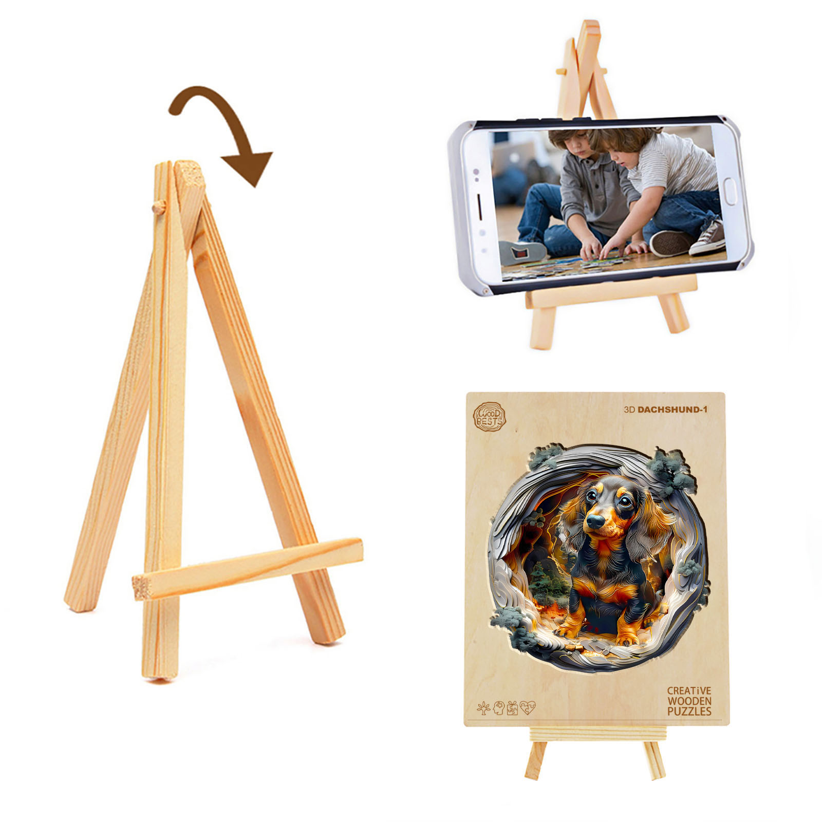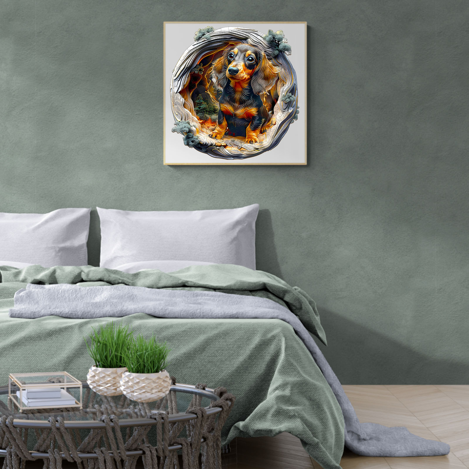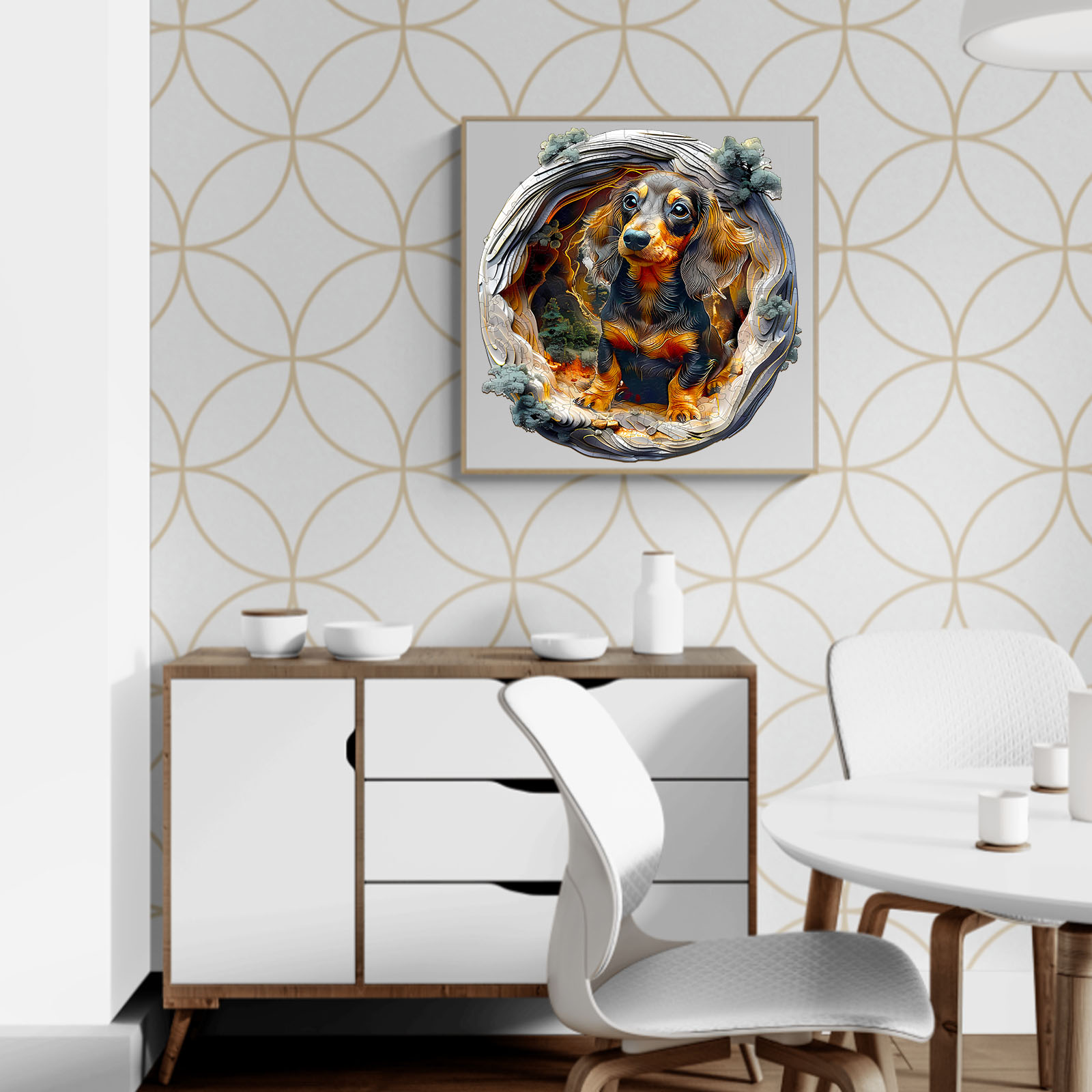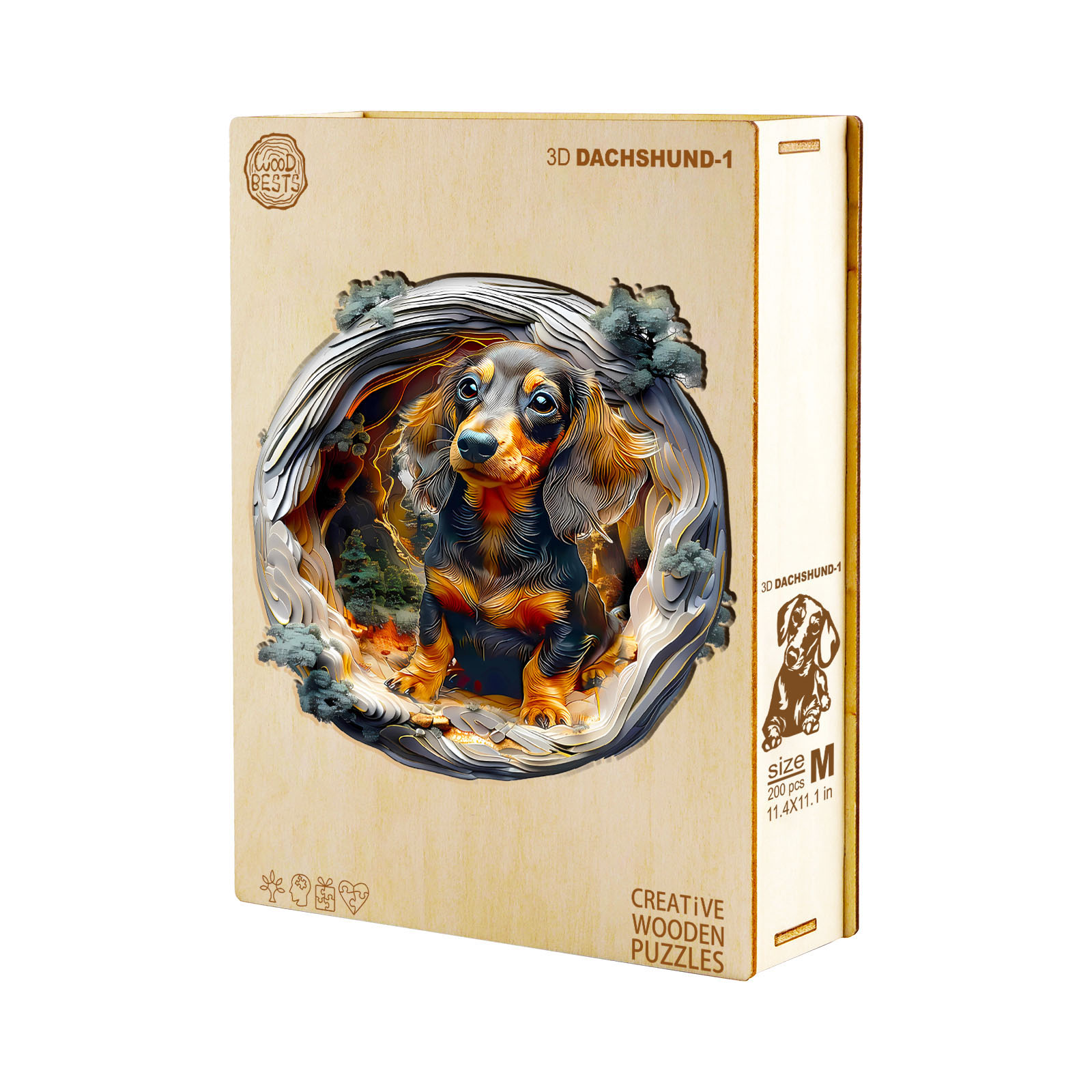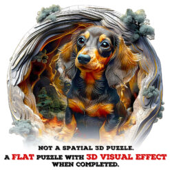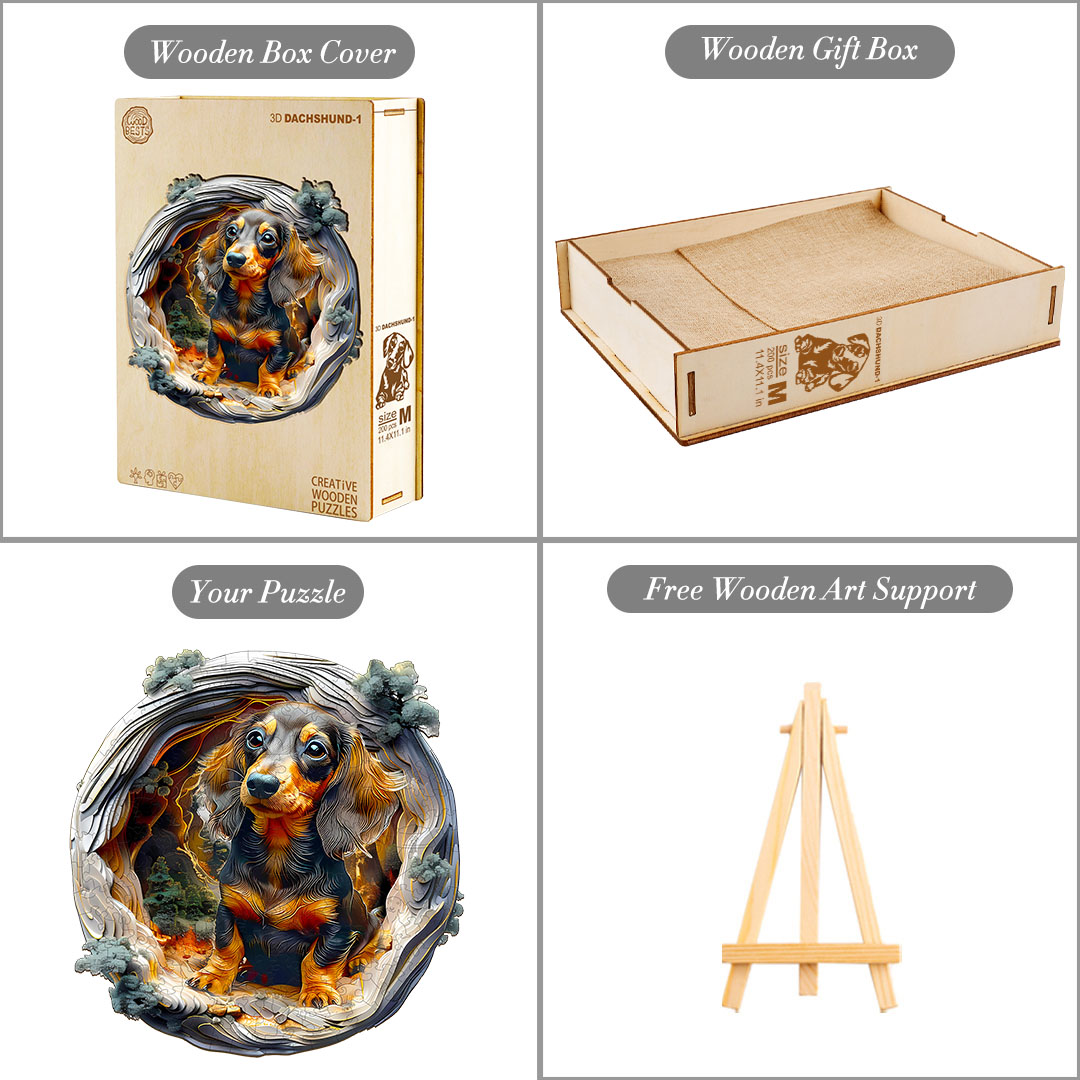 Step into an enchanting woodland scene with this beautifully crafted wooden jigsaw puzzle featuring an adorable dachshund surrounded by layered forest textures. The unique 3D tunnel design gives the illusion of depth, creating a captivating visual journey as you piece it together. Made from premium wood with precision laser-cut pieces, this puzzle offers a satisfying tactile experience and a perfect fit. Ideal for dog lovers, art enthusiasts, and puzzle collectors, it’s more than a pastime—it’s a miniature masterpiece ready to be framed and admired. A charming gift that brings warmth, wonder, and a touch of nature into any home.