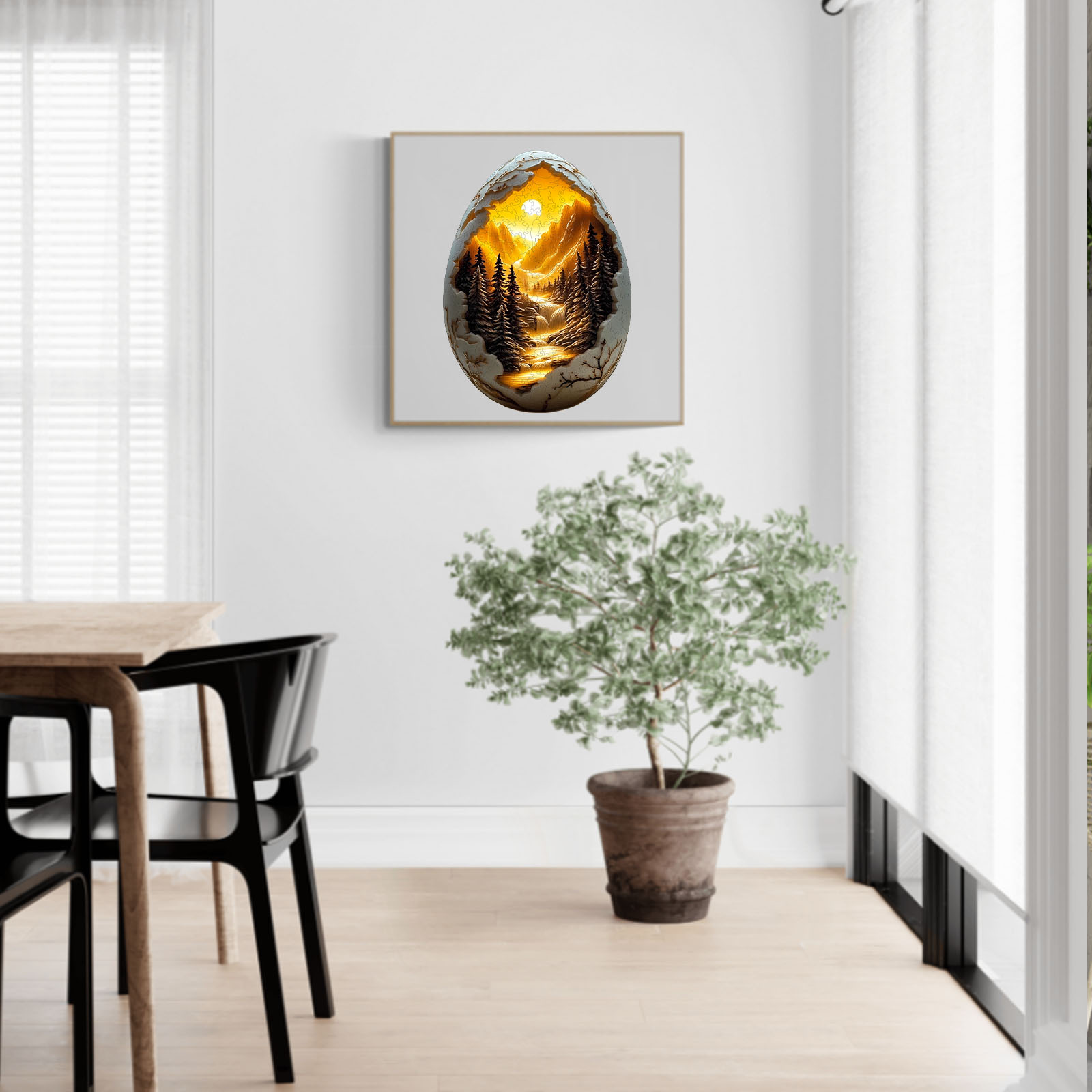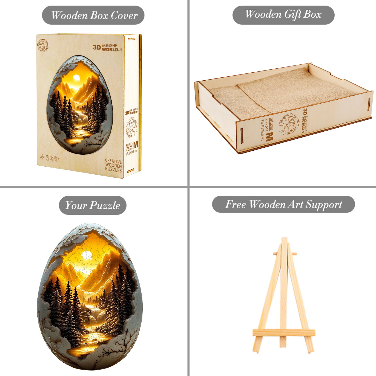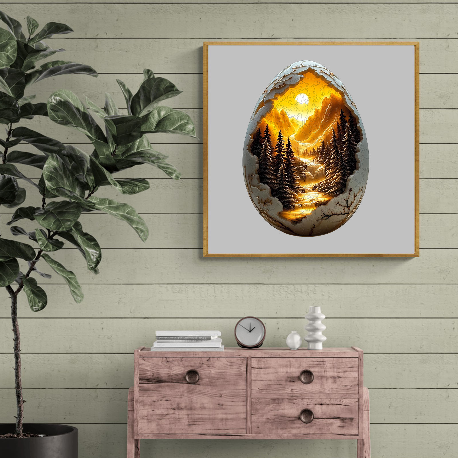 Step into a magical world with Kaayee’s uniquely shaped egg-style wooden puzzle, showcasing a glowing sunset valley nestled within a cracked shell. Towering pine trees, golden waterfalls, and radiant mountains create a breathtaking scene of warmth and wonder—like discovering a hidden world inside nature’s embrace.Crafted from premium wood with intricate laser-cut pieces, this puzzle offers both a creative challenge and a captivating aesthetic. Its one-of-a-kind shape and glowing artwork make it a beautiful keepsake or gift for nature lovers and puzzle enthusiasts alike.