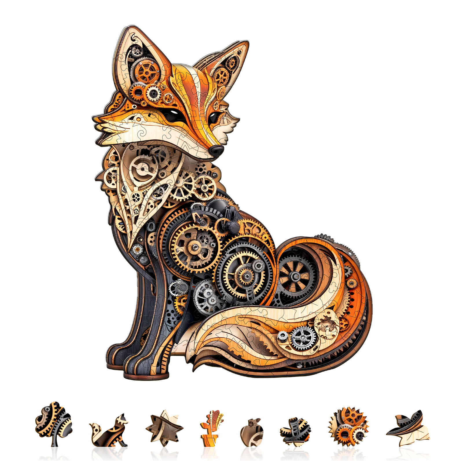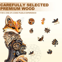 This unique Kaayee wooden jigsaw puzzle features a beautifully crafted fox, presented in a mesmerizing steampunk style. The fox is composed of a complex and intricate network of gears, cogs, and various mechanical parts, blending natural form with industrial aesthetics. The puzzle pieces themselves are intricately cut to form the shape of the fox and its internal workings. The warm colors of the wood and the metallic tones of the gears make this a visually stunning puzzle. It’s a perfect gift for puzzle enthusiasts, fans of steampunk art, or anyone who appreciates creative and detailed design.
