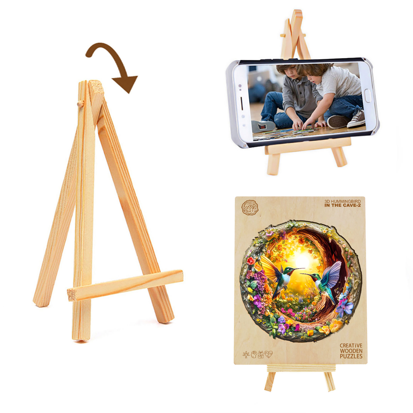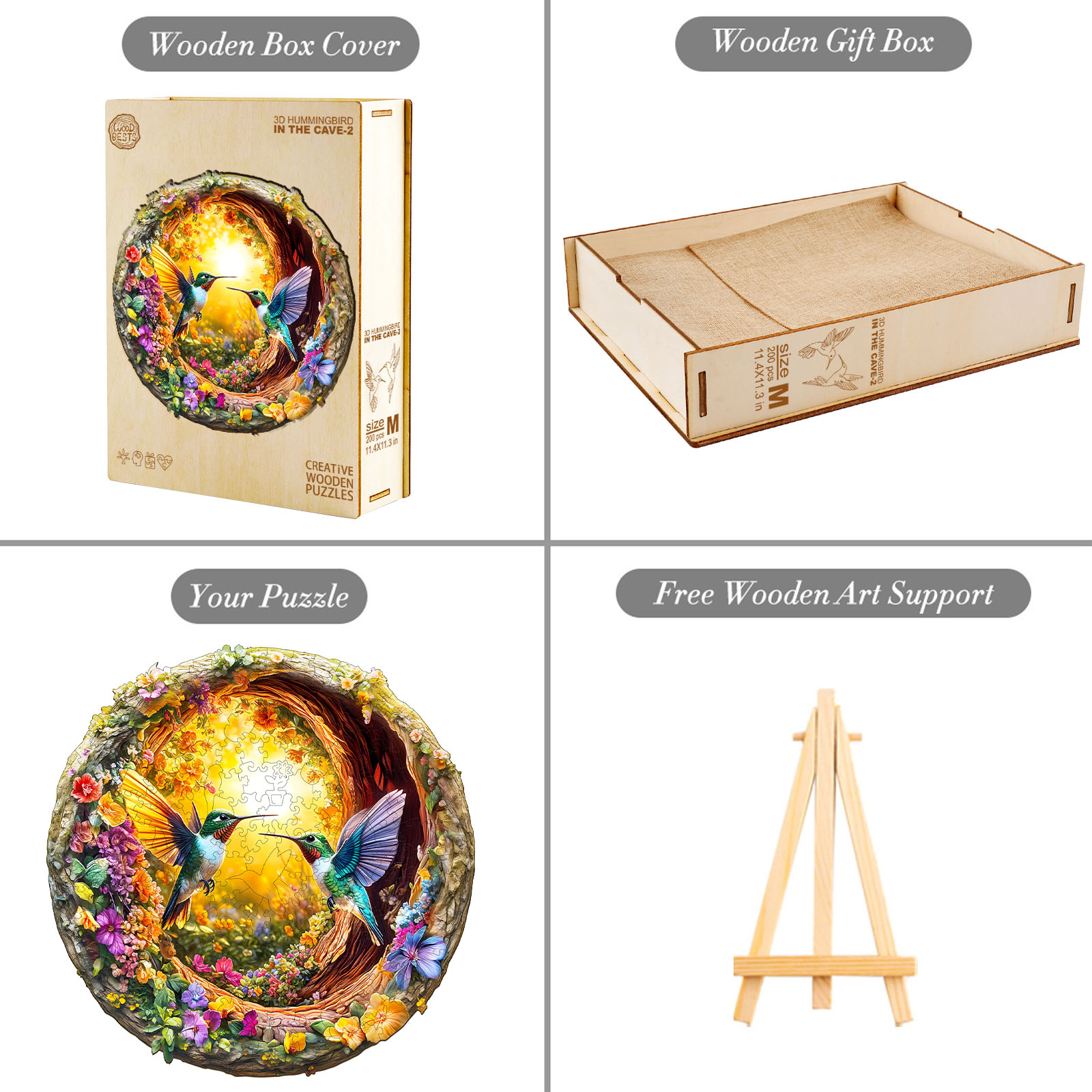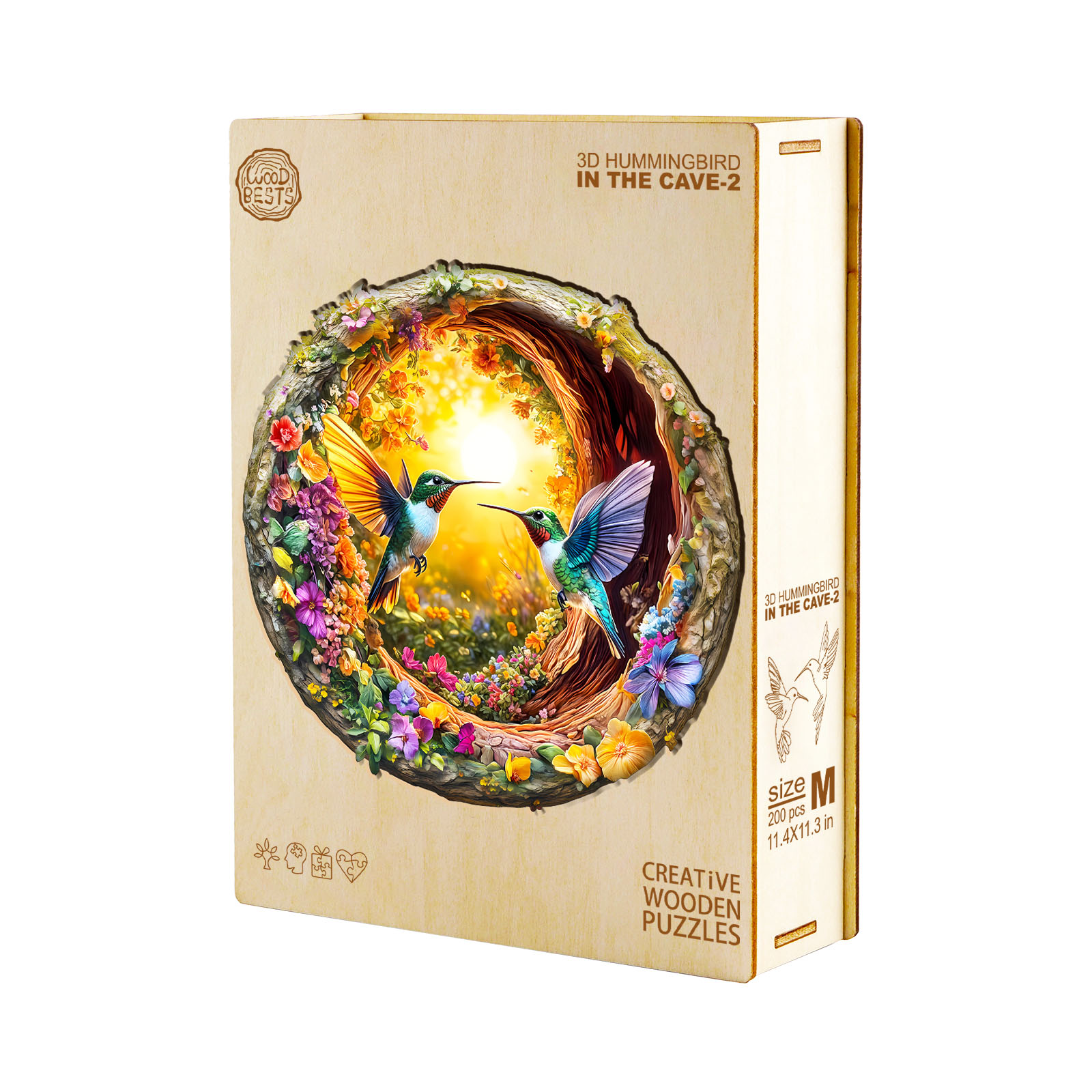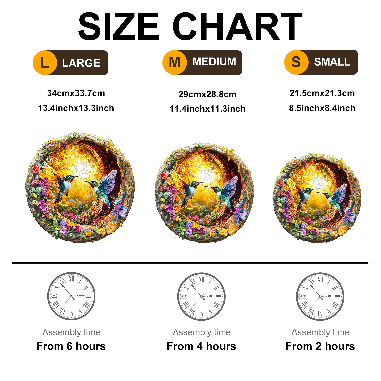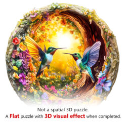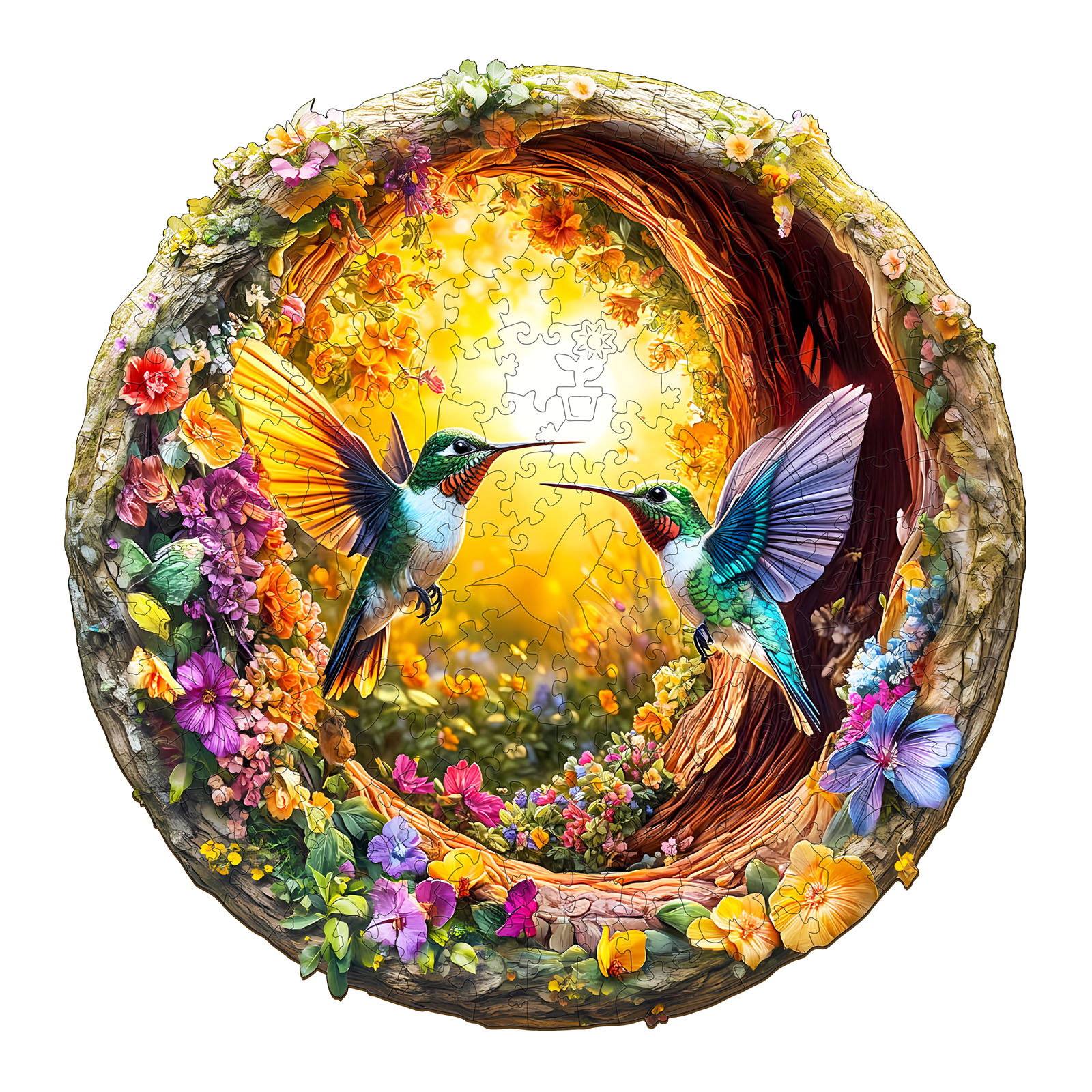 This stunning wooden jigsaw puzzle showcases a magical scene with two vibrant hummingbirds fluttering near a floral-framed tunnel. The circular puzzle, crafted from wood, features intricate pieces that form a lush border of colorful flowers and greenery, leading to a radiant golden background. The detailed craftsmanship and vivid hues of the birds and blossoms make this a delightful and challenging puzzle to assemble.