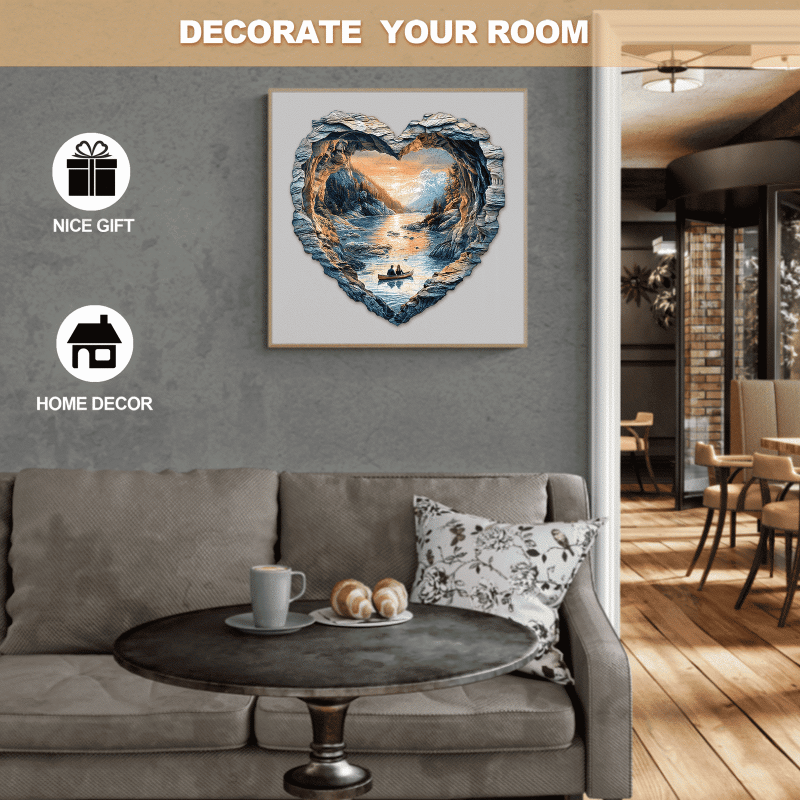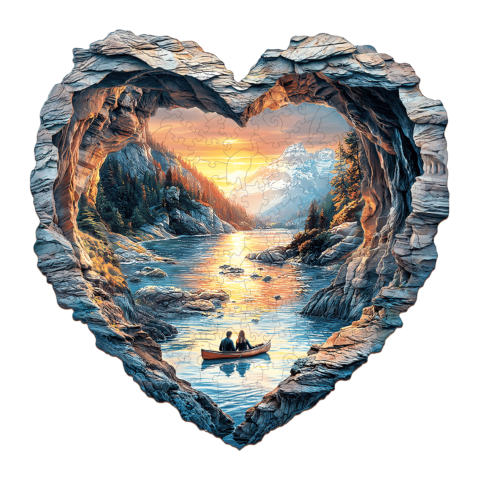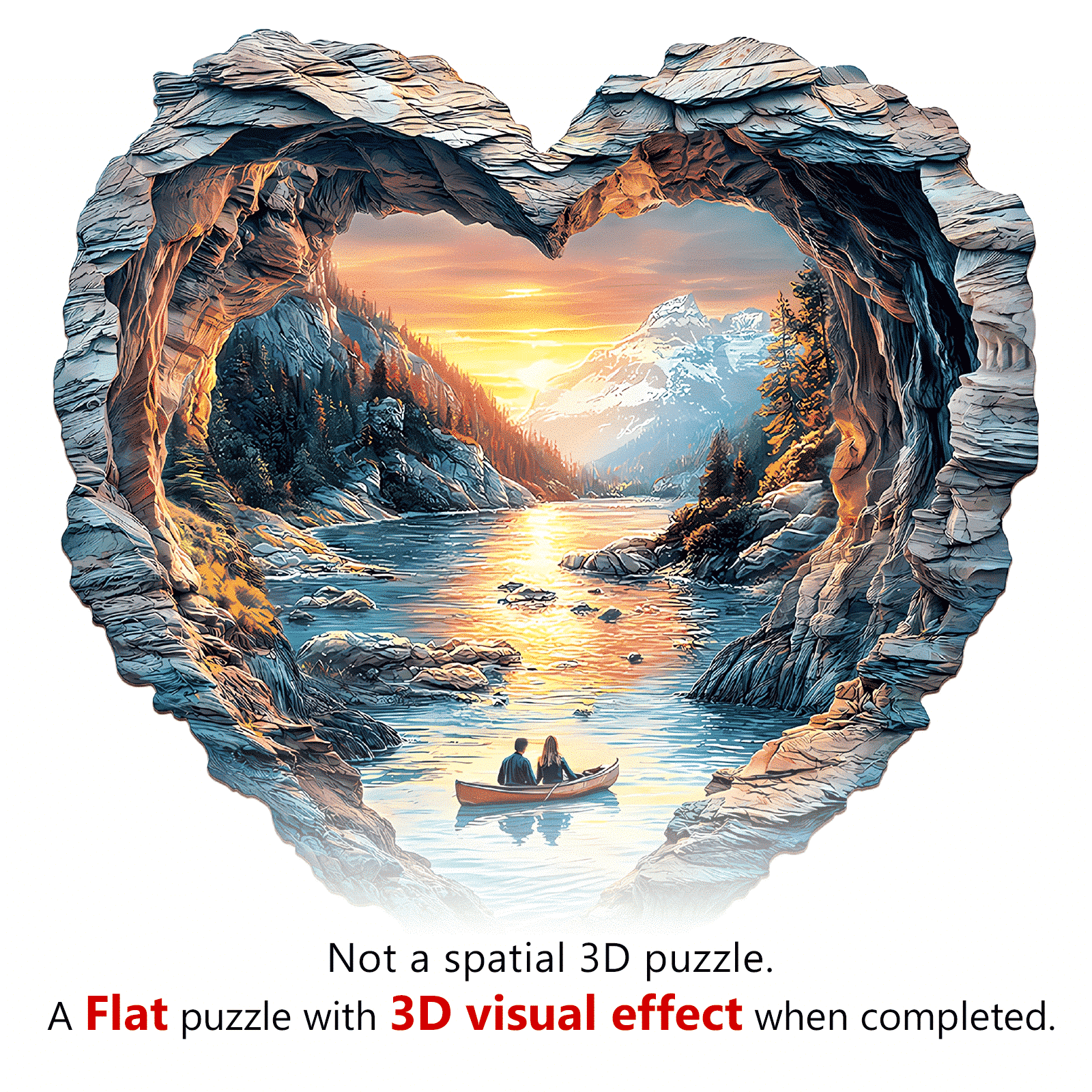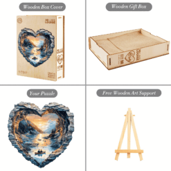 Experience the artistry of puzzling with our luxurious wooden jigsaw puzzle, crafted for enthusiasts who appreciate beauty and precision. This heart-shaped puzzle features a breathtaking 3D effect, showcasing a serene lakeside scene at sunset. Every detail, from the vivid colors to the intricate textures, invites you into a world of tranquility and romance.