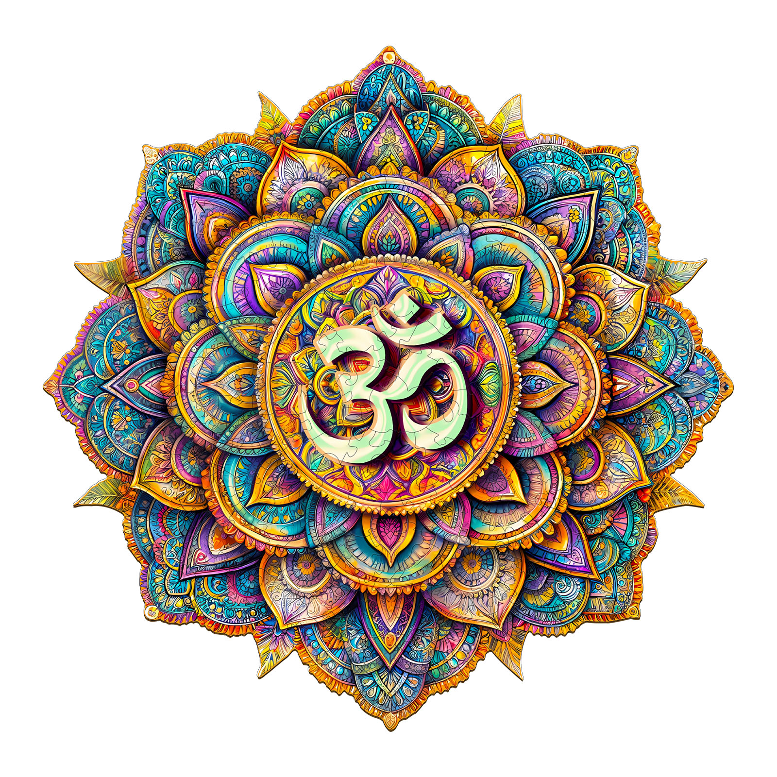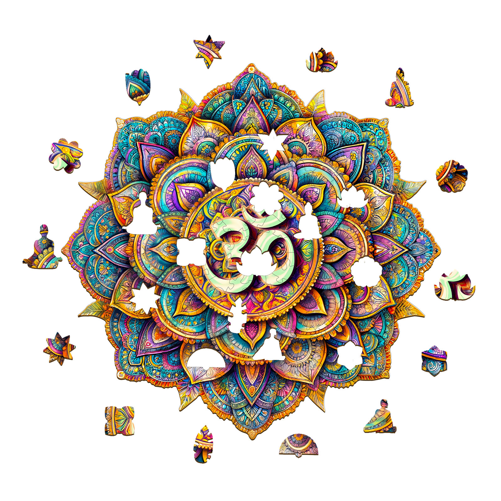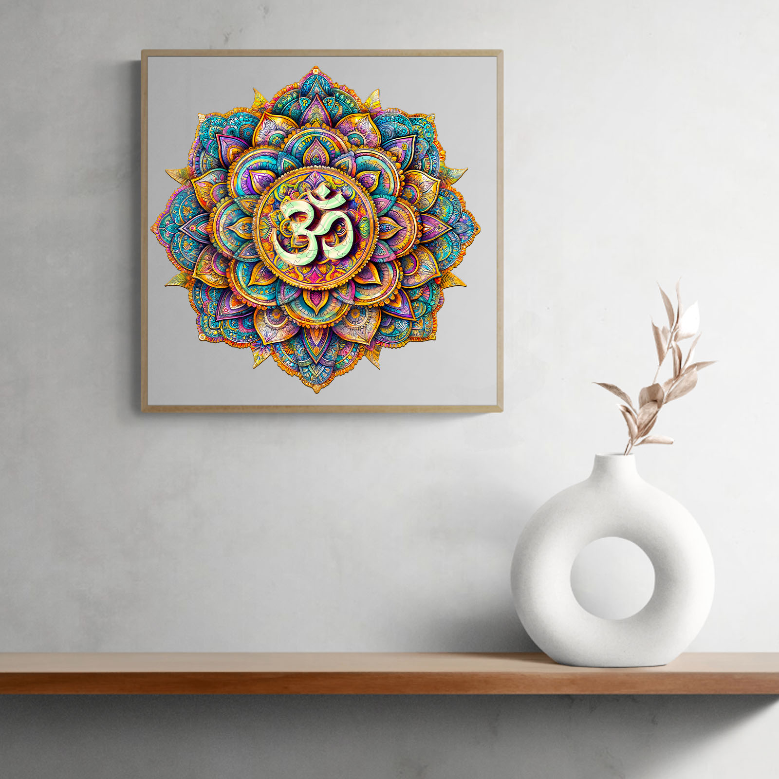 This exquisite wooden puzzle showcases a mesmerizing mandala design centered around the sacred “Om” symbol. Bursting with intricate details and vivid colors—ranging from rich purples and blues to radiant golds and greens—the puzzle radiates a sense of harmony, spirituality, and artistic brilliance. Crafted with precision, each piece fits together to reveal a beautifully symmetrical floral pattern, inspired by traditional Indian art and meditation motifs. Perfect as a mindful activity or a stunning decorative piece, this puzzle invites both peaceful reflection and creative joy.