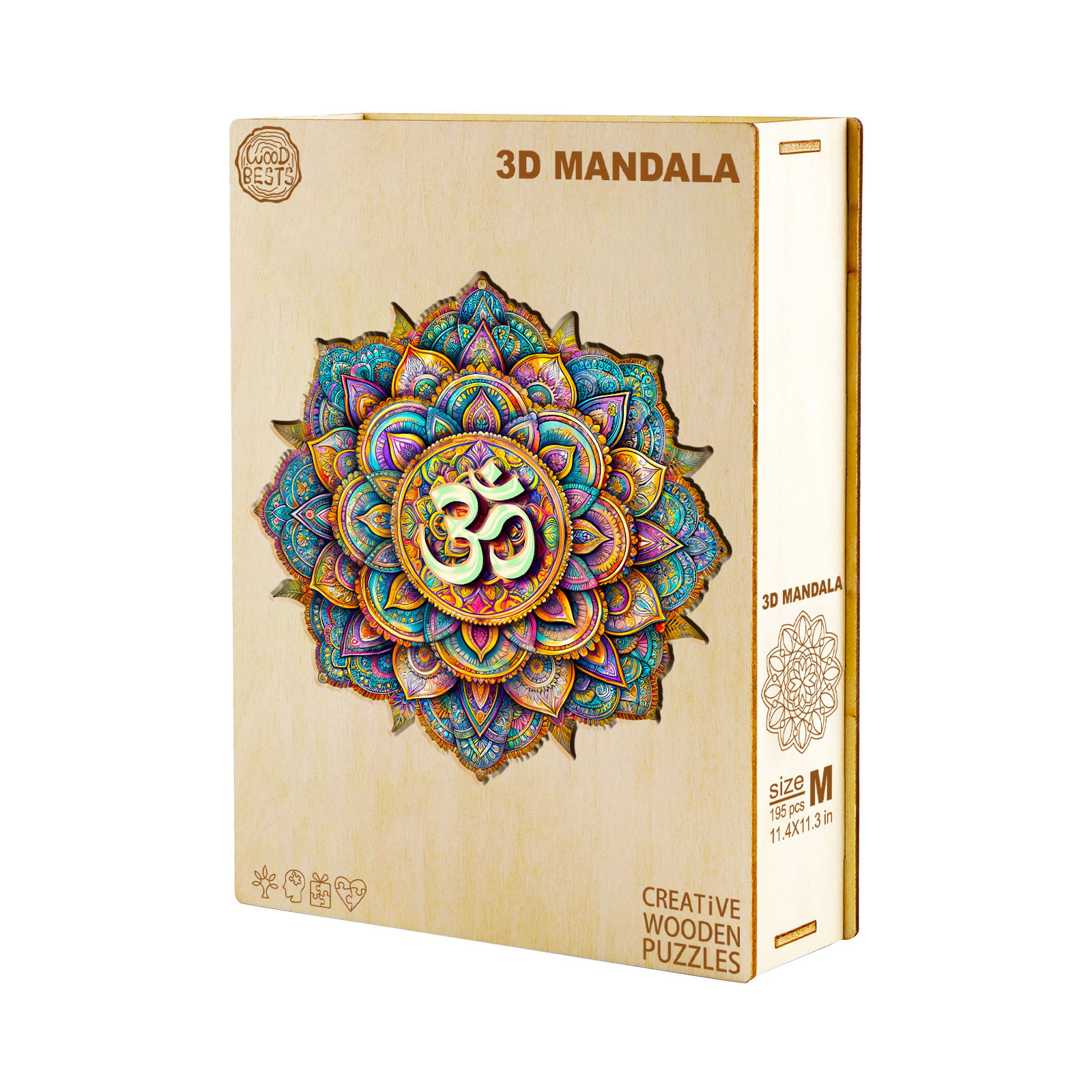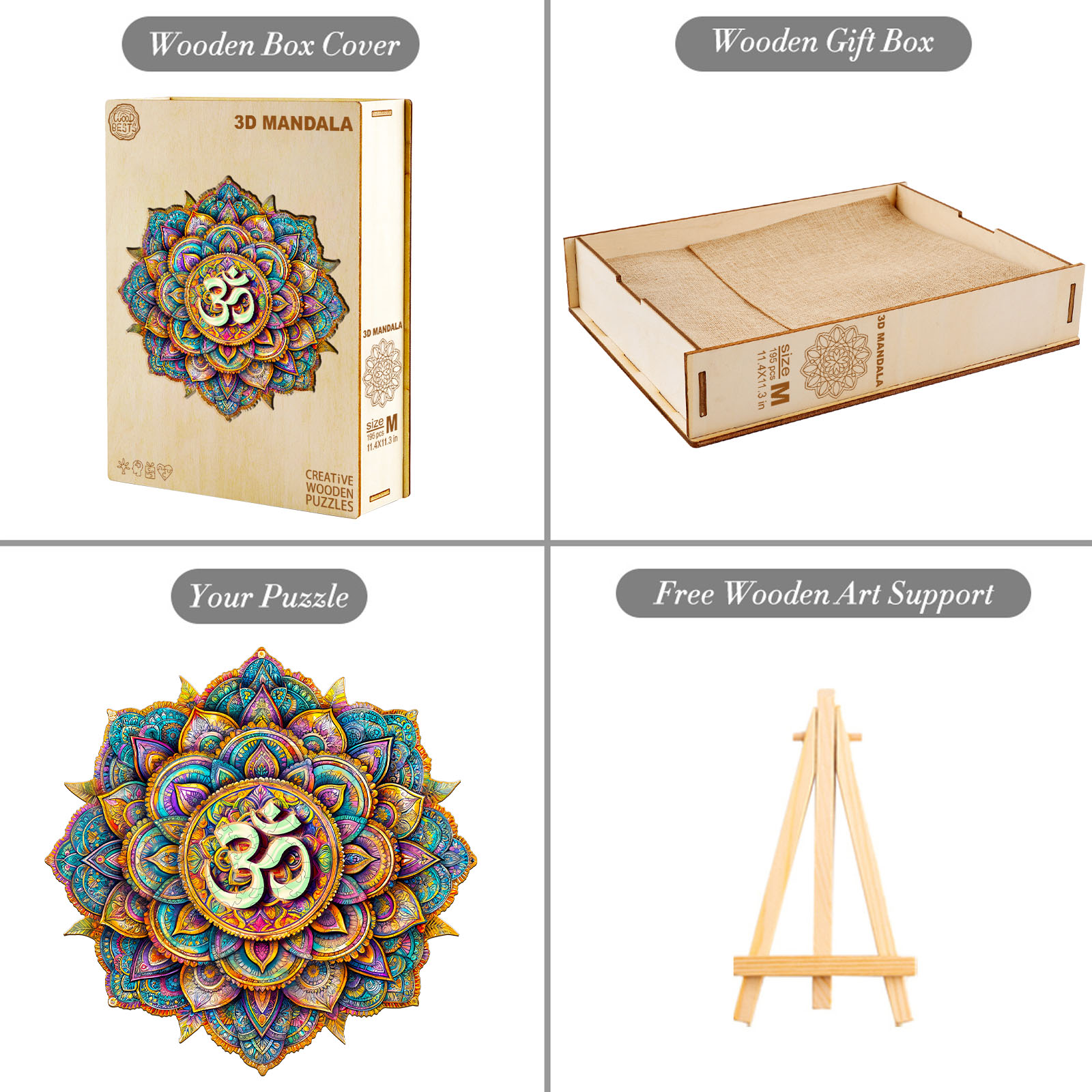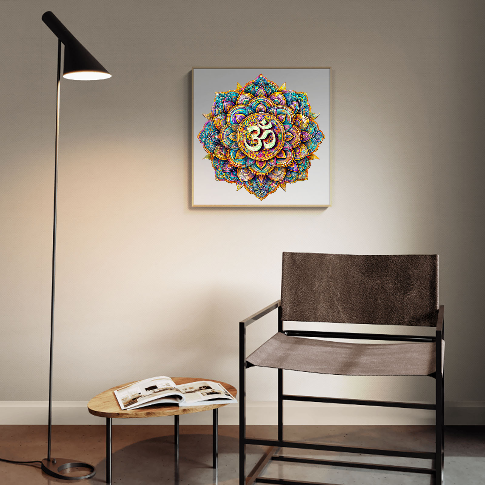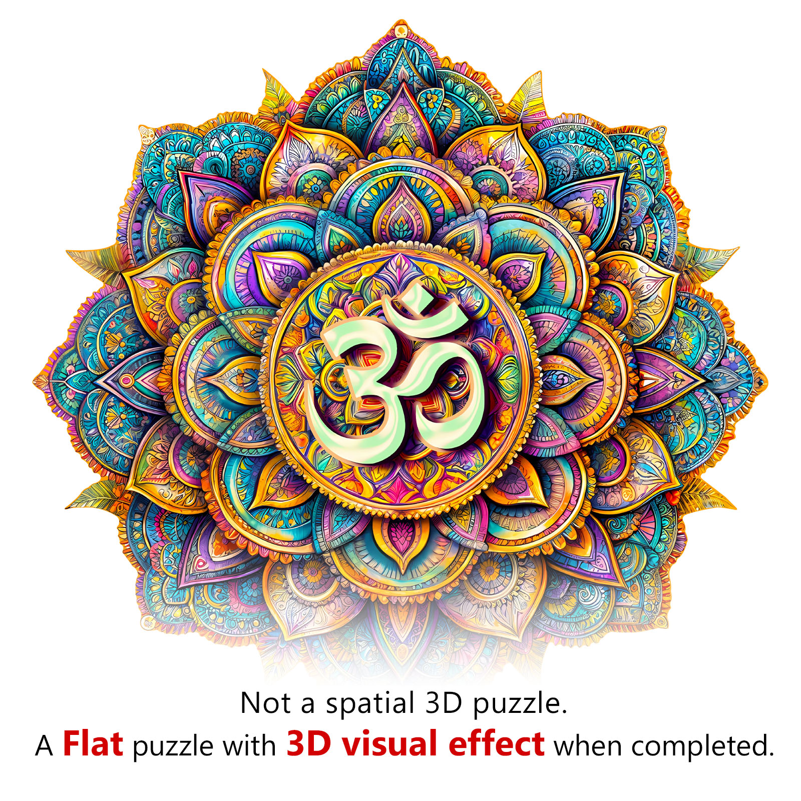 This exquisite wooden puzzle showcases a mesmerizing mandala design centered around the sacred “Om” symbol. Bursting with intricate details and vivid colors—ranging from rich purples and blues to radiant golds and greens—the puzzle radiates a sense of harmony, spirituality, and artistic brilliance. Crafted with precision, each piece fits together to reveal a beautifully symmetrical floral pattern, inspired by traditional Indian art and meditation motifs. Perfect as a mindful activity or a stunning decorative piece, this puzzle invites both peaceful reflection and creative joy.