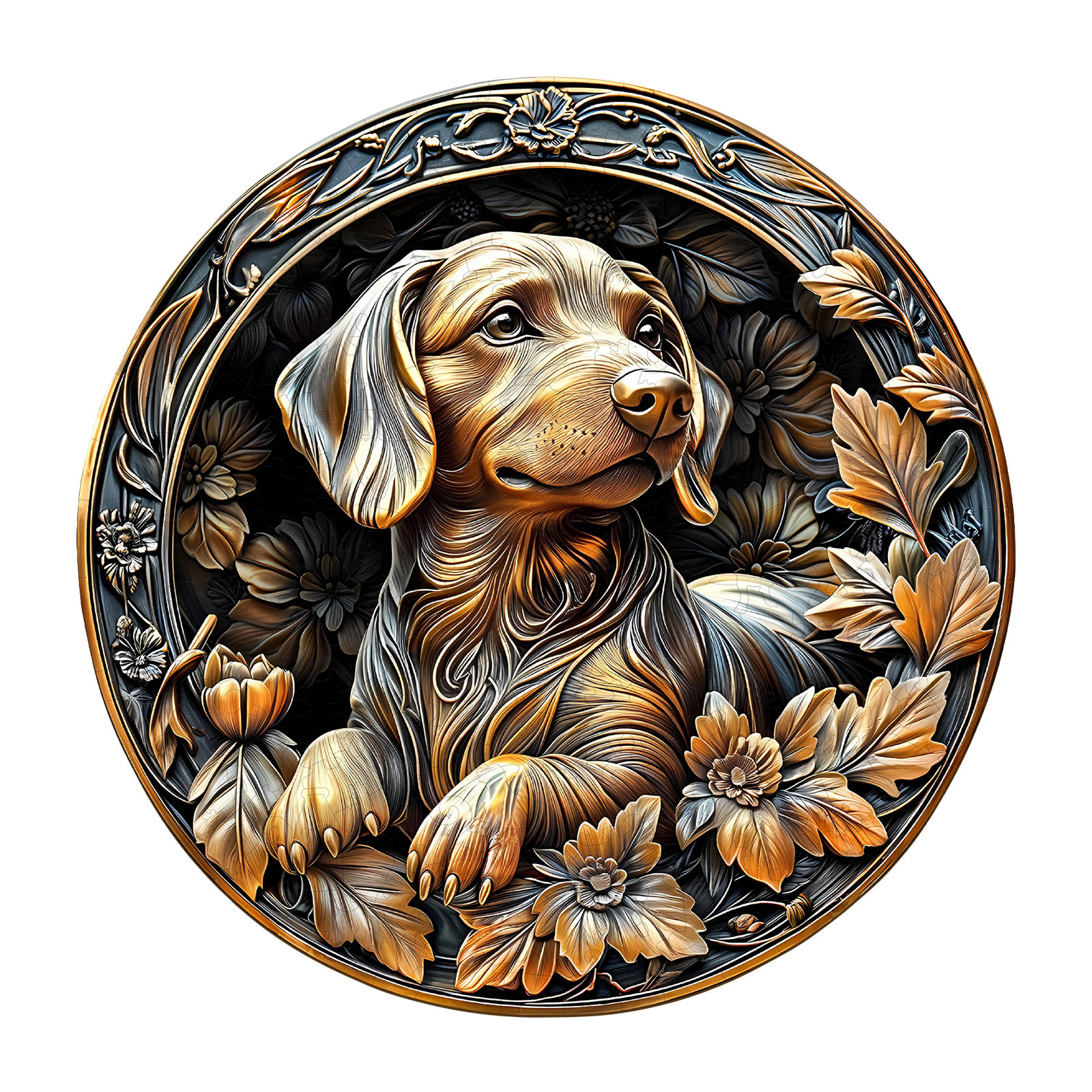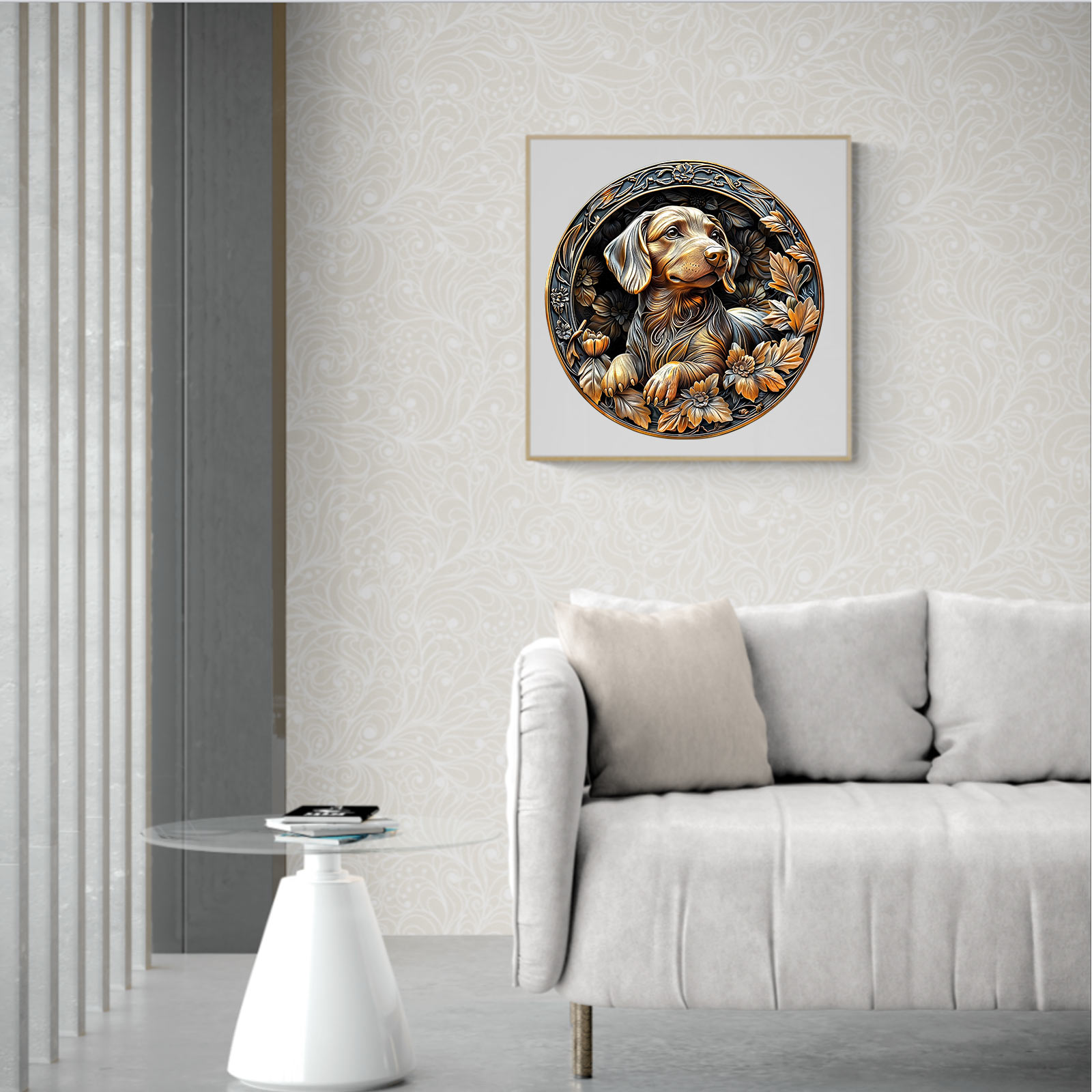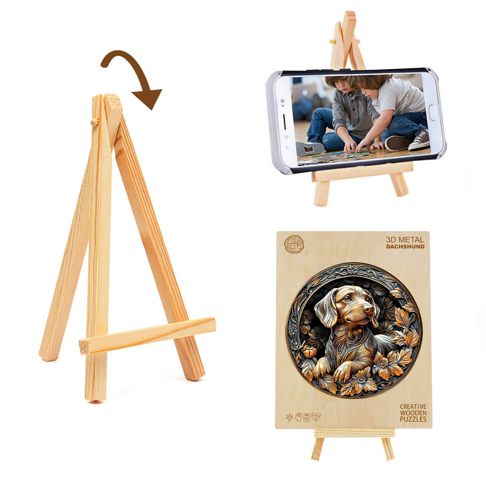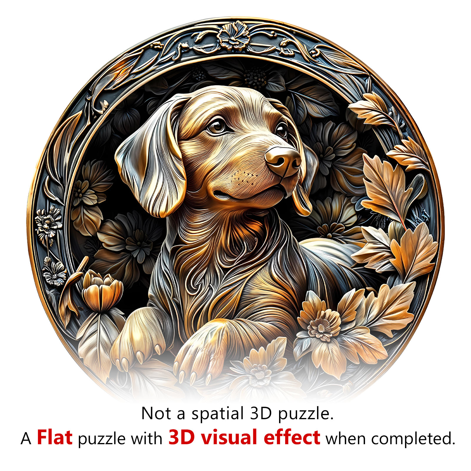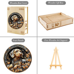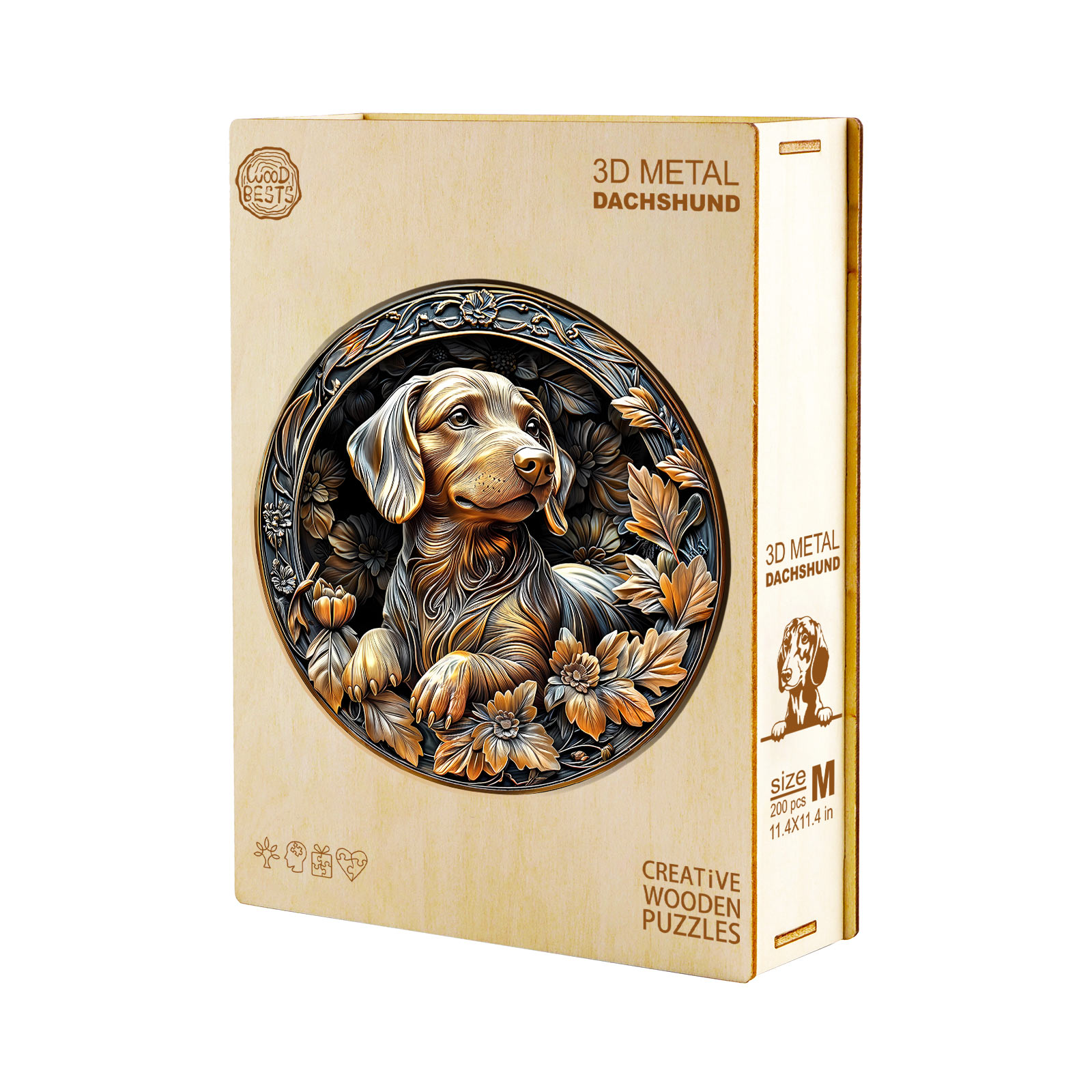 This exquisite wooden jigsaw puzzle features a detailed depiction of a dachshund surrounded by an ornate frame of intricately carved flowers and leaves. The puzzle showcases the dog’s expressive face and textured fur, complemented by the rich, layered floral design, making it a challenging and visually stunning piece for puzzle enthusiasts.