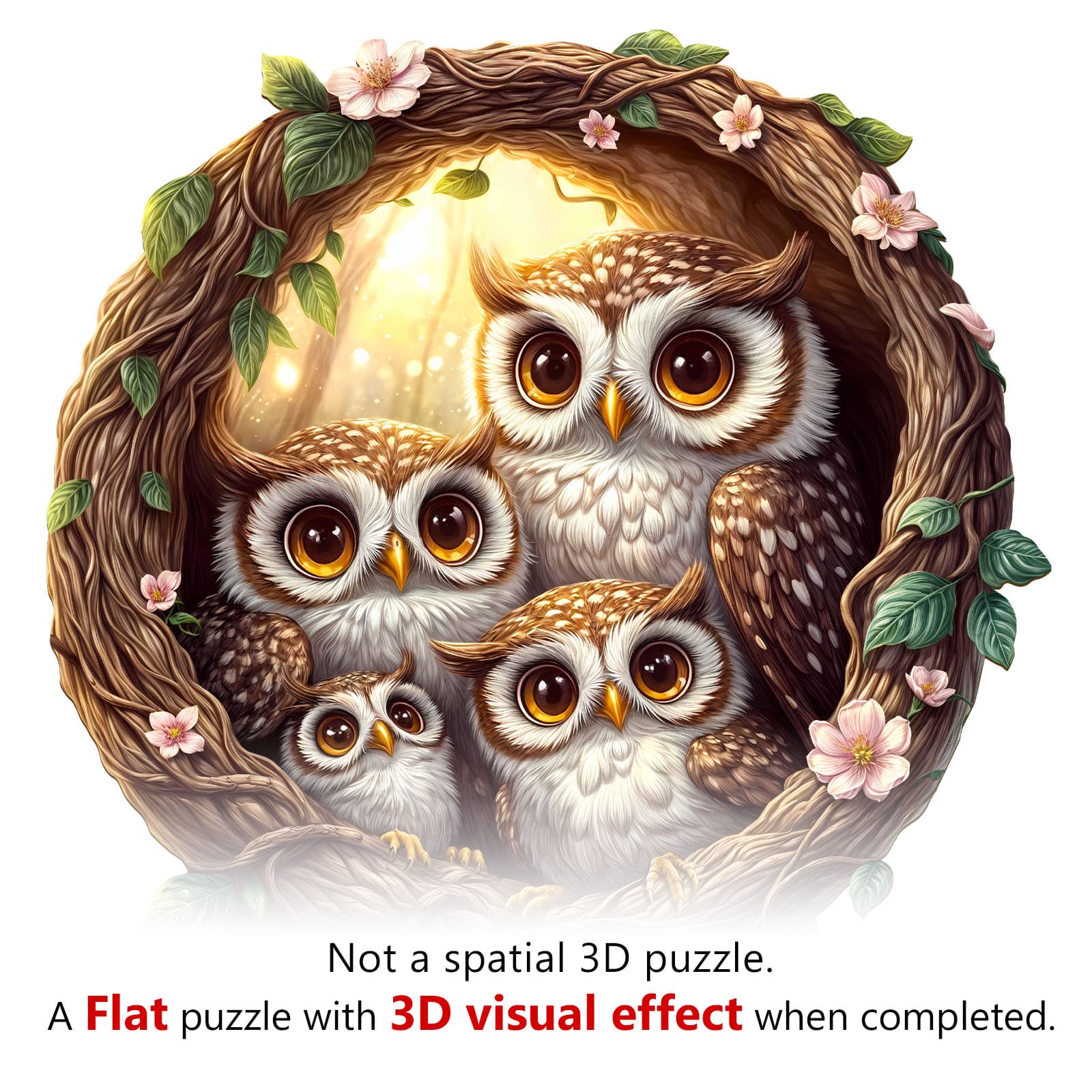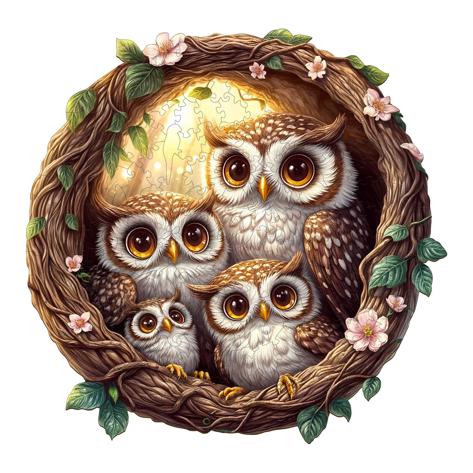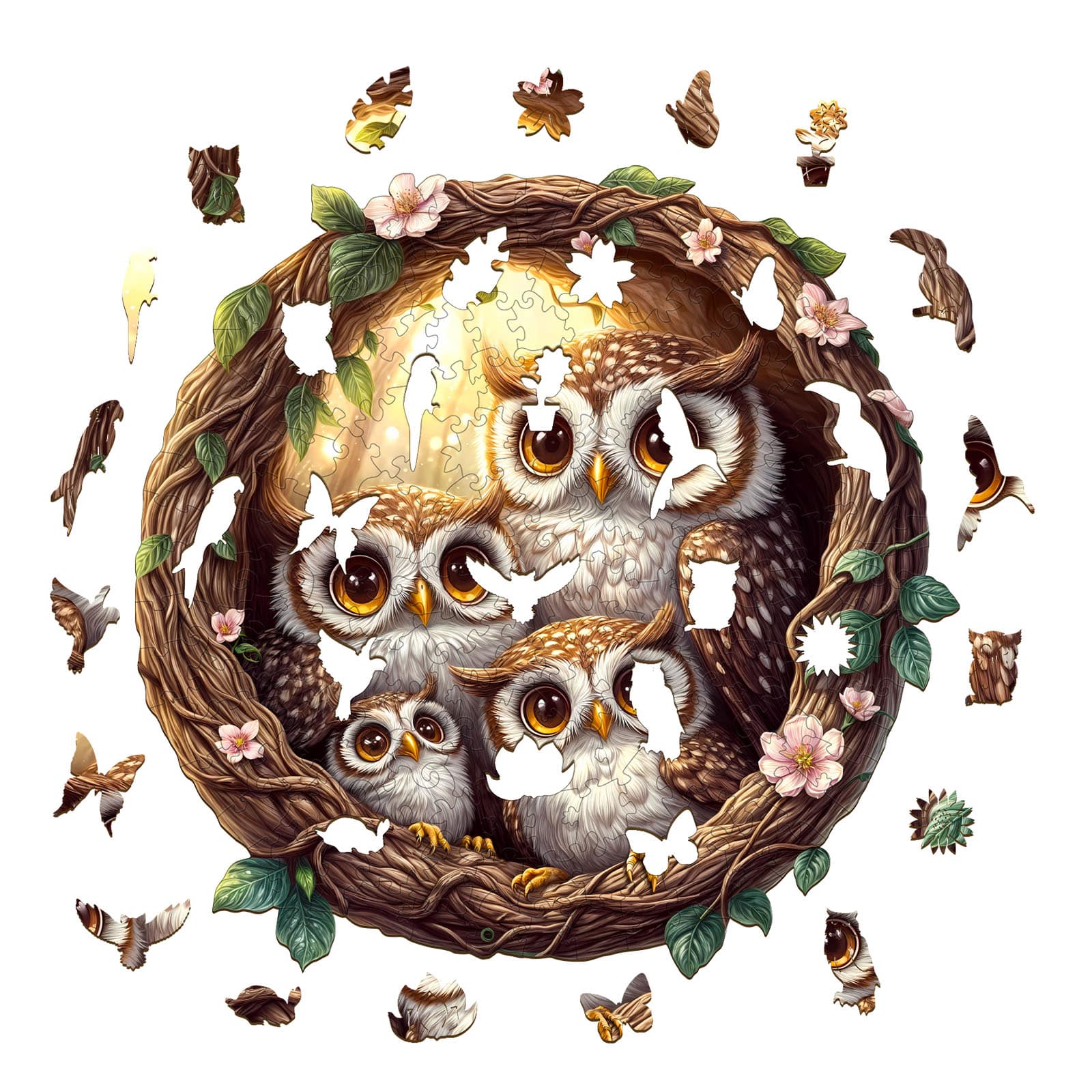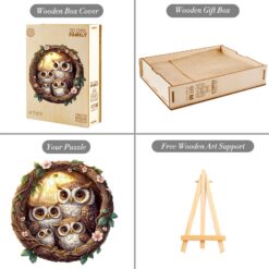 Discover the joy of puzzling with our Premium Wooden Jigsaw Puzzle, featuring an enchanting illustration of an owl family nestled within a beautifully crafted vine wreath adorned with delicate pink blossoms and lush green leaves.Bring home the charm of the forest and enjoy hours of relaxing, mindful fun with this delightful owl family puzzle. Perfect for display once completed!