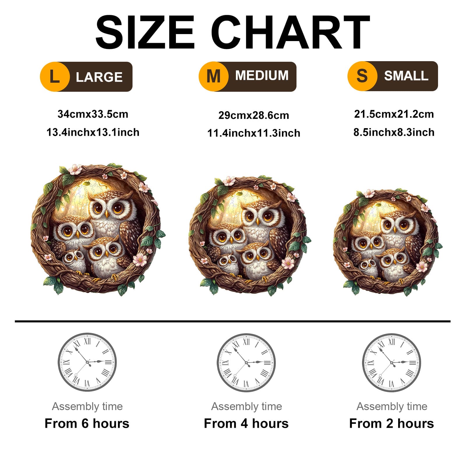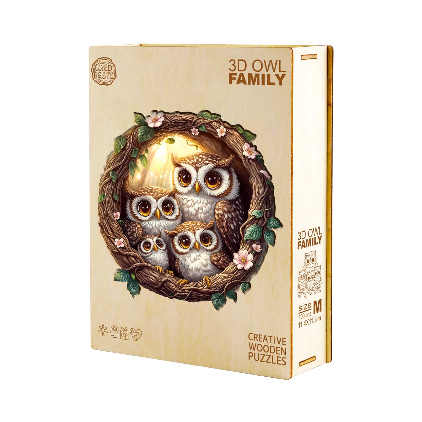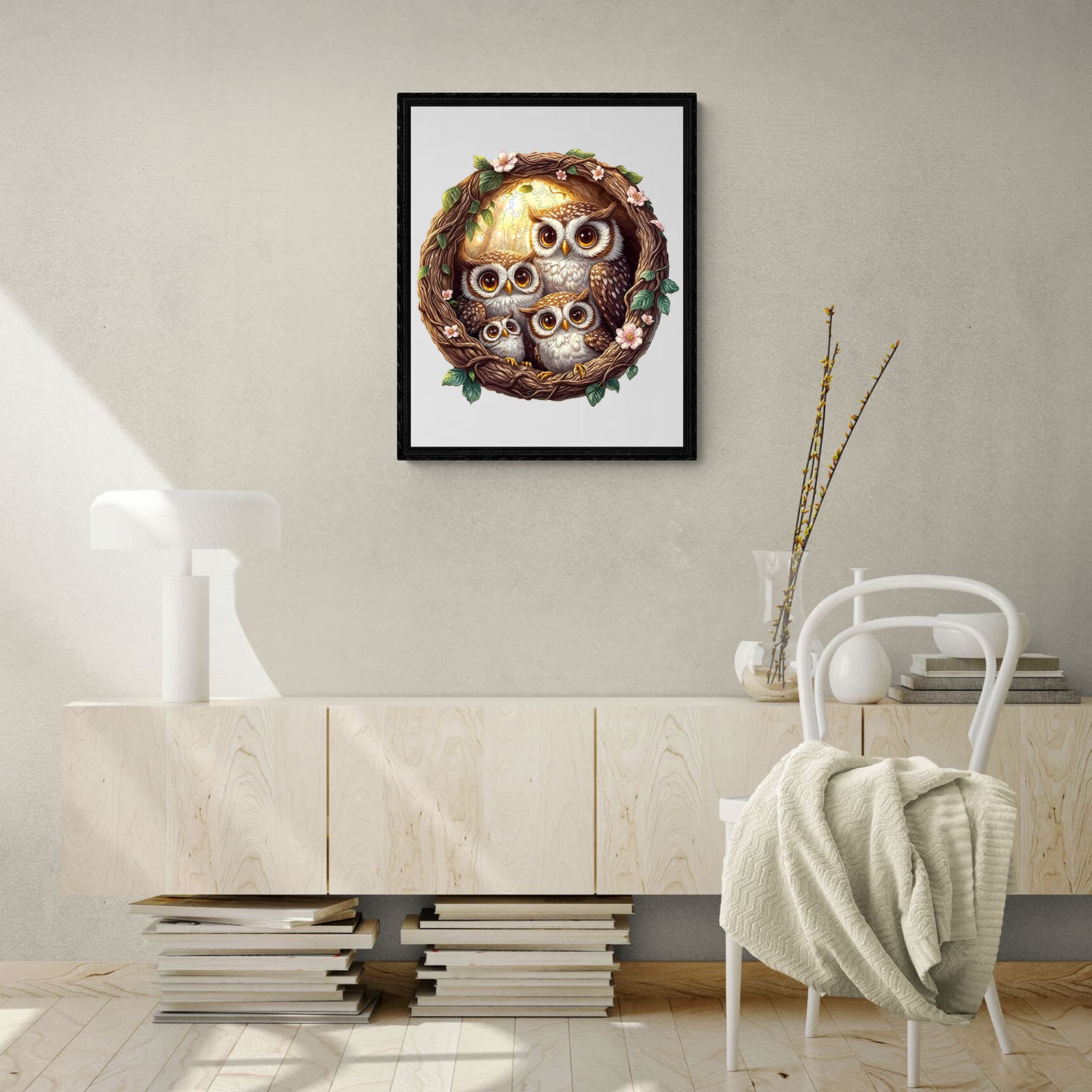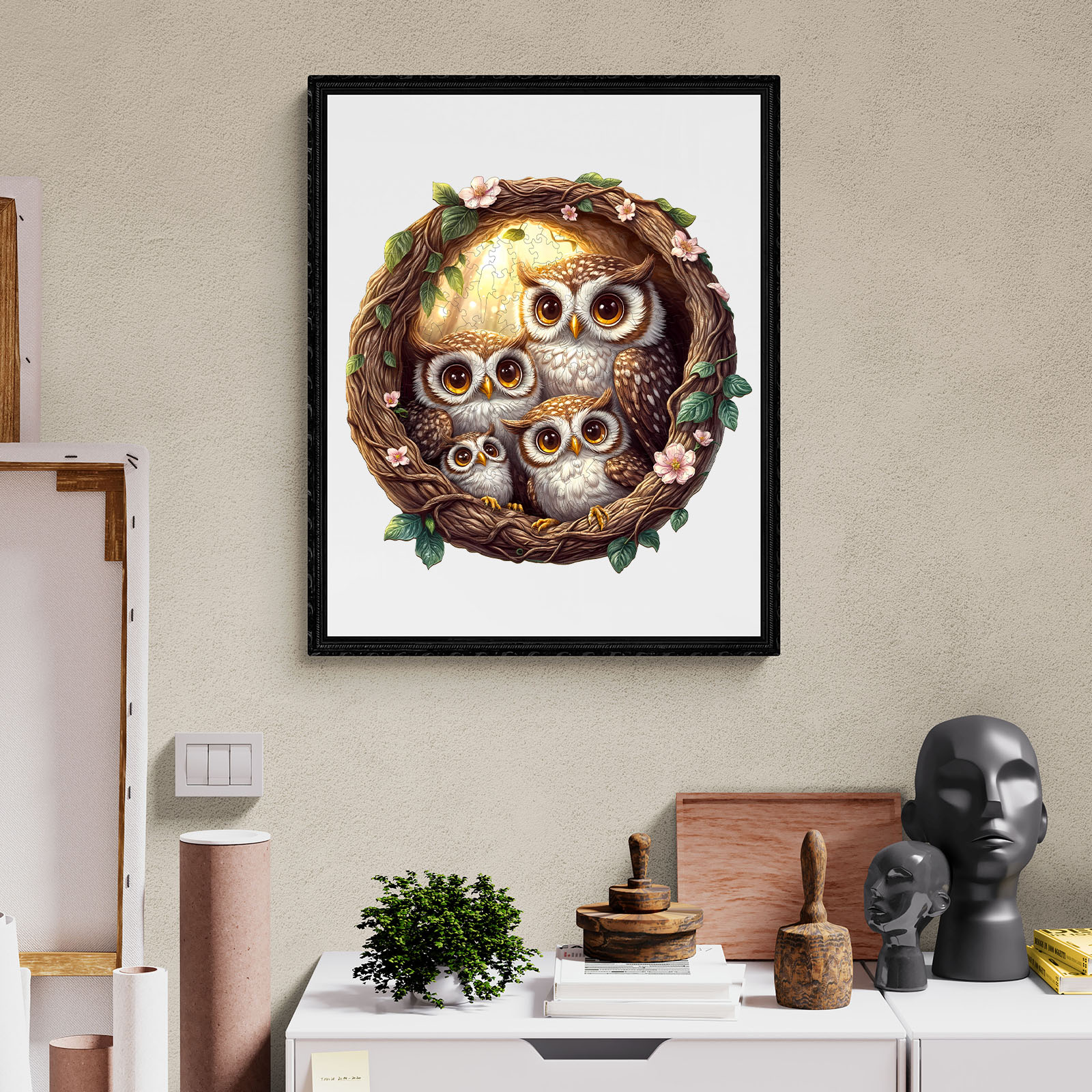 Discover the joy of puzzling with our Premium Wooden Jigsaw Puzzle, featuring an enchanting illustration of an owl family nestled within a beautifully crafted vine wreath adorned with delicate pink blossoms and lush green leaves.Bring home the charm of the forest and enjoy hours of relaxing, mindful fun with this delightful owl family puzzle. Perfect for display once completed!