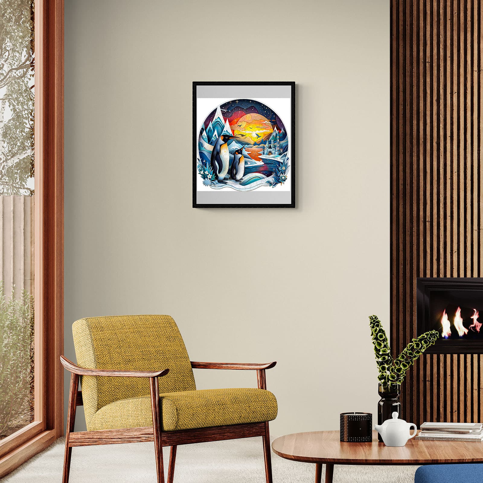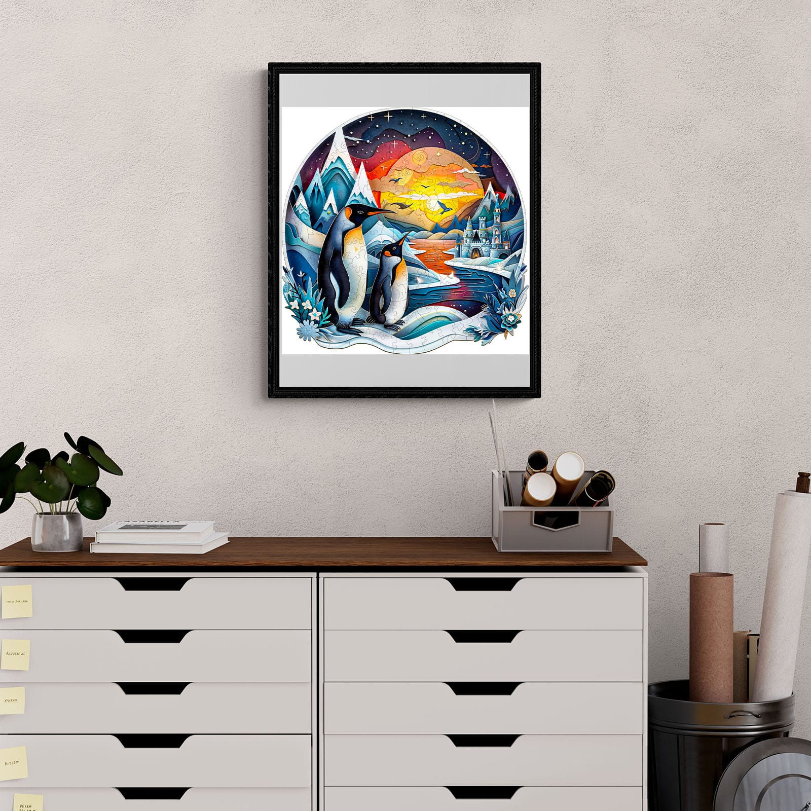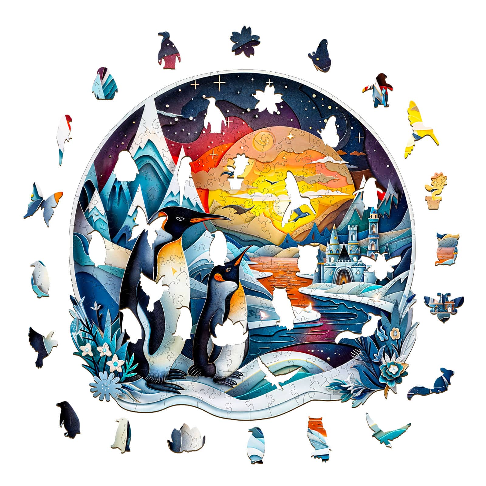 This exquisite wooden jigsaw puzzle showcases a breathtaking Arctic scene featuring a family of emperor penguins against a stunning sunset sky. The vibrant colors of the icy mountains, glowing auroras, and a majestic ice castle create a magical, fairytale-like atmosphere. Crafted from high-quality, eco-friendly wood, each uniquely shaped piece fits seamlessly, providing a rewarding and immersive puzzle experience. Perfect for nature lovers, puzzle enthusiasts, and anyone who enjoys artistic and challenging puzzles. Once completed, it becomes a captivating decorative piece, adding a touch of winter wonder to any space.