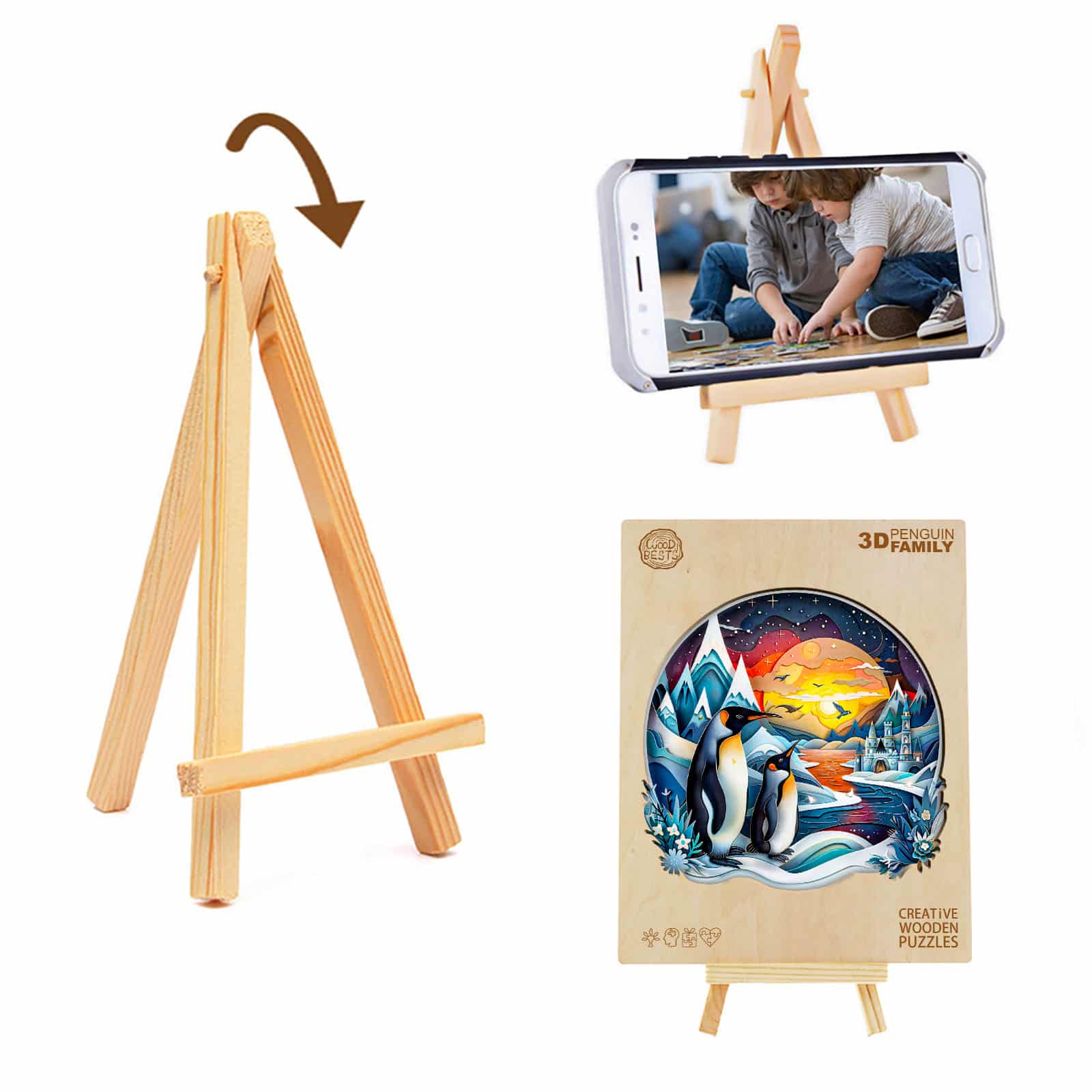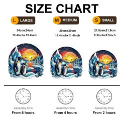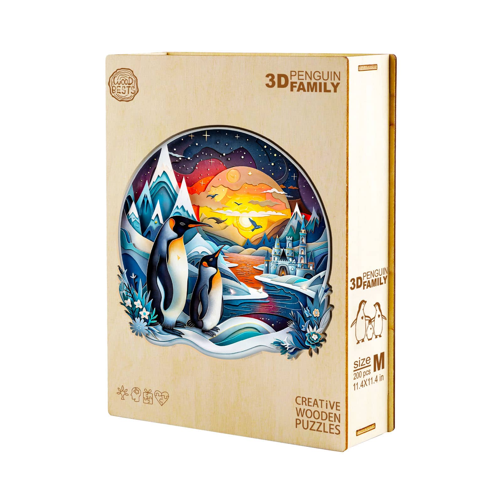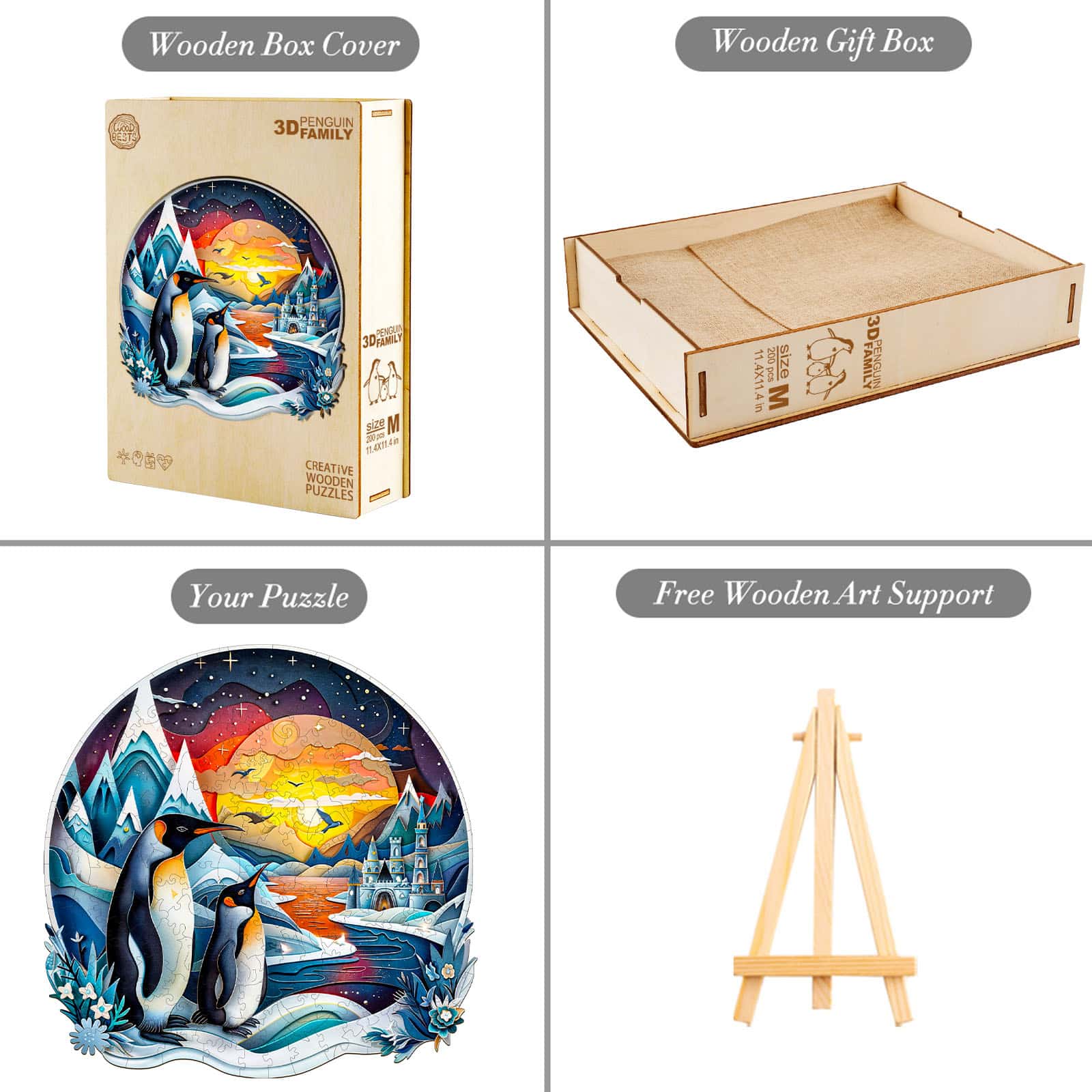 This exquisite wooden jigsaw puzzle showcases a breathtaking Arctic scene featuring a family of emperor penguins against a stunning sunset sky. The vibrant colors of the icy mountains, glowing auroras, and a majestic ice castle create a magical, fairytale-like atmosphere. Crafted from high-quality, eco-friendly wood, each uniquely shaped piece fits seamlessly, providing a rewarding and immersive puzzle experience. Perfect for nature lovers, puzzle enthusiasts, and anyone who enjoys artistic and challenging puzzles. Once completed, it becomes a captivating decorative piece, adding a touch of winter wonder to any space.