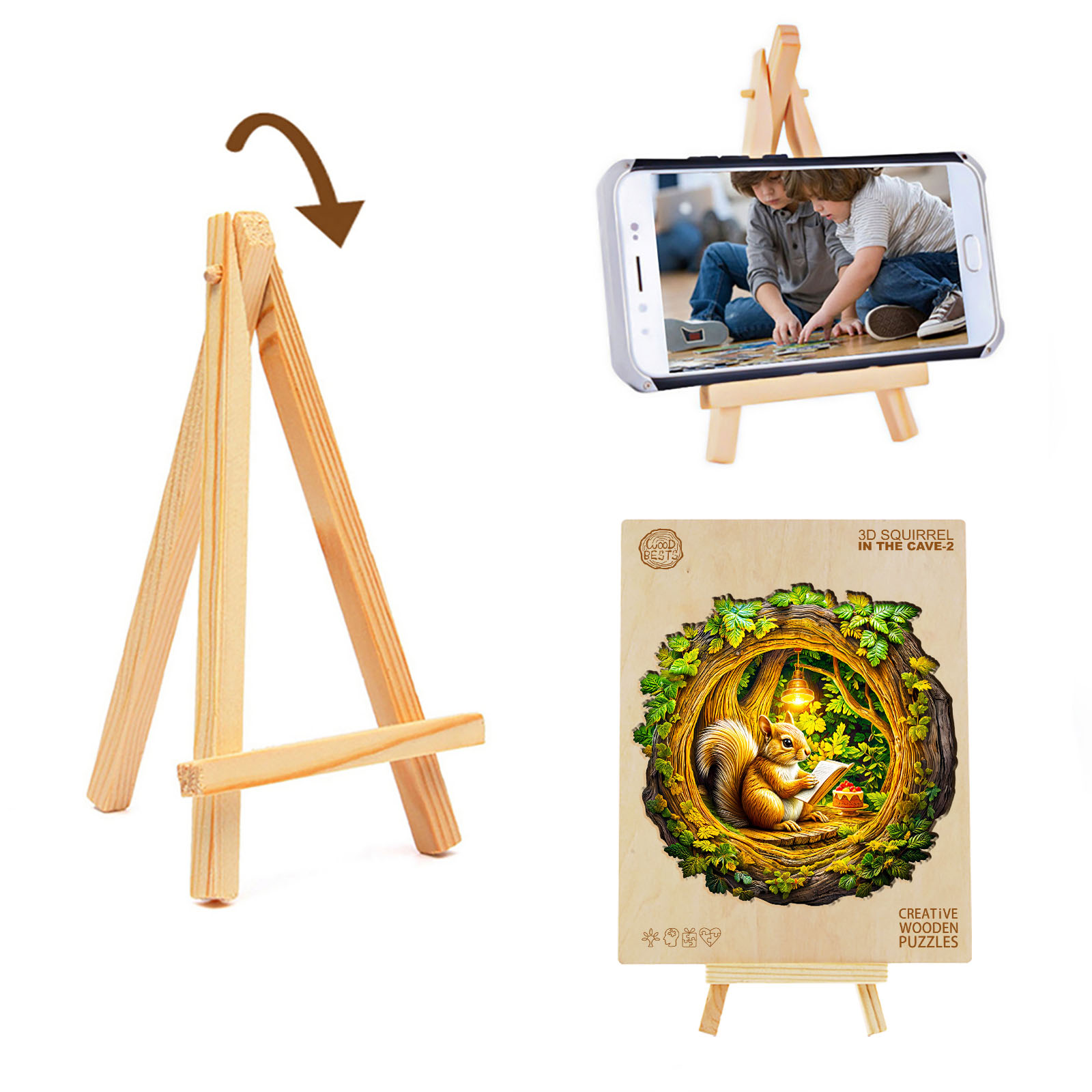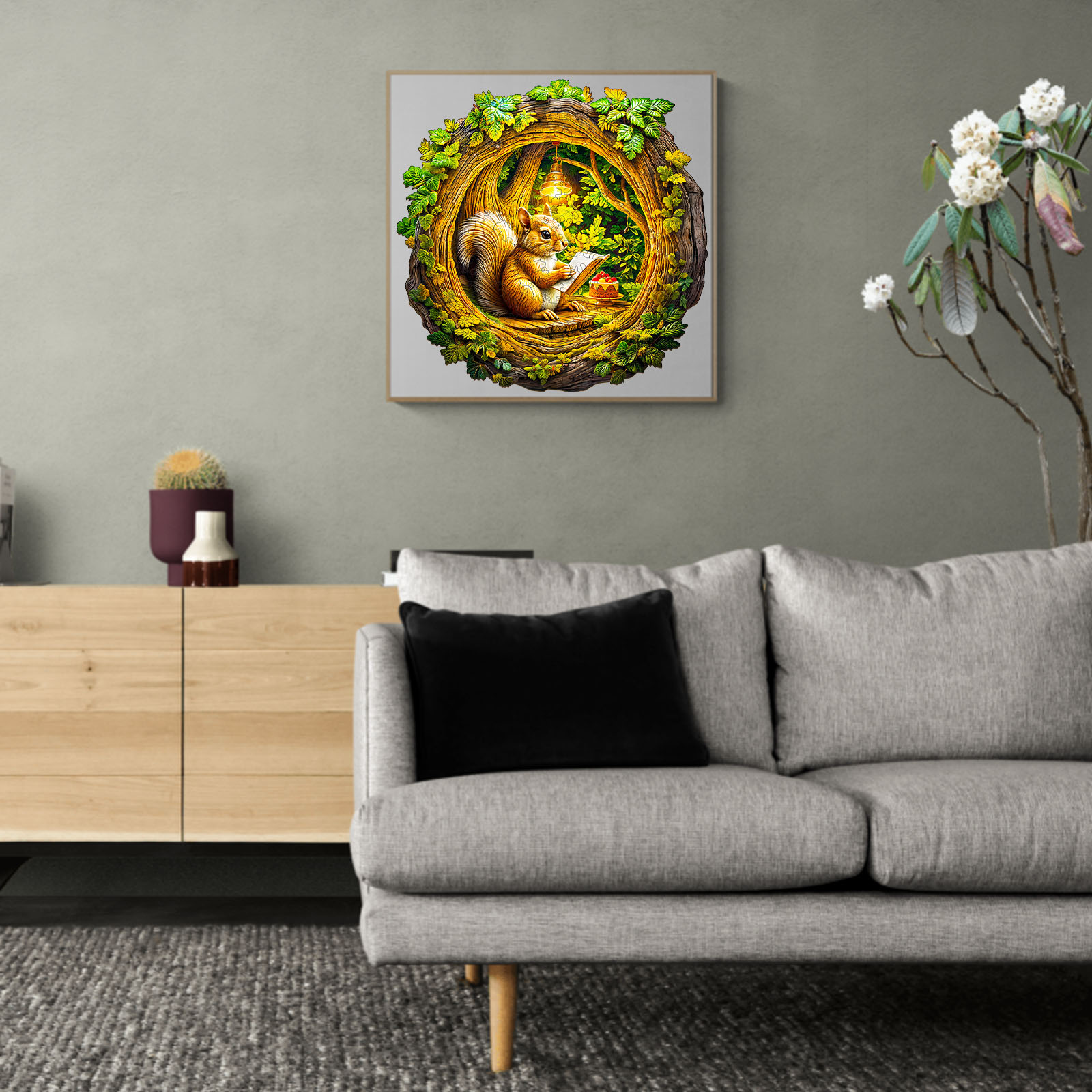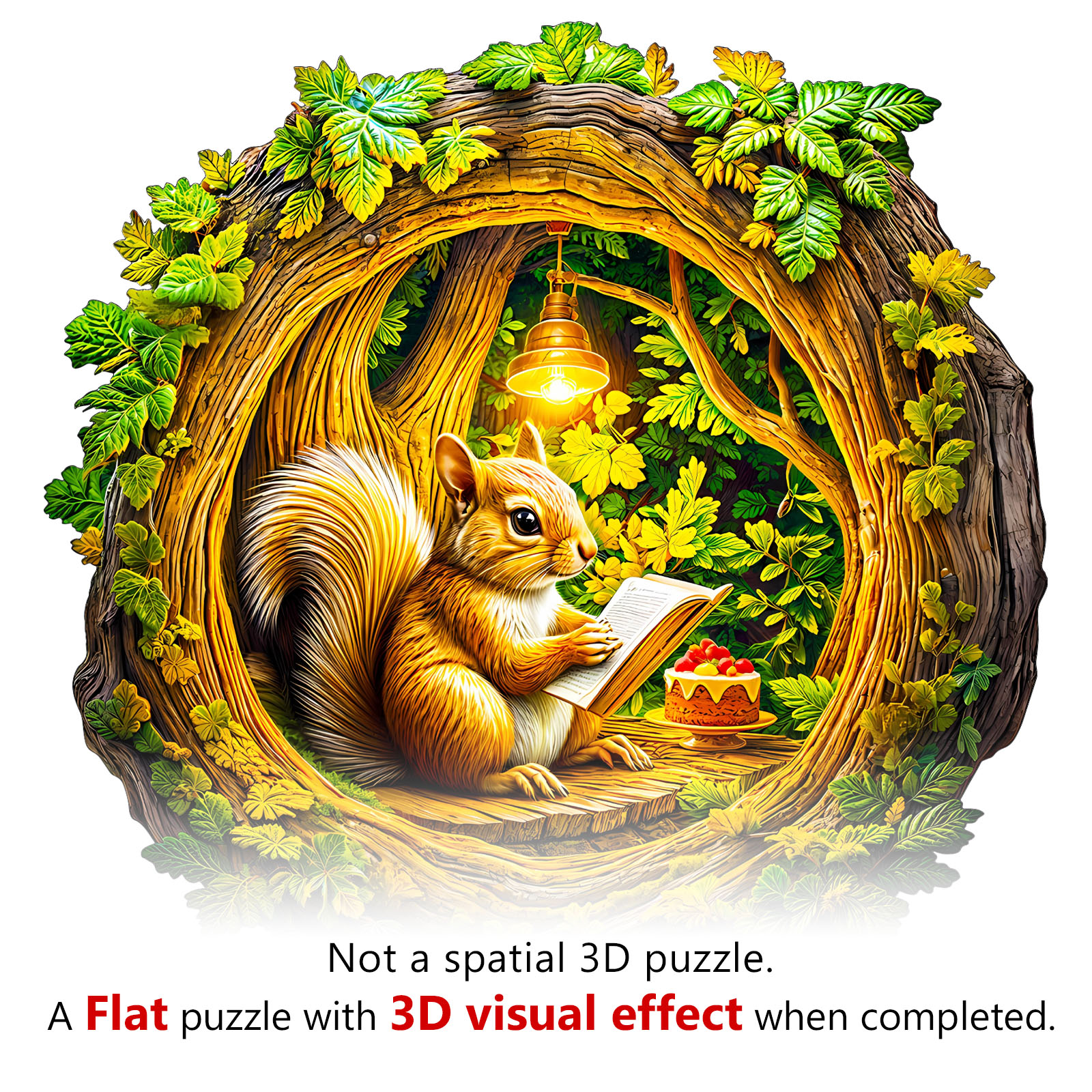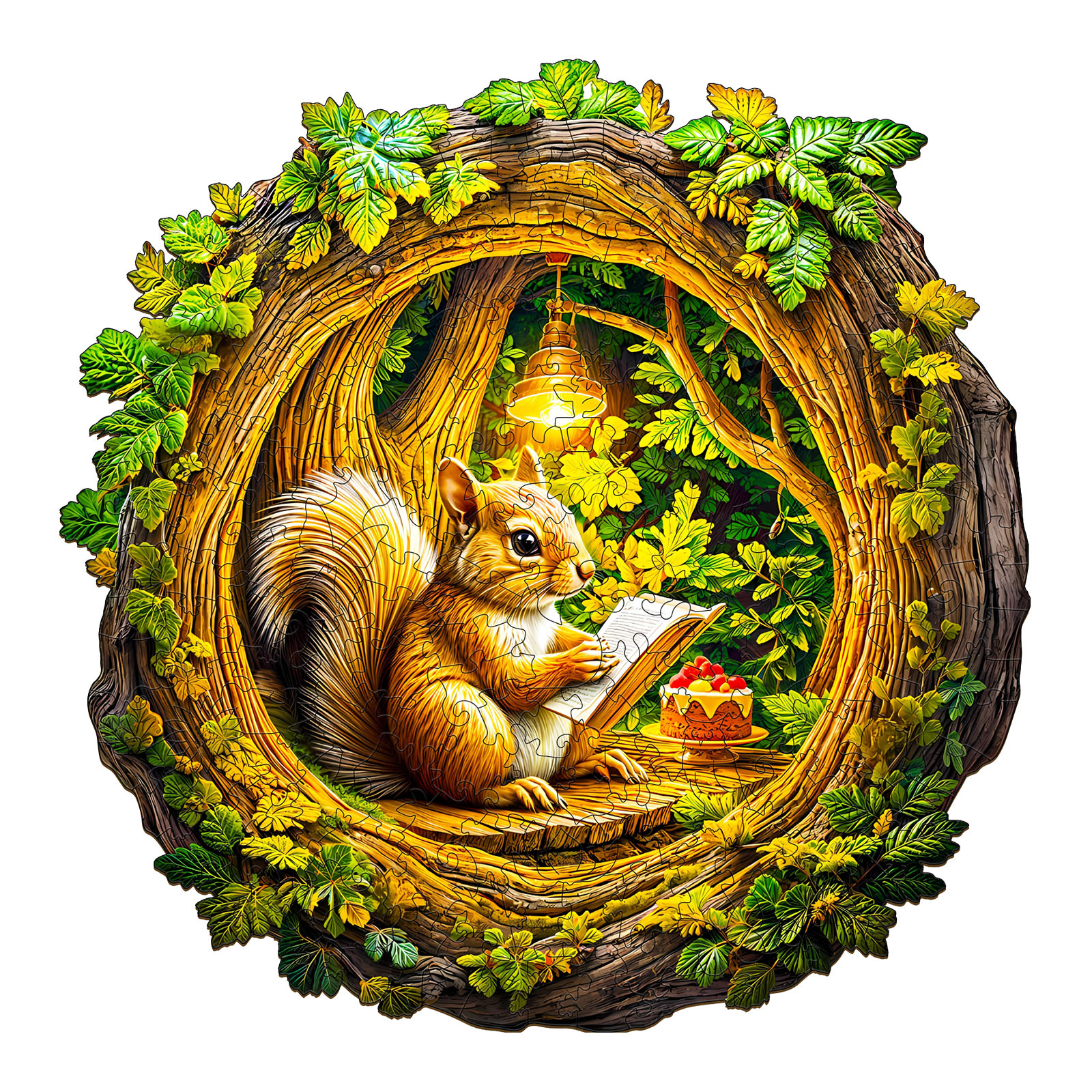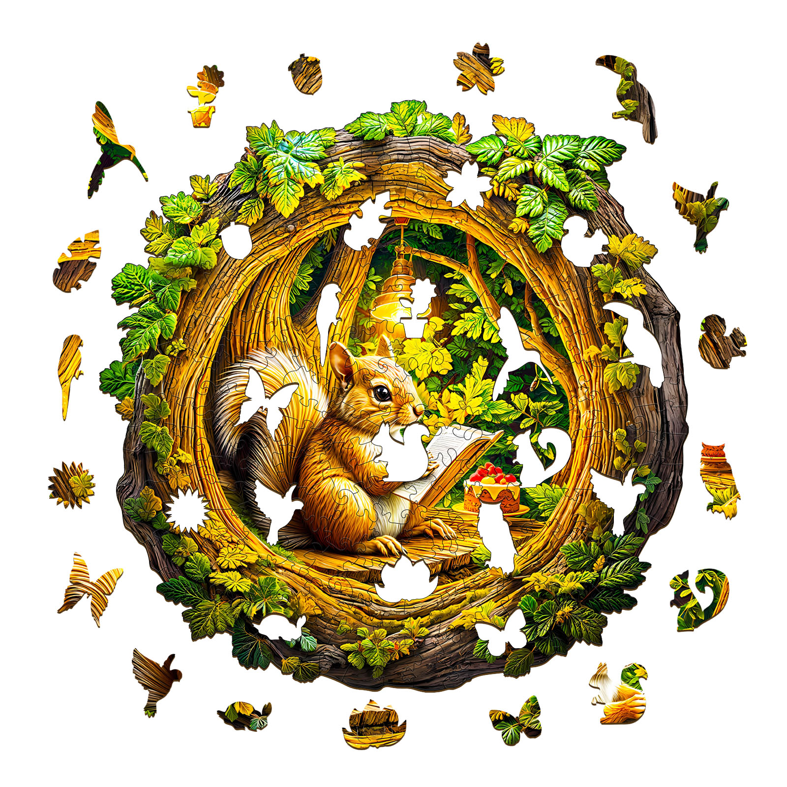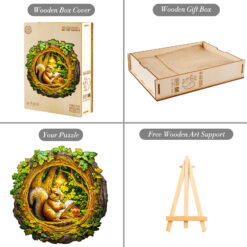 Immerse yourself in the cozy charm of the forest with this Kaayee Wooden Puzzle, featuring a sweet squirrel nestled inside a hollow tree, sketching under a glowing lamp. Surrounded by vibrant green foliage and accompanied by a delicious dessert, the scene radiates warmth and creativity. Crafted with precision from eco-friendly wood, each uniquely shaped puzzle piece fits together to form a beautifully detailed and heartwarming design. Perfect for relaxation, mindful play, and artistic display, this enchanting puzzle makes a wonderful gift for nature lovers, woodland fans, and puzzle enthusiasts alike.