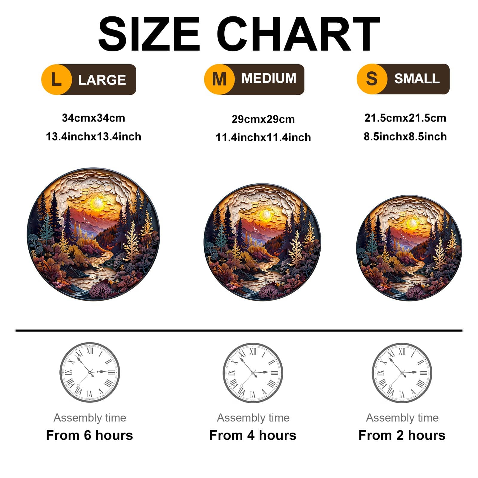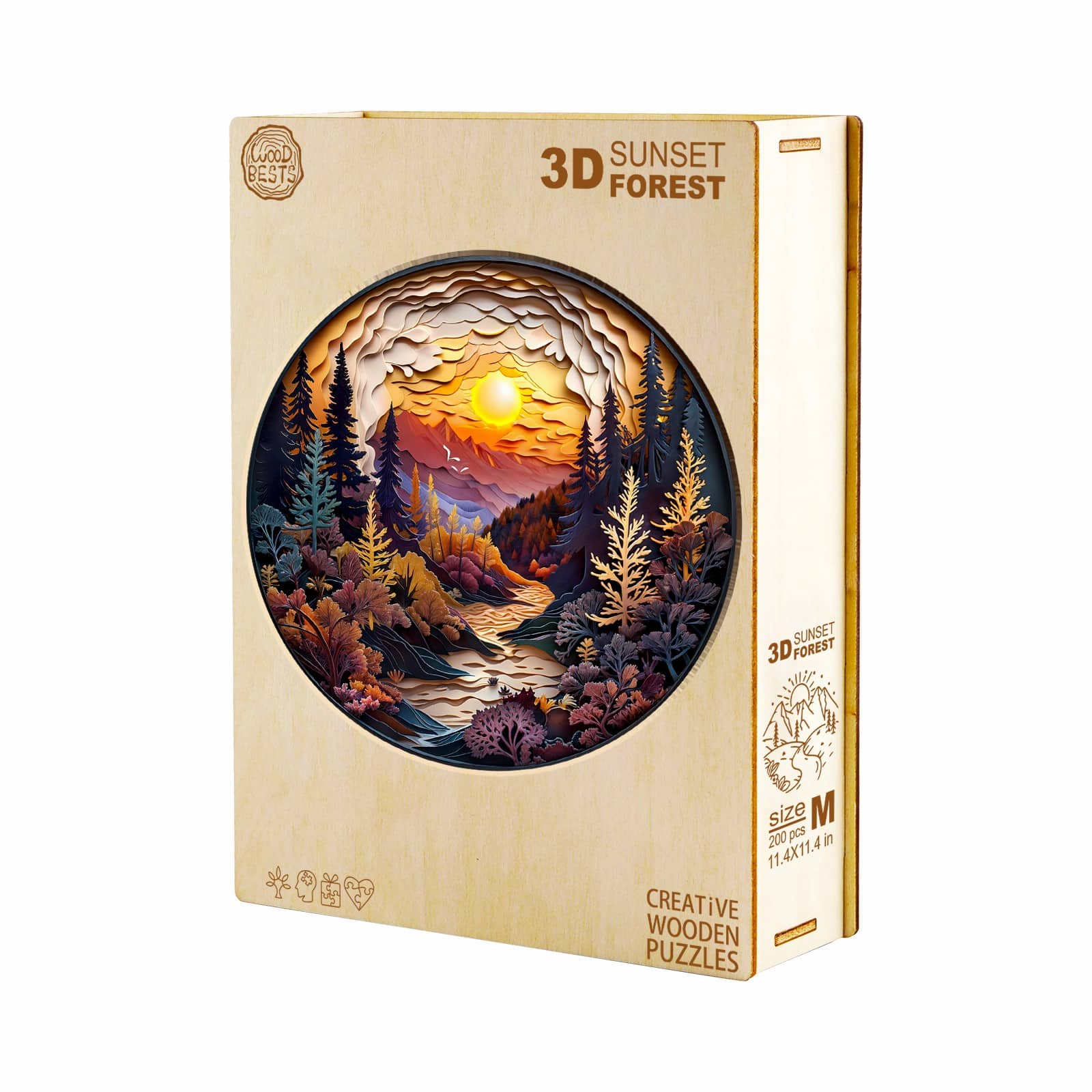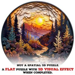 This Sunset Forest wooden puzzle captures the serene beauty of nature at dusk, with a vibrant sunset illuminating a tranquil forest scene. The warm hues of the setting sun blend seamlessly into the purple, orange, and gold tones of the trees, mountains, and sky, creating a breathtaking contrast. A winding river flows gently through the center, adding depth and movement to the image. Each intricately cut piece is uniquely designed, enhancing the puzzle’s challenge and artistic value. The Sunset Forest puzzle provides a calming yet engaging experience, perfect for nature lovers and puzzle enthusiasts alike