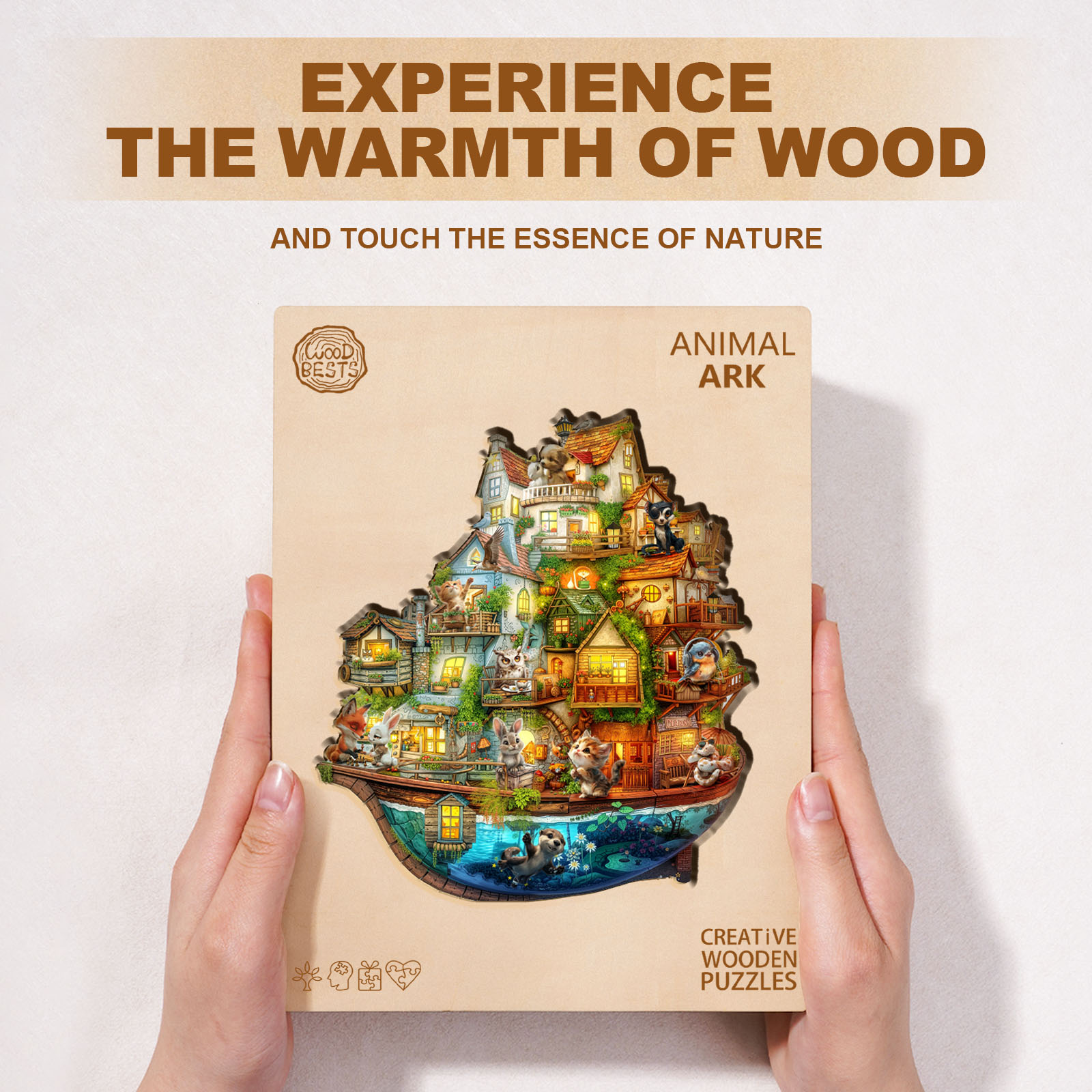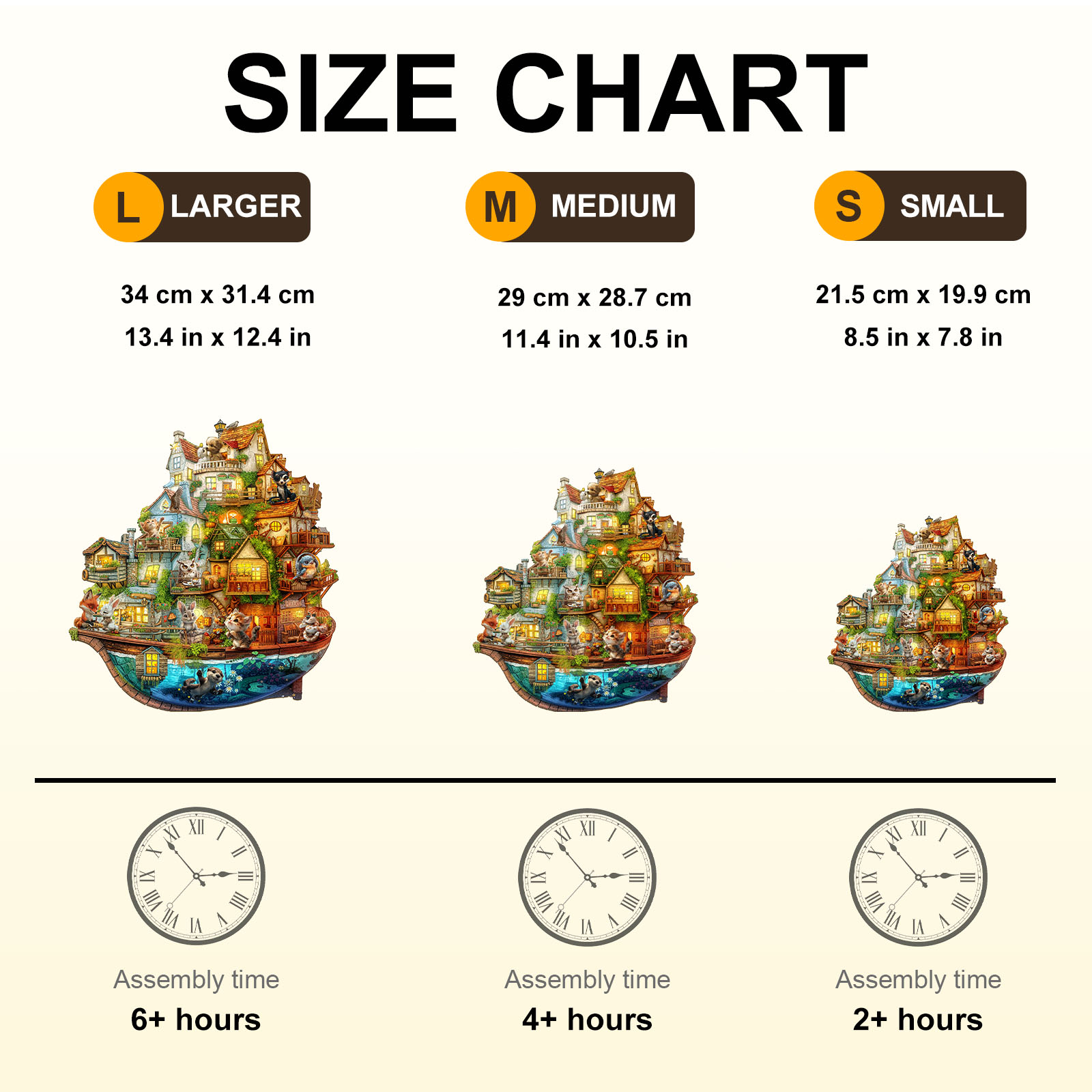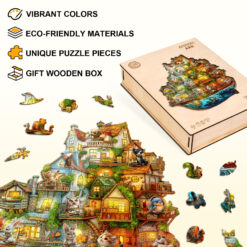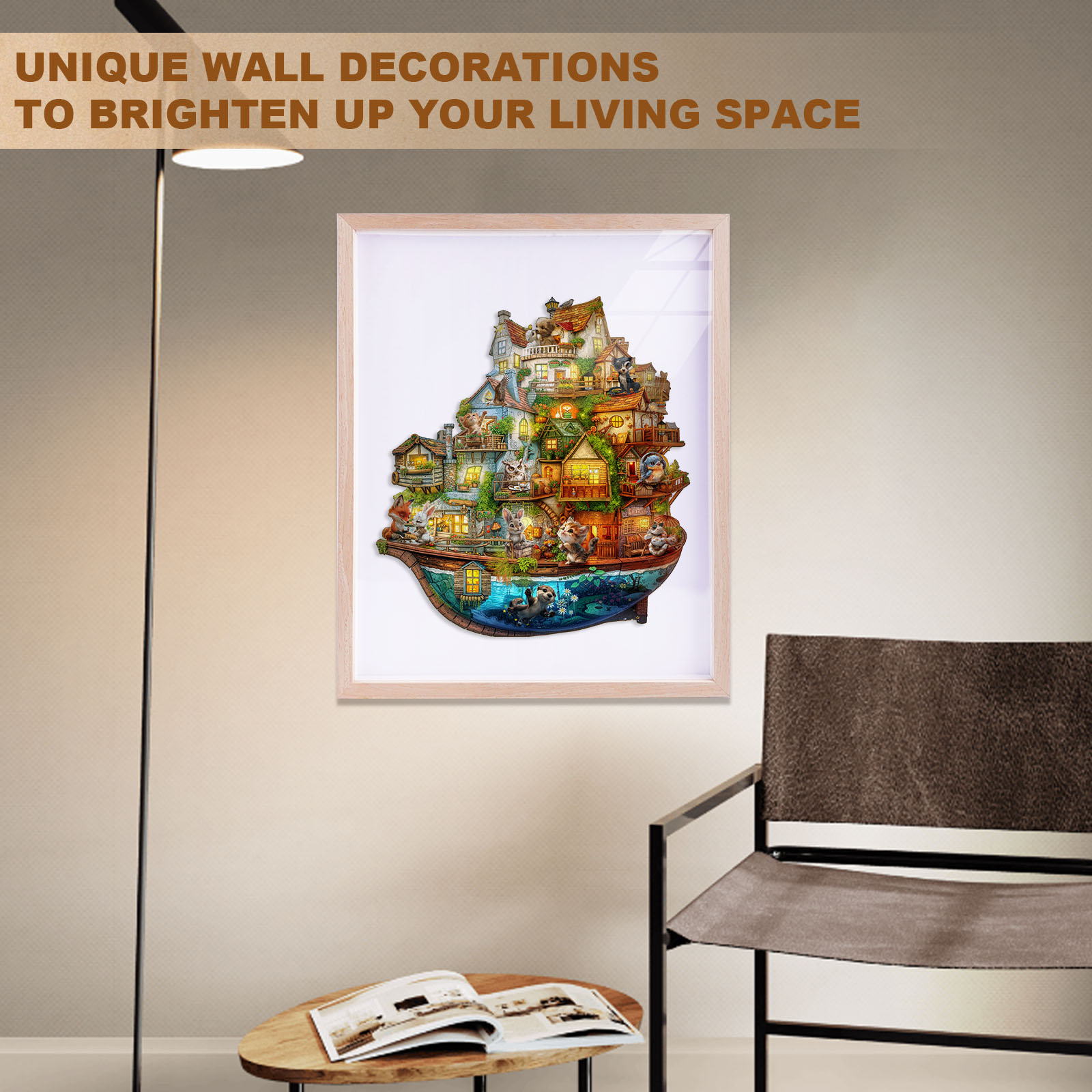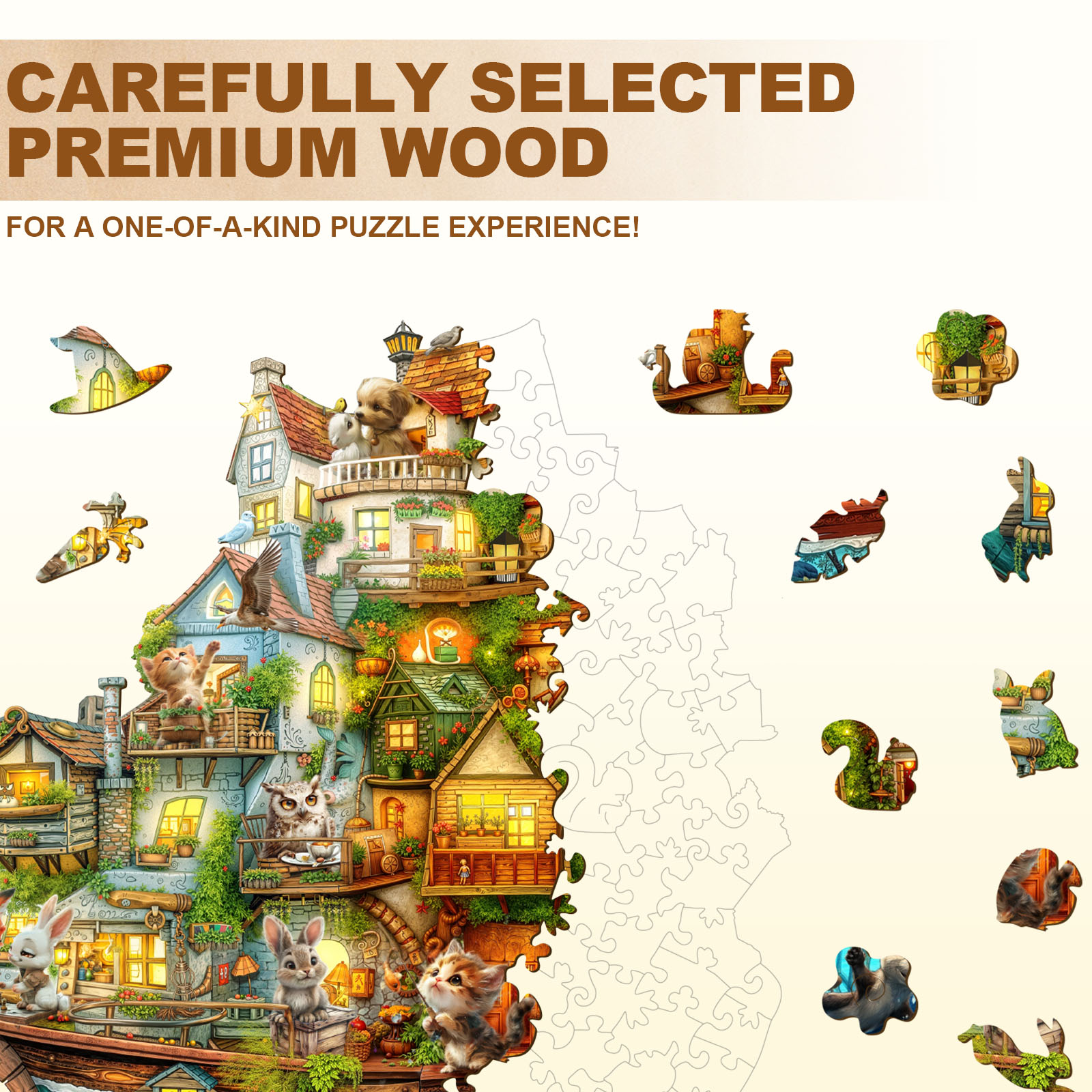 This magical Kaayee wooden puzzle features a whimsical, multi-level house shaped like a boat, filled with a community of adorable animals. The intricate design shows a cat, fox, rabbit, and many other creatures in and around the charming, hobbit-like homes, which are adorned with flowers and warm glowing lights. The puzzle’s unique, irregular shape outlines the entire boat-house structure, adding to the charm and challenge. This is the perfect puzzle for those who love fairy tales, animals, and intricate, fantasy-themed art.