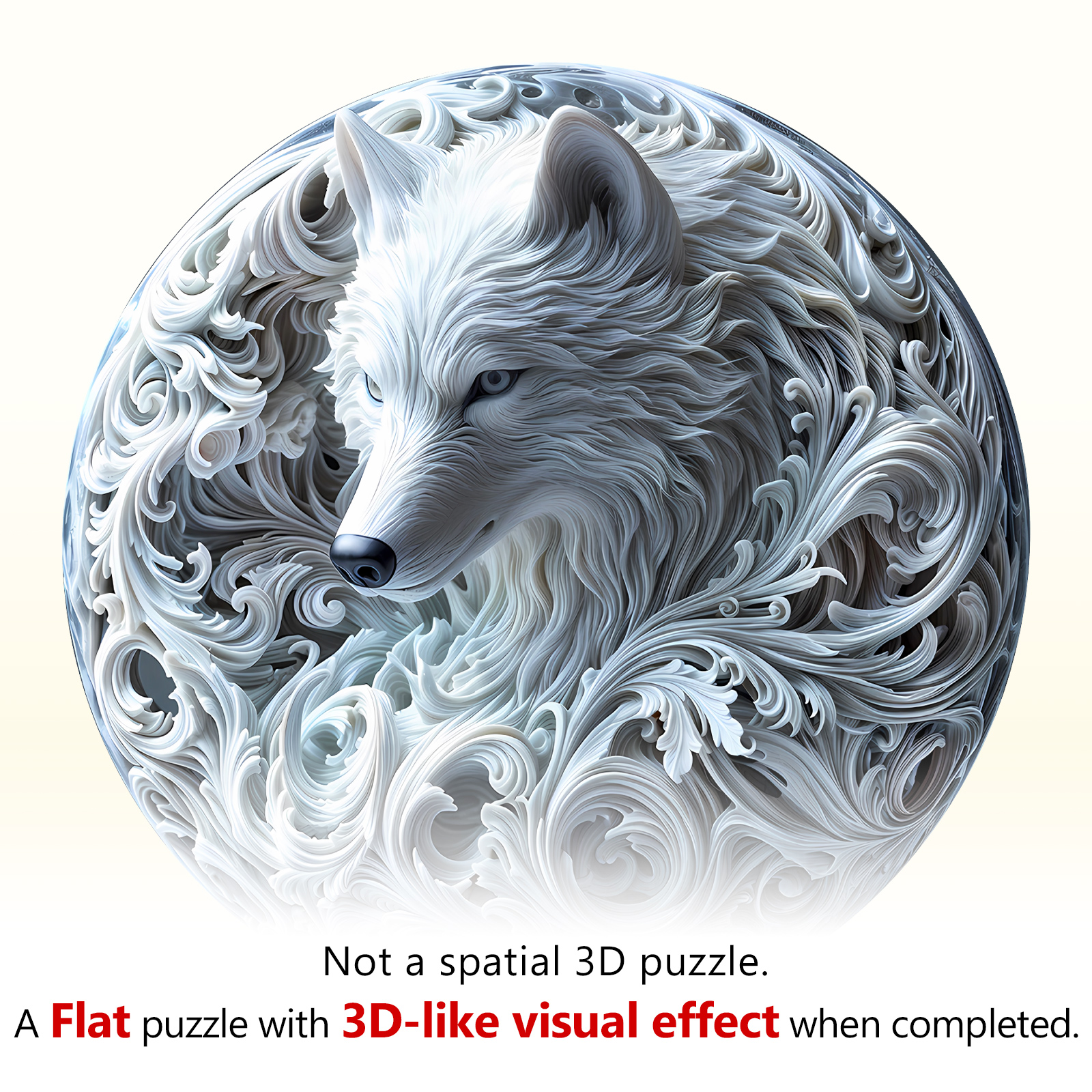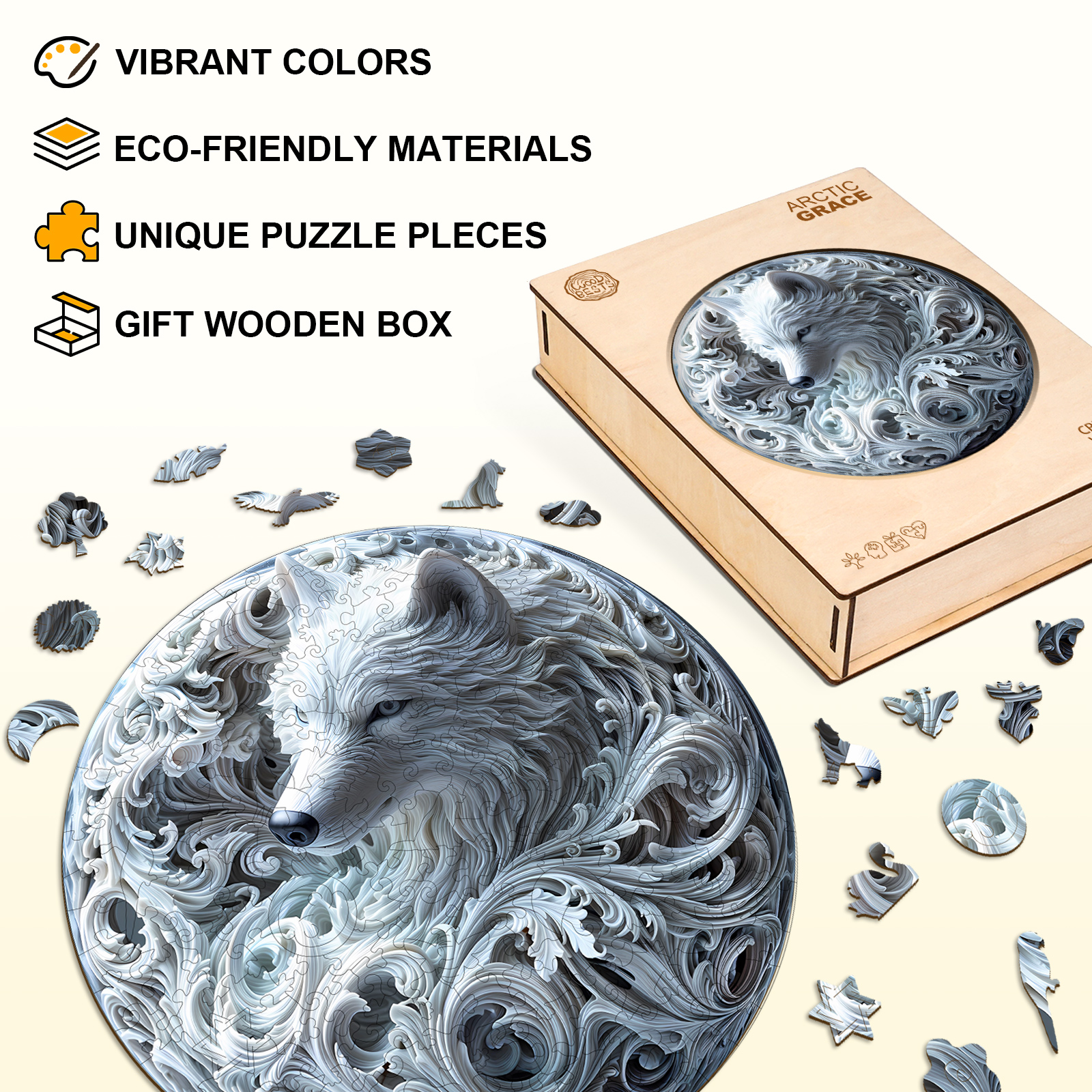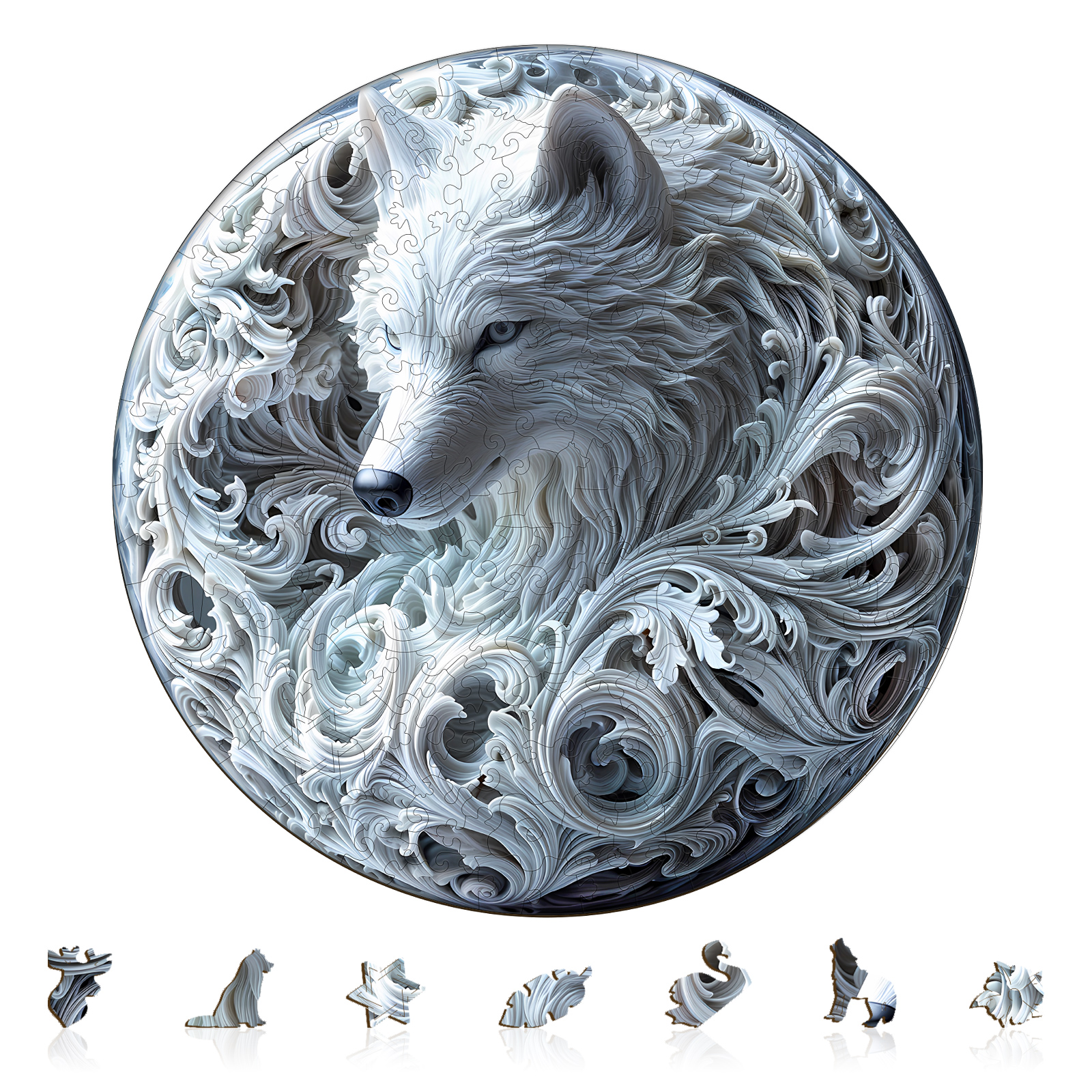 This captivating Kaayee wooden jigsaw puzzle features a majestic white wolf at its center, emerging from a swirl of intricate, sculpted patterns. The puzzle, with its unique circular shape and detailed design, presents a fascinating challenge. The wolf’s fur and the surrounding baroque-style carvings are rendered with stunning detail, creating a powerful and elegant image. This puzzle is an excellent choice for those who appreciate detailed artistry, love wolves, and are looking for a high-quality, unique puzzling experience.