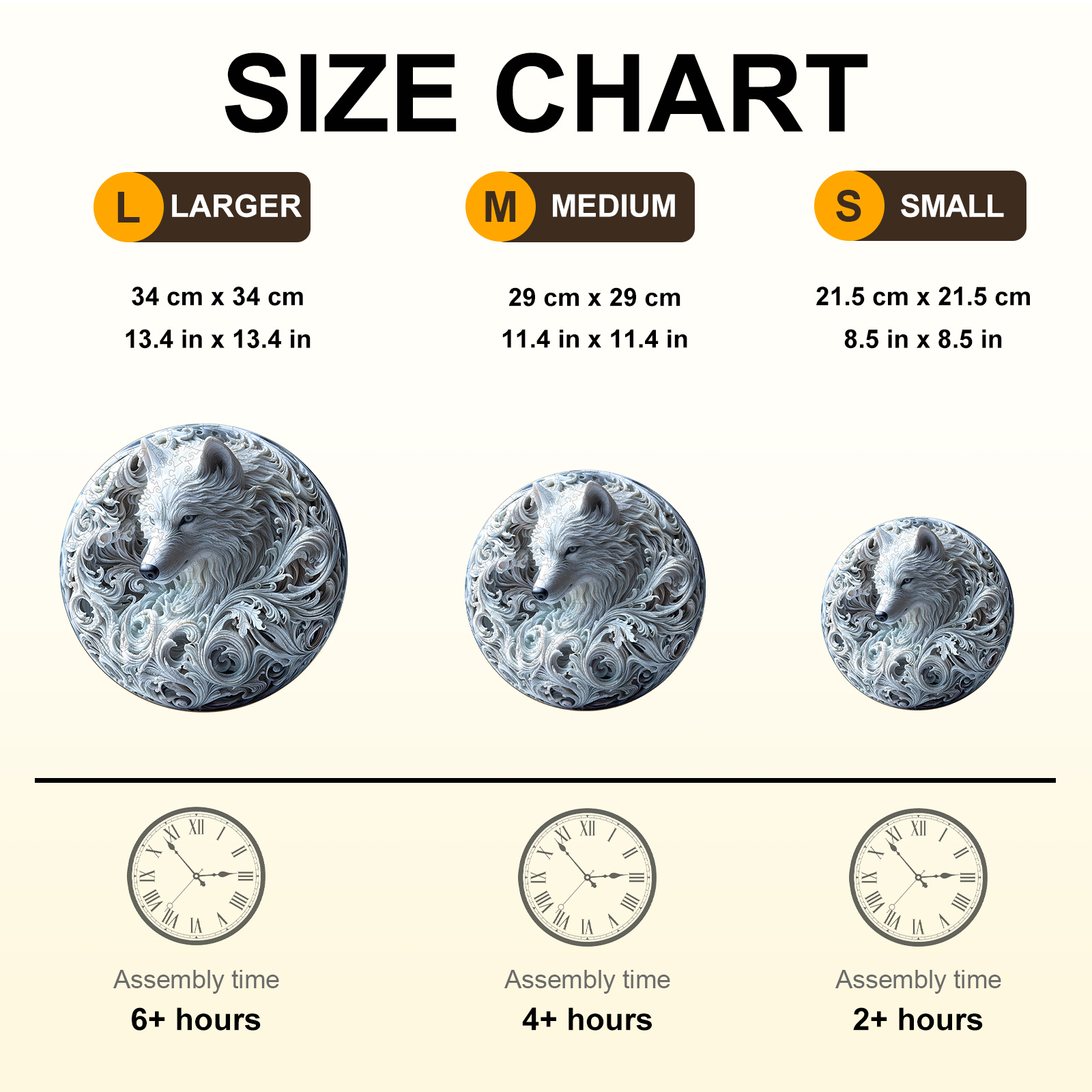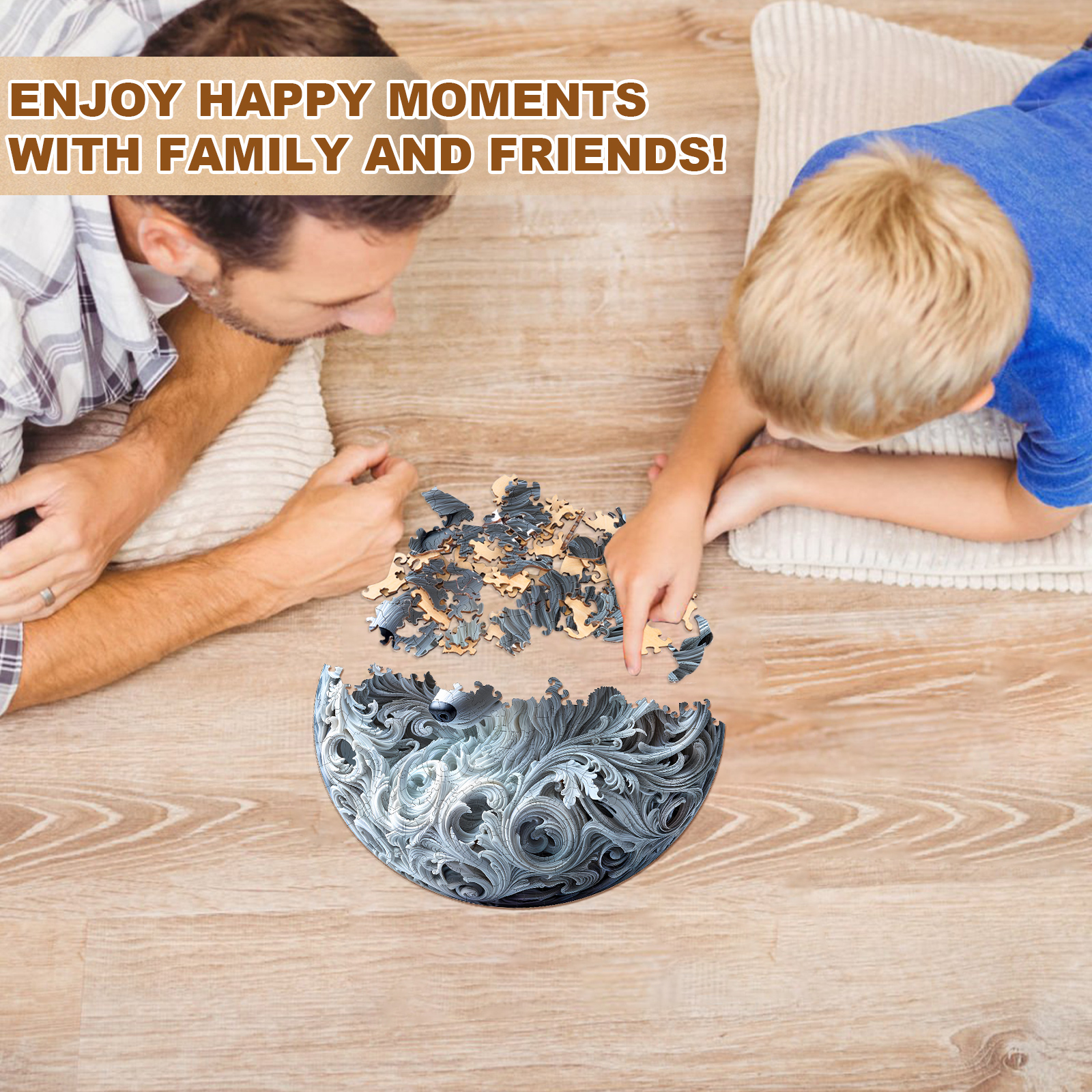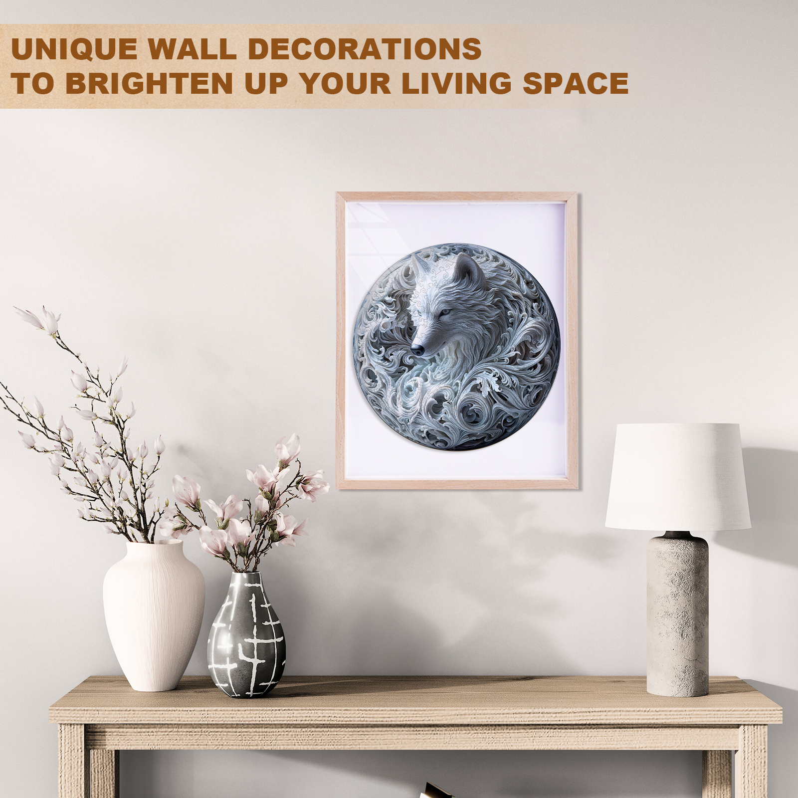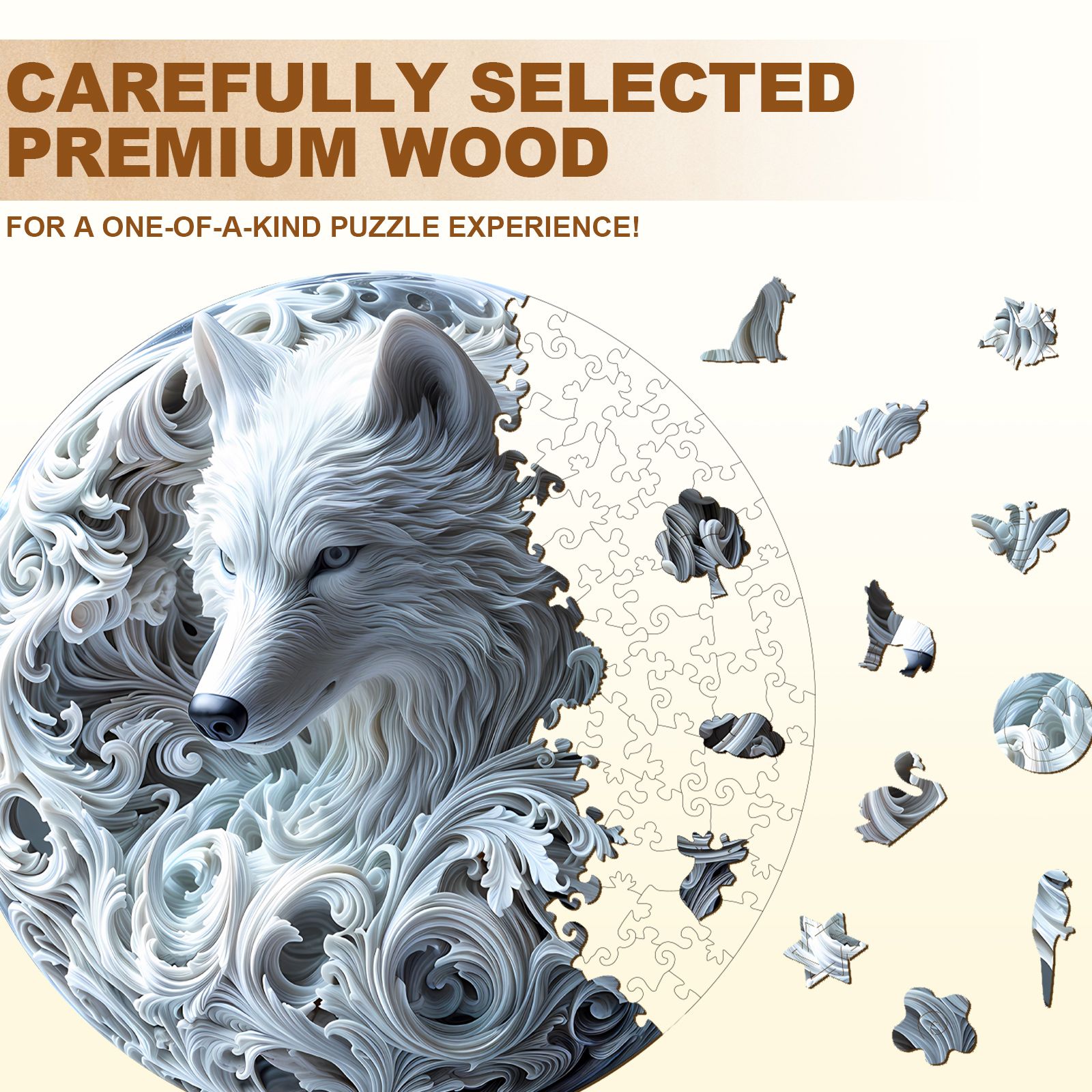 This captivating Kaayee wooden jigsaw puzzle features a majestic white wolf at its center, emerging from a swirl of intricate, sculpted patterns. The puzzle, with its unique circular shape and detailed design, presents a fascinating challenge. The wolf’s fur and the surrounding baroque-style carvings are rendered with stunning detail, creating a powerful and elegant image. This puzzle is an excellent choice for those who appreciate detailed artistry, love wolves, and are looking for a high-quality, unique puzzling experience.