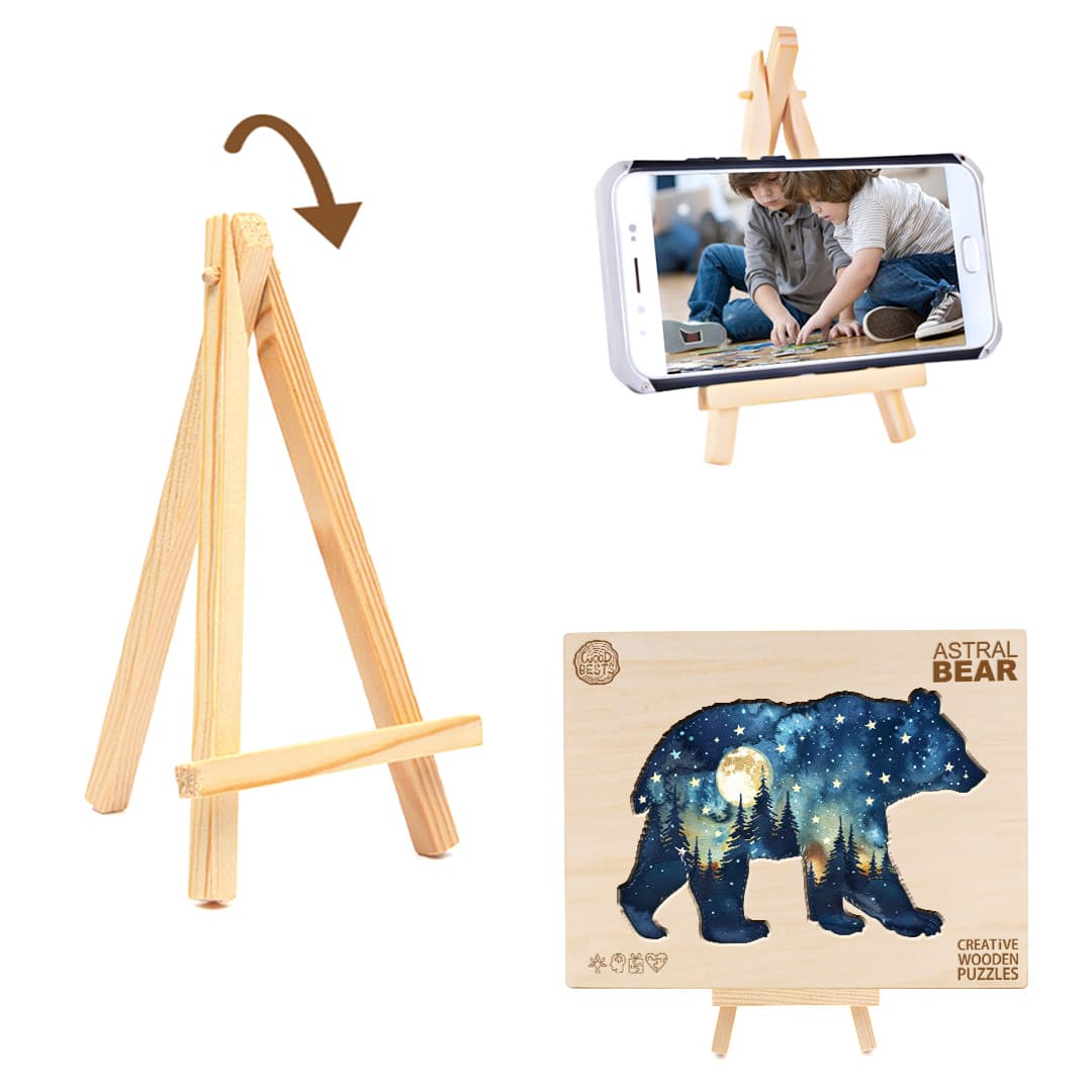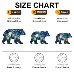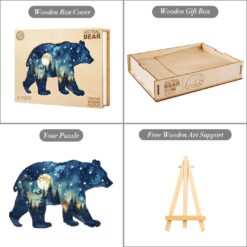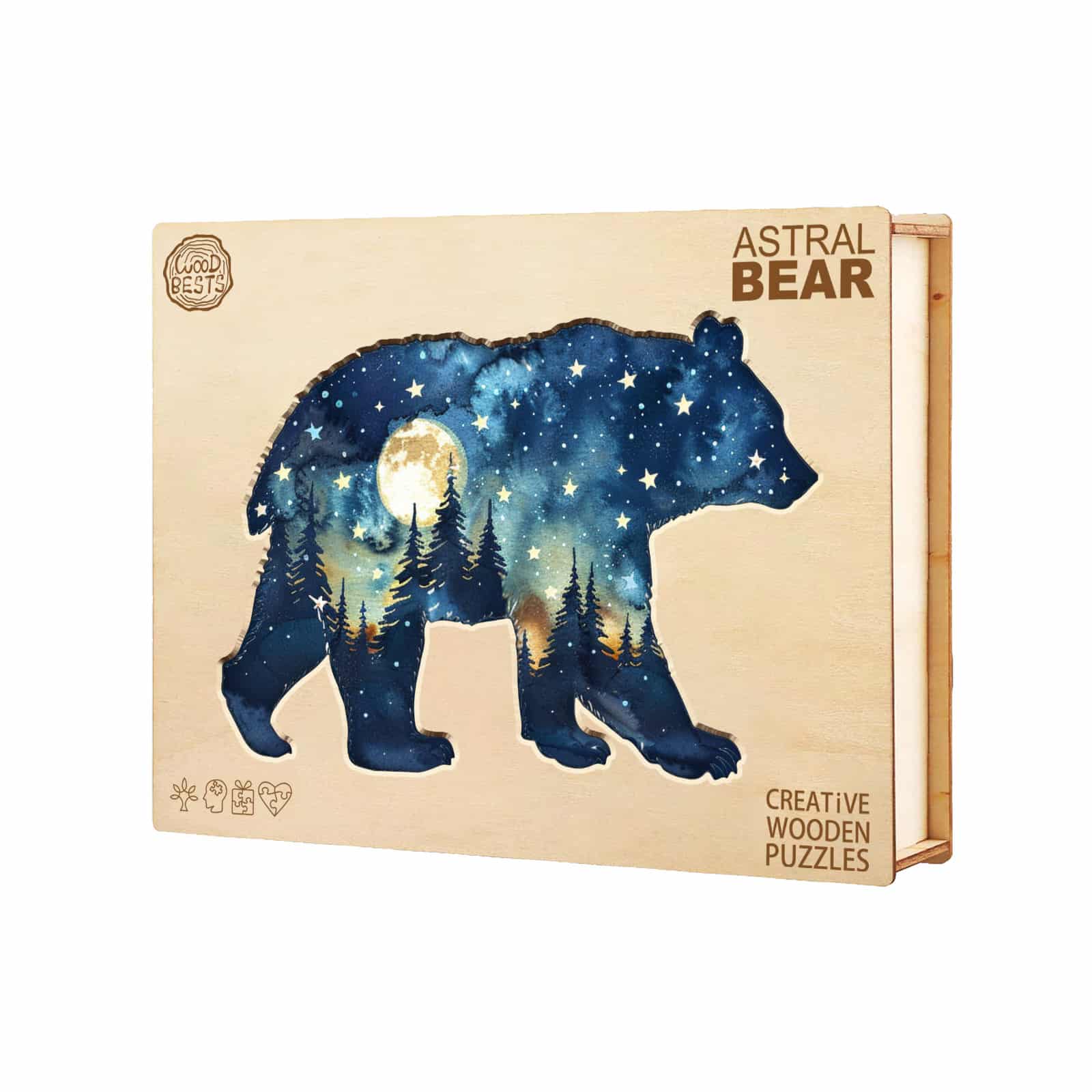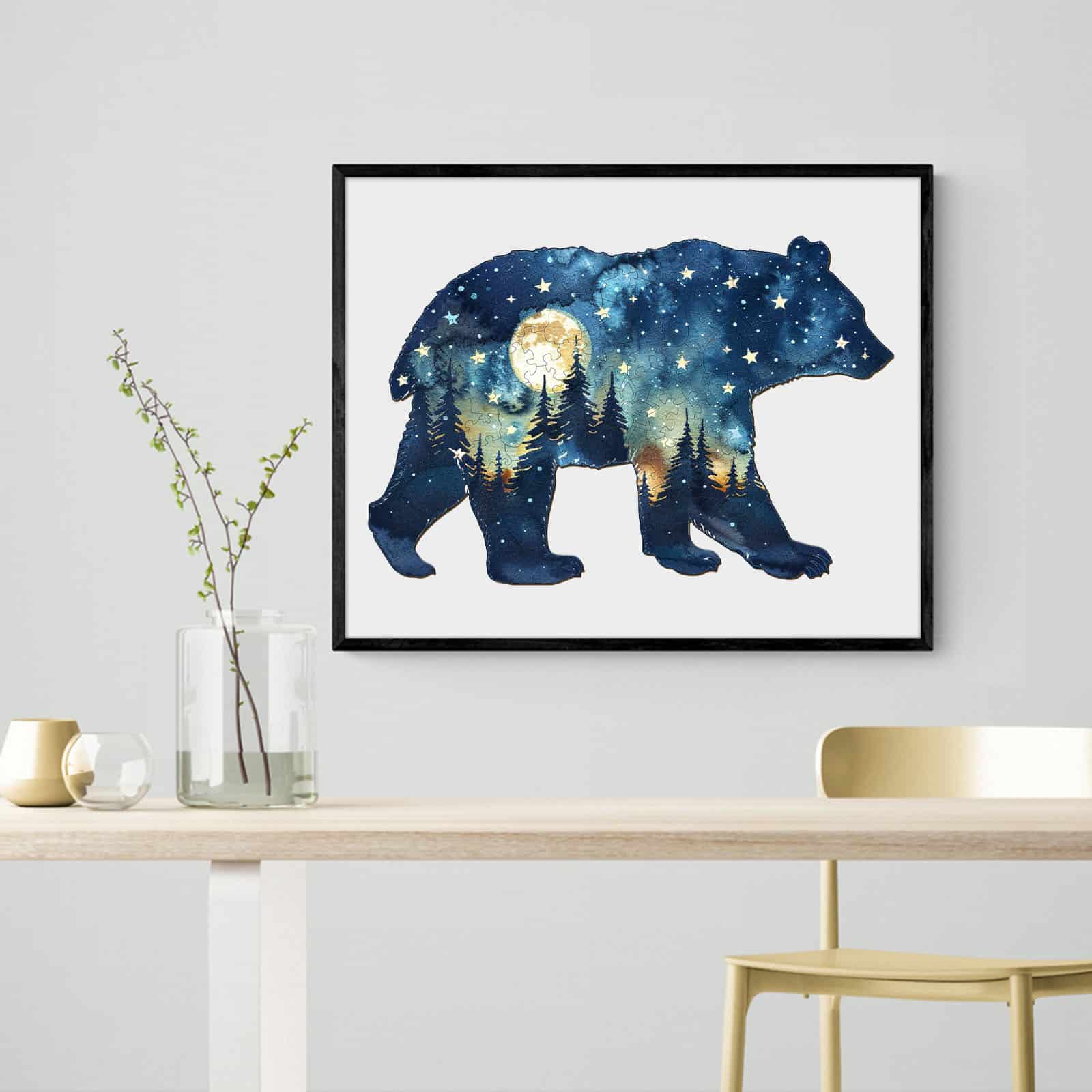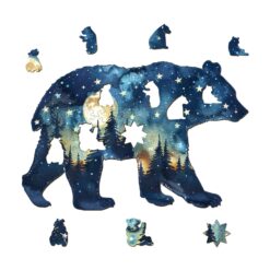 Step into the enchanting world of summer nights in the forest, where the sky transforms into a deep blue canvas adorned with a round, glowing moon and twinkling stars. The air is warm and filled with the soothing sounds of nature, from the gentle rustling of leaves to the distant call of nocturnal creatures. The forest is bathed in a soft, silvery light, casting mystical shadows and creating a serene, magical atmosphere. This Astral Bear puzzle features bear shape, adding a little childishness to it
