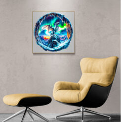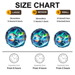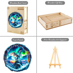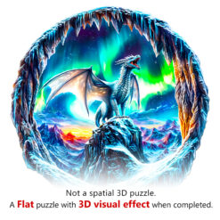 This striking wooden jigsaw puzzle features a majestic dragon perched atop a rocky peak, framed by an icy cave with jagged stalactites. The circular design showcases a vibrant aurora sky and a breathtaking mountain landscape at sunset, with intricate puzzle pieces capturing the dragon’s detailed scales and the icy surroundings. This challenging and visually stunning puzzle offers a thrilling assembly experience for enthusiasts.