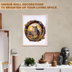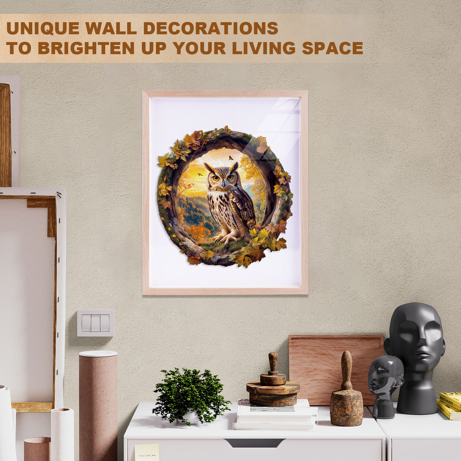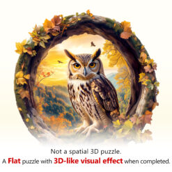 This serene Kaayee wooden puzzle features a beautiful Great Horned Owl perched within a circular frame of autumn leaves and branches. The owl, with its wise yellow eyes, is set against a peaceful backdrop of a forest valley at sunset, with golden and orange leaves scattered across the trees. The unique, circular shape of the puzzle and the intricate design of the leaves and owl make this a challenging and artistic piece. This is a perfect choice for nature lovers and puzzle enthusiasts who enjoy a calming and visually stunning scene.