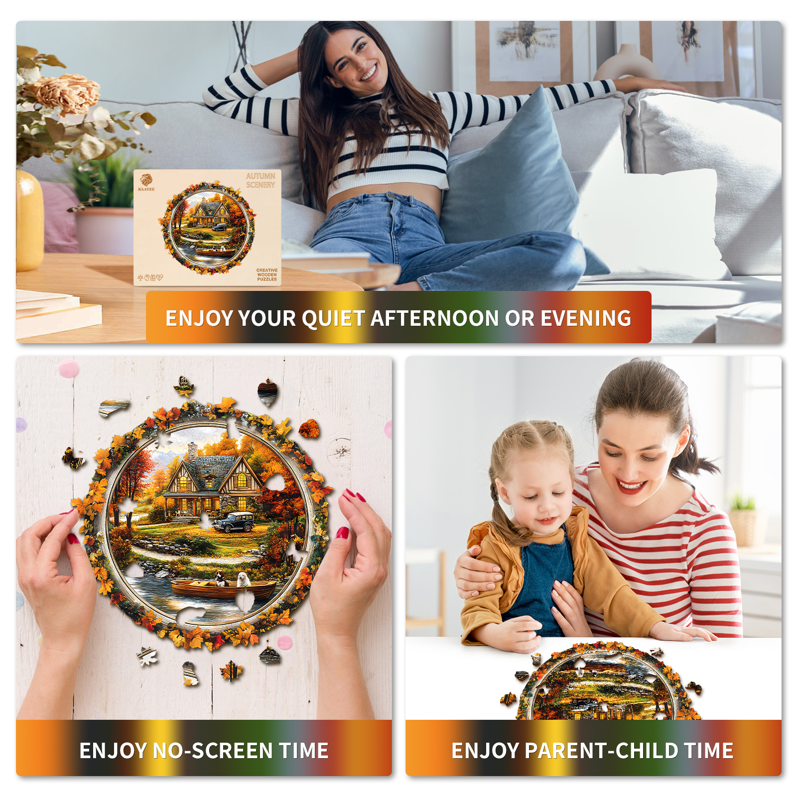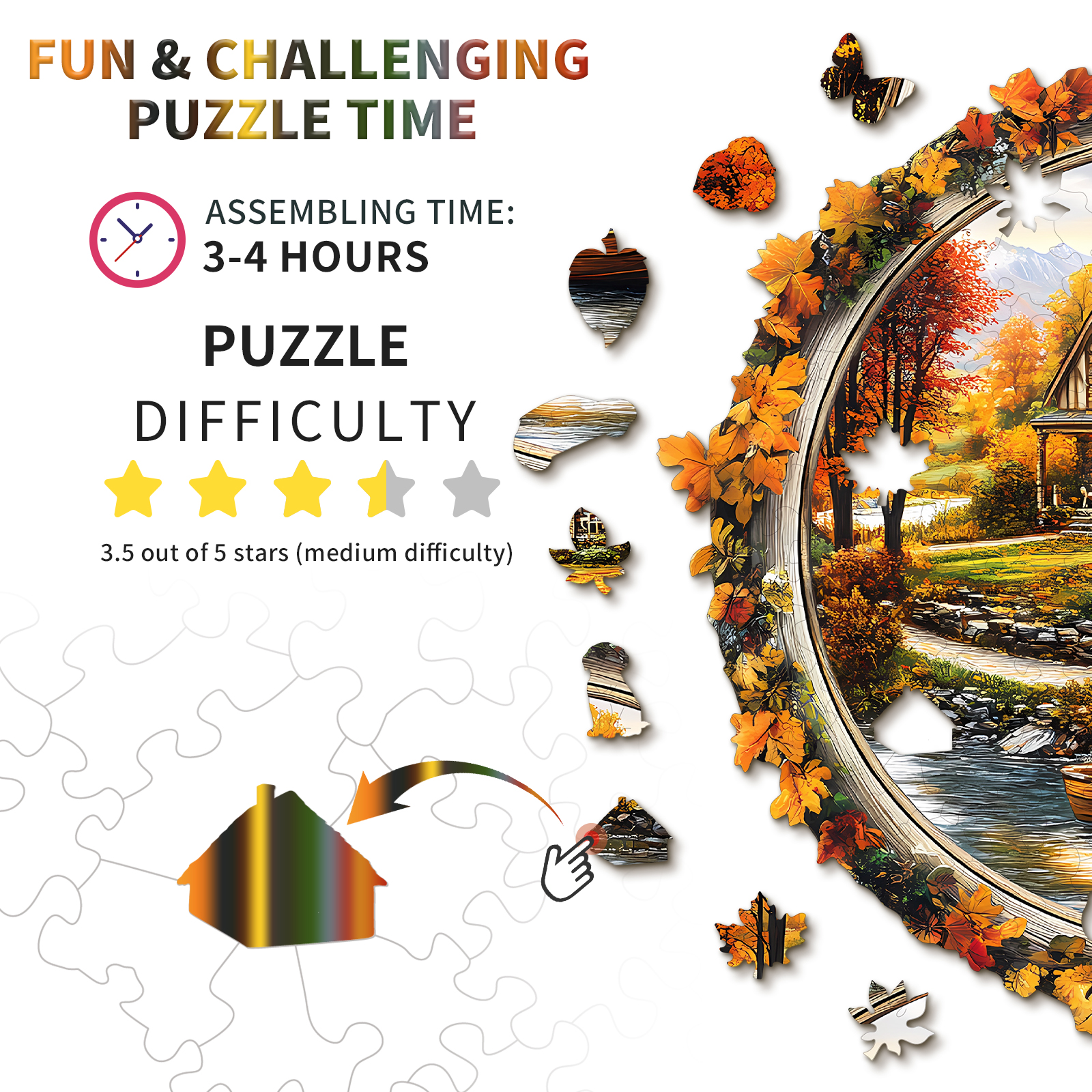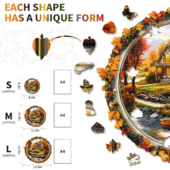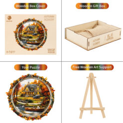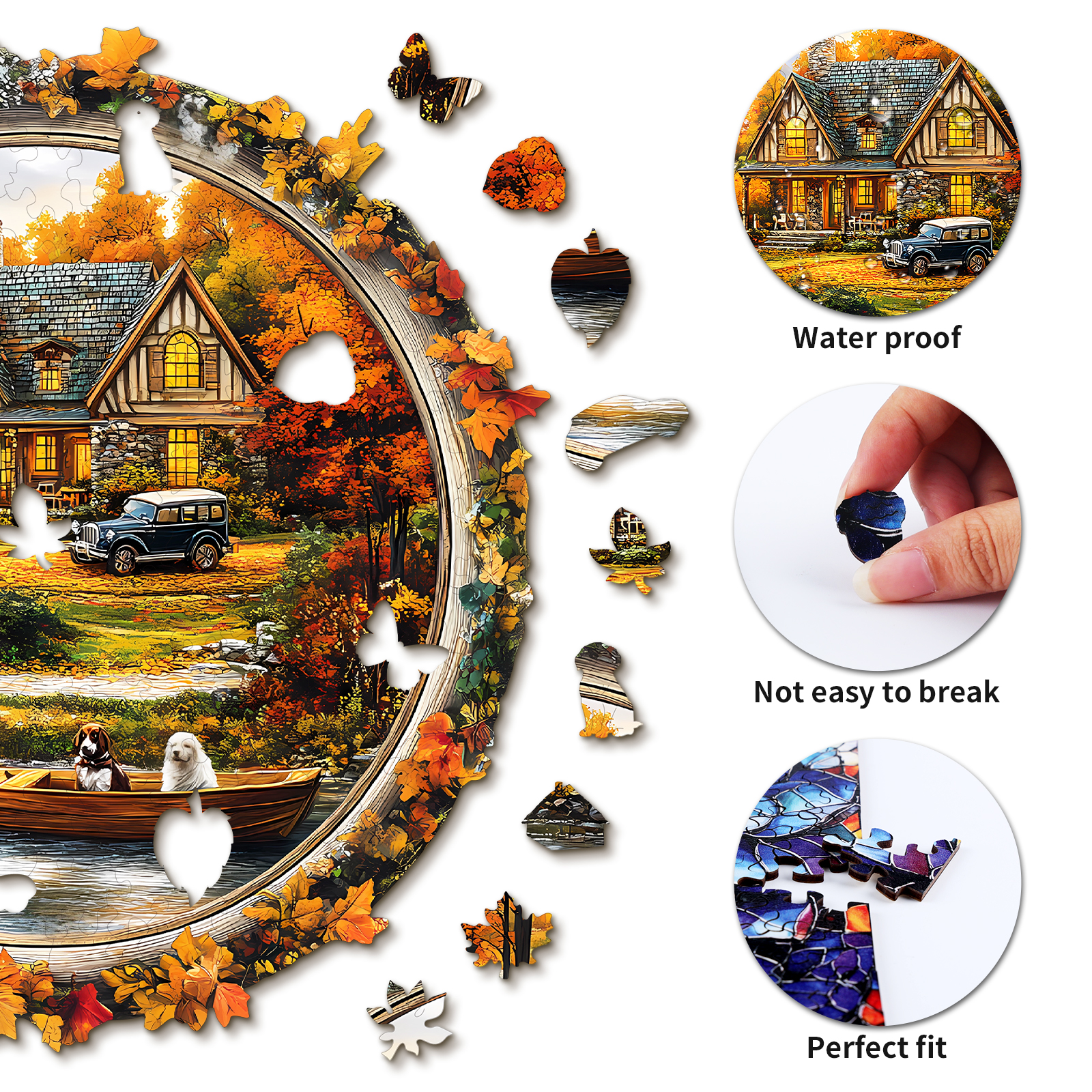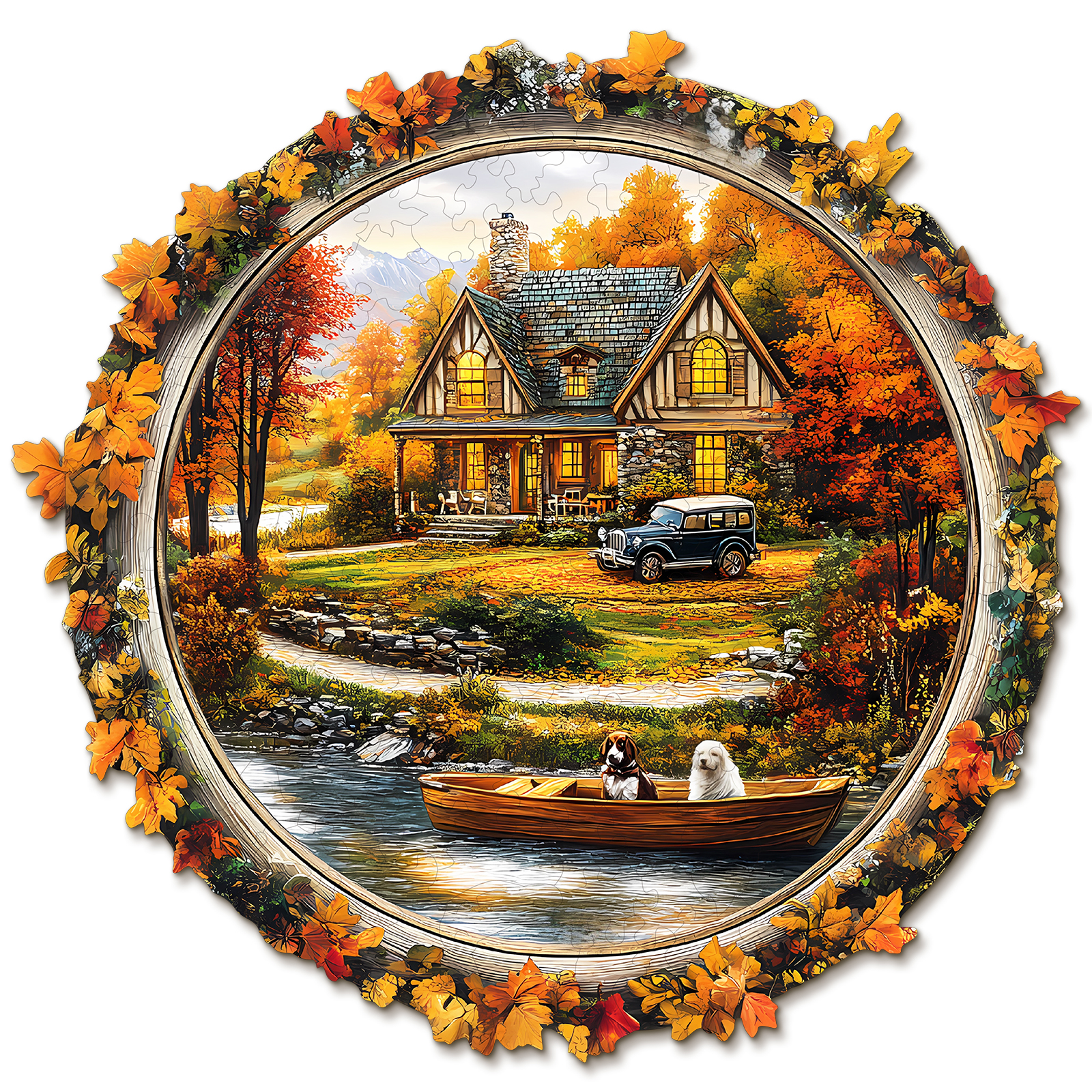 Embrace the charm of fall with Kaayee’s Autumn Retreat Wooden Puzzle. Nestled in a golden forest and framed by vibrant maple leaves, this heartwarming scene features a rustic cottage, a classic car, and two adorable dogs enjoying a quiet boat ride on the lake. The warm colors and peaceful atmosphere bring to life the beauty of countryside living in autumn. Made from high-quality wood with precision-cut pieces, this puzzle offers both a relaxing challenge and a stunning seasonal display. Perfect for dog lovers, nature enthusiasts, and anyone who adores the cozy magic of fall.