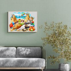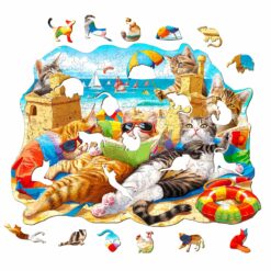 On a sunny beach, cats are enjoying their vacation in style, each sporting a pair of chic sunglasses. Some cats recline on colorful beach towels, soaking up the sun and purring in contentment. Others are engrossed in their books, flipping pages with delicate paws. A few playful cats are building sandcastles, their tails twitching in excitement as they pat and shape the sand. The rhythmic sound of the ocean waves and the distant call of seagulls create a serene backdrop for this charming scene of feline leisure and joy