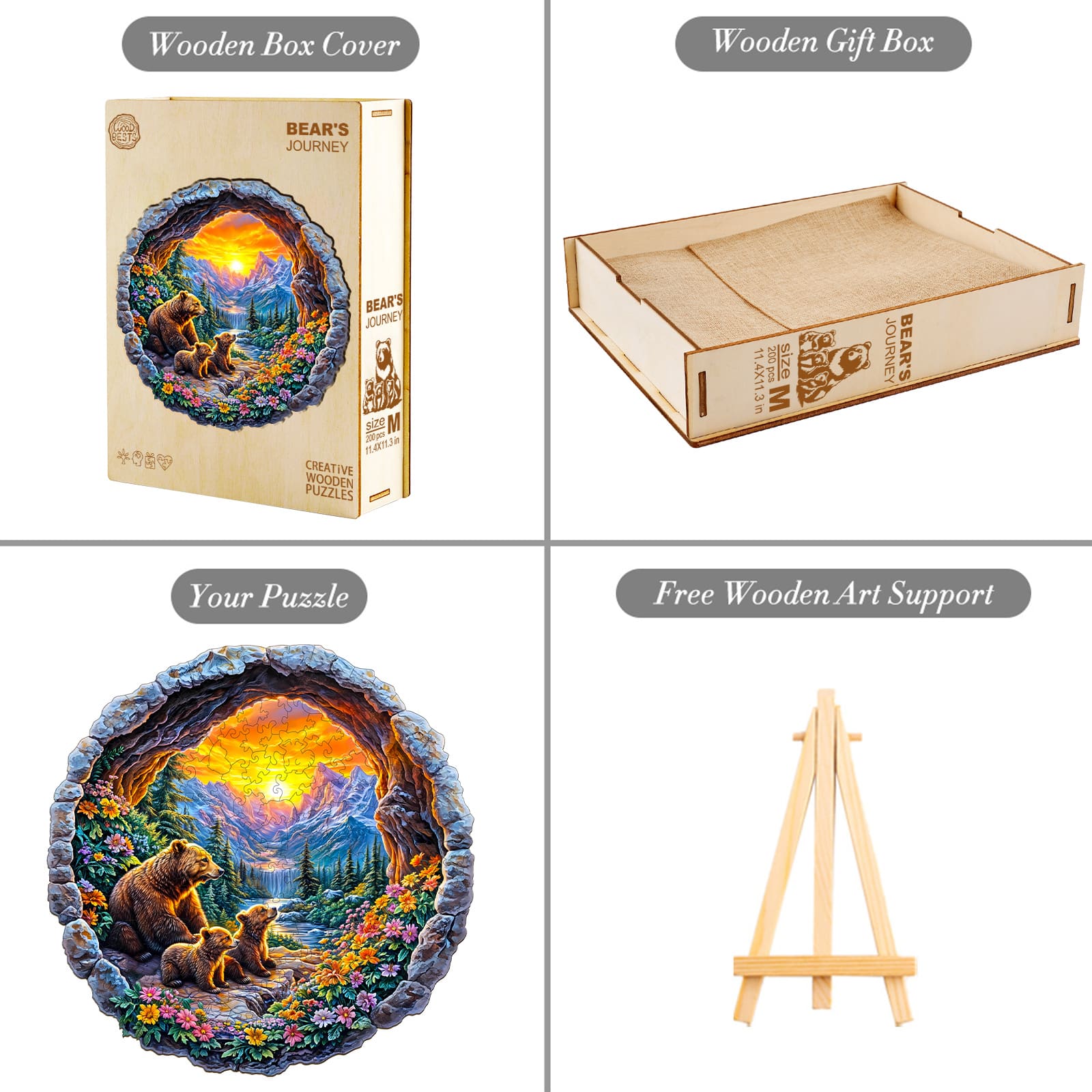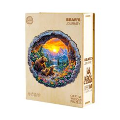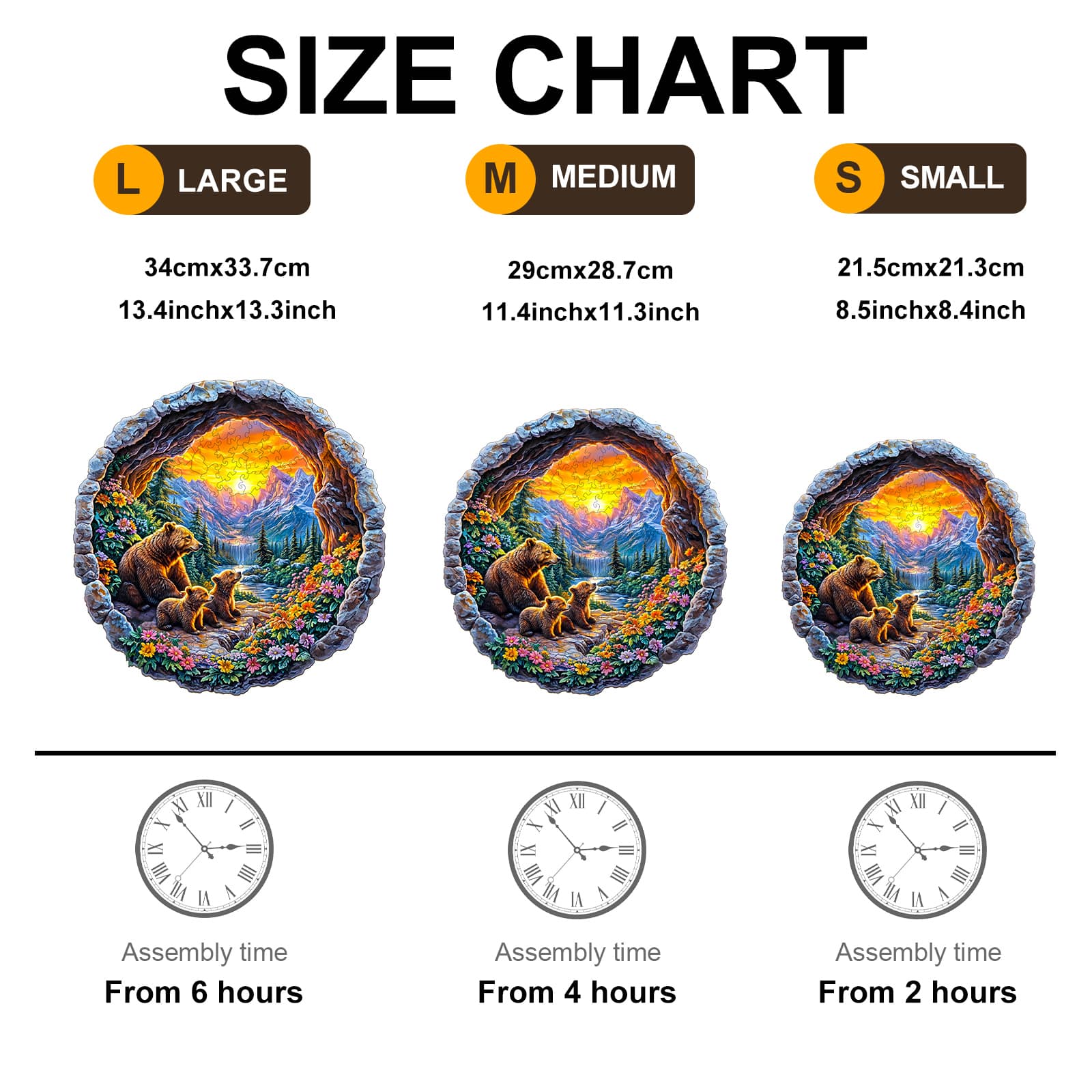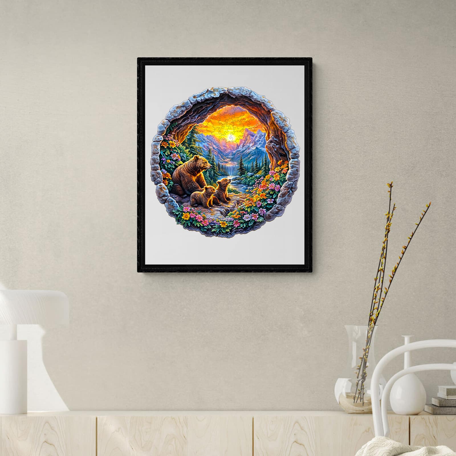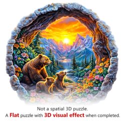 Experience the magic of nature with this exceptional wooden jigsaw puzzle. The design showcases a heartwarming family of bears nestled in a cave, gazing at a vibrant, glowing sunset over a majestic mountain valley. Framed by intricate floral details and rocky textures, the 3D effect of this puzzle creates a breathtaking sense of depth and realism, making it more than just a pastime—it’s a masterpiece.Crafted from durable, eco-friendly wood, each piece fits perfectly for a satisfying and seamless assembly process. The intricate layering and vibrant colors bring every element of the scene to life, from the delicate flowers to the shimmering river and radiant sky.Perfect for puzzle enthusiasts and nature lovers alike, this puzzle is both a creative challenge and a captivating work of art for display.
