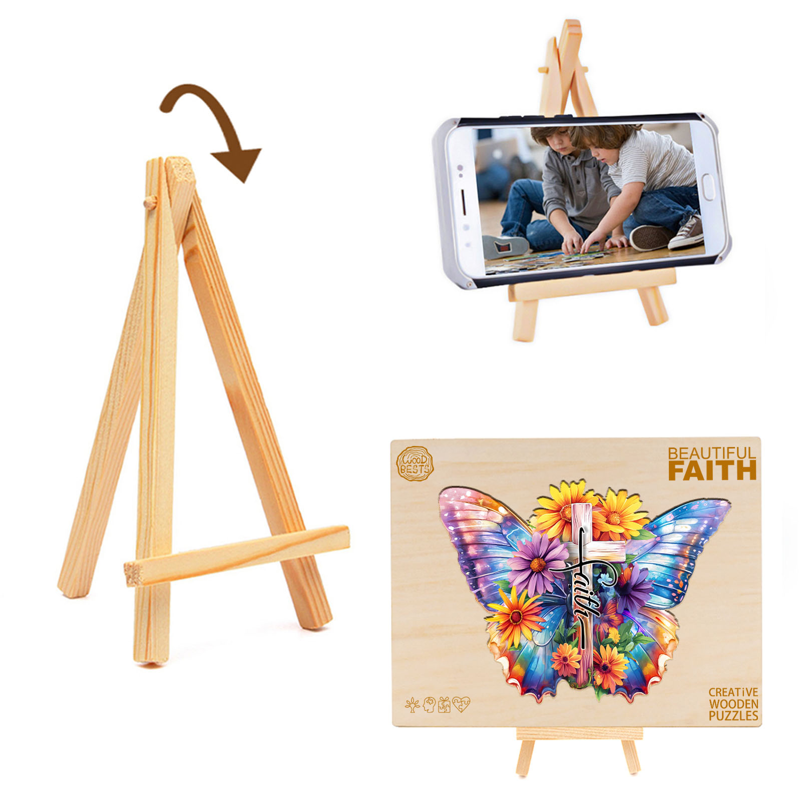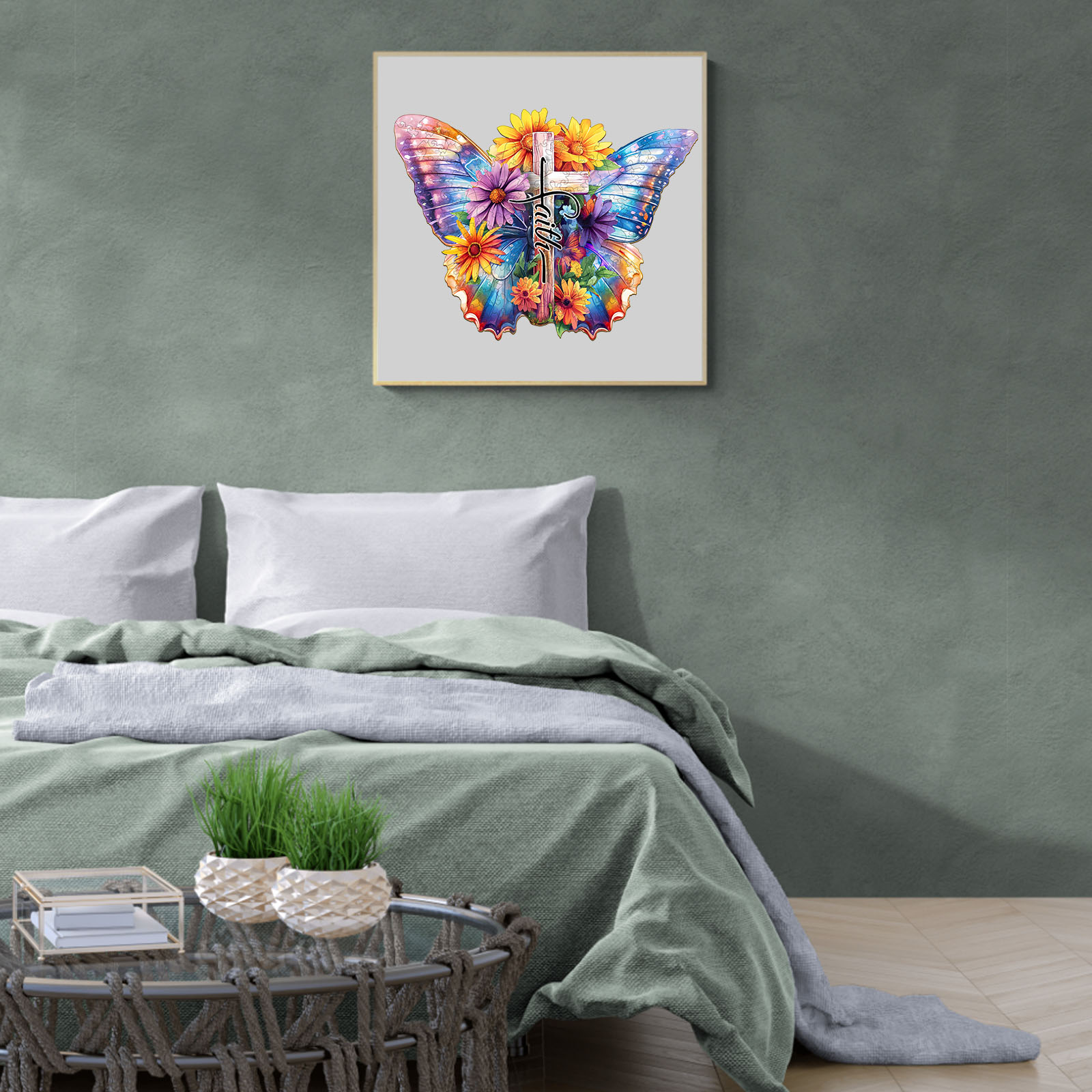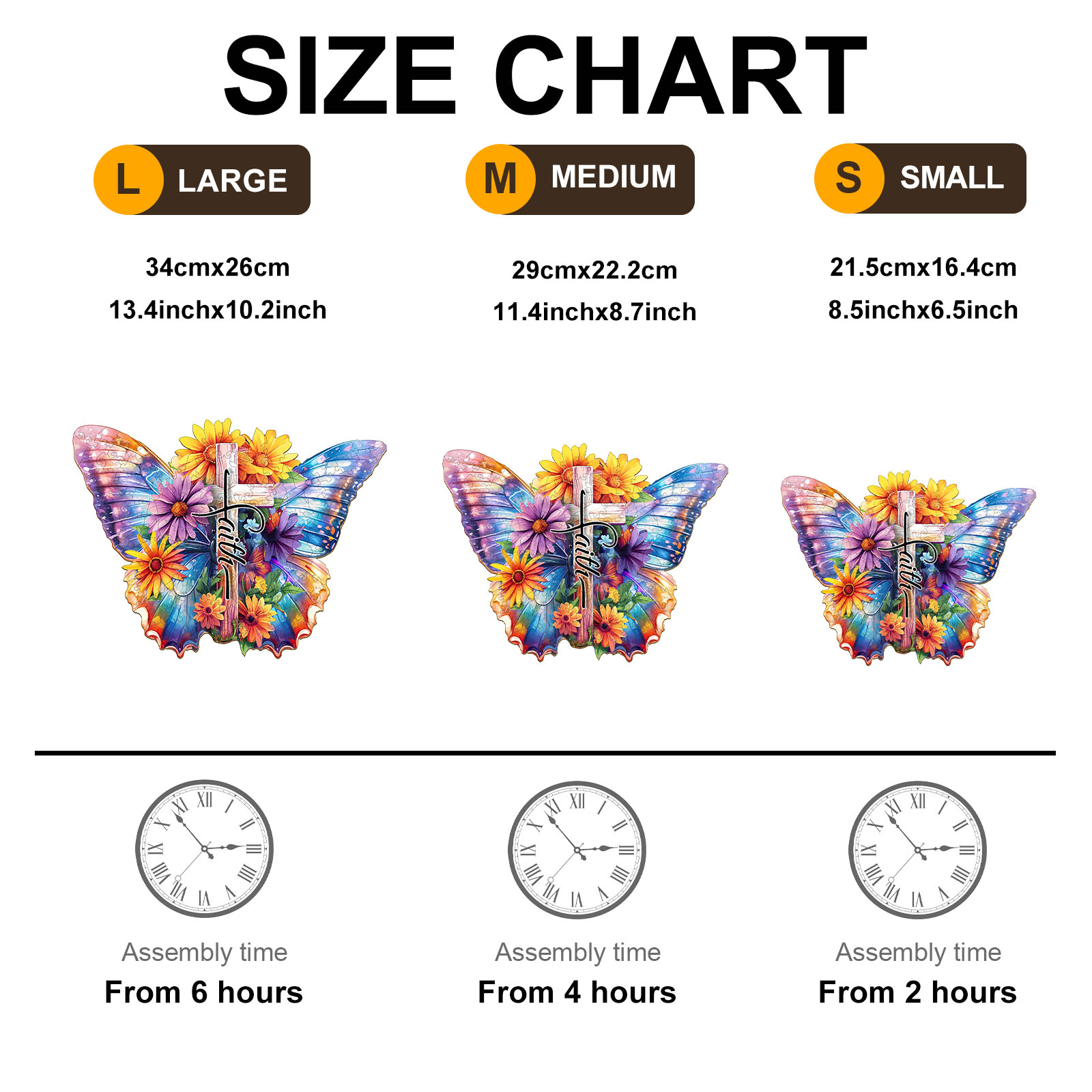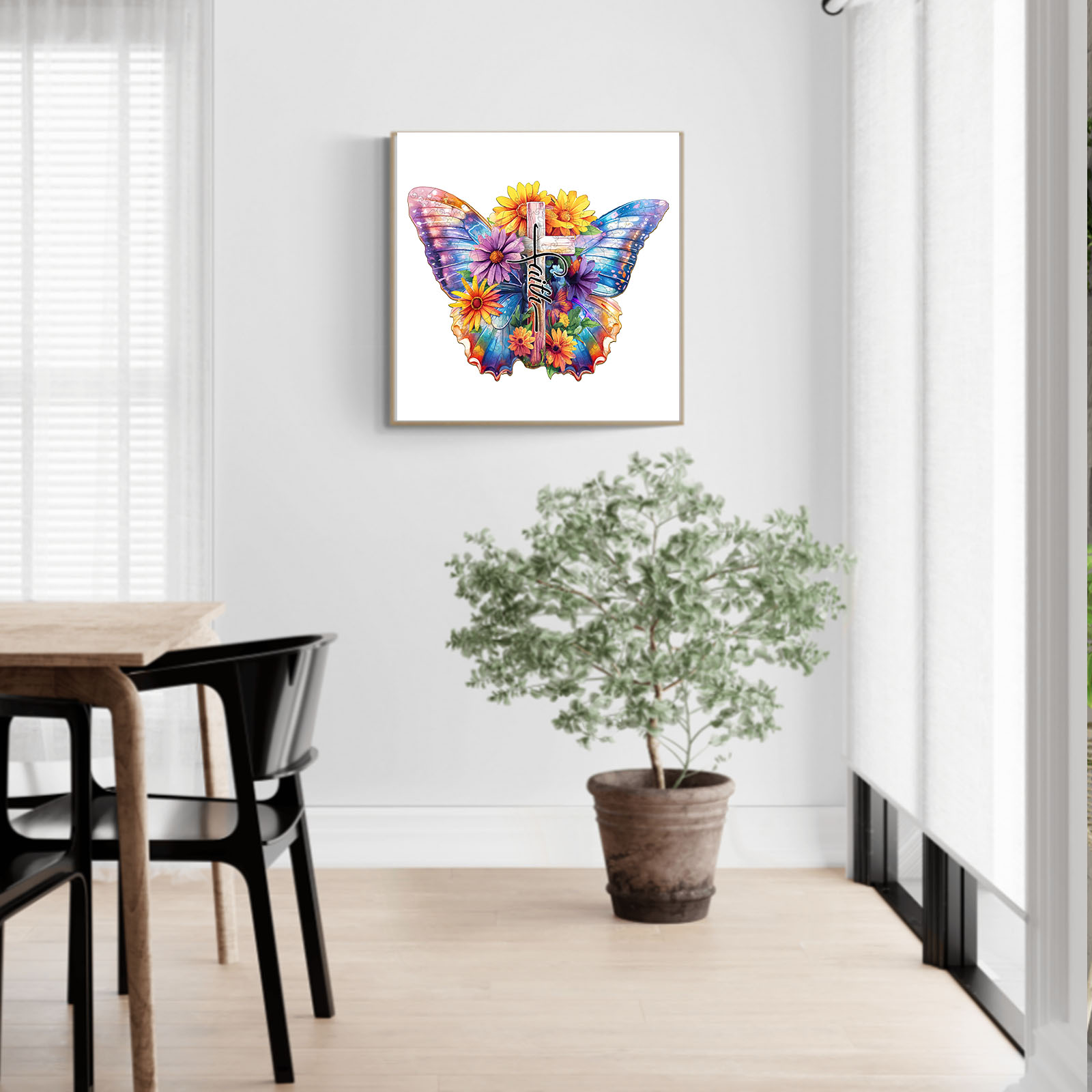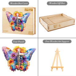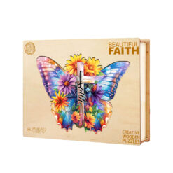 Embrace faith and beauty with this uplifting Kaayee wooden puzzle. This uniquely shaped puzzle features a vibrant butterfly with wings painted in a kaleidoscope of blues, purples, and oranges, symbolizing transformation and hope. Centered amidst a burst of colorful sunflowers and daisies is a wooden cross, with the word “faith” elegantly carved into it. This intricate design beautifully blends natural splendor with spiritual symbolism. Each precision-cut wooden piece contributes to the rich details and harmonious blend of elements, promising a challenging yet incredibly rewarding assembly experience. Perfect for those who appreciate meaningful art, spiritual themes, and the rewarding challenge of a high-quality wooden puzzle.