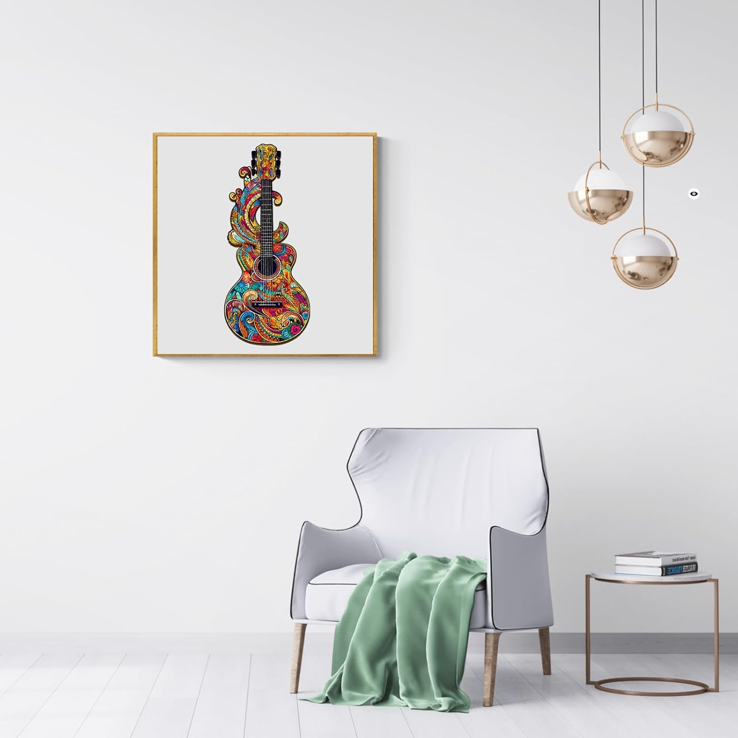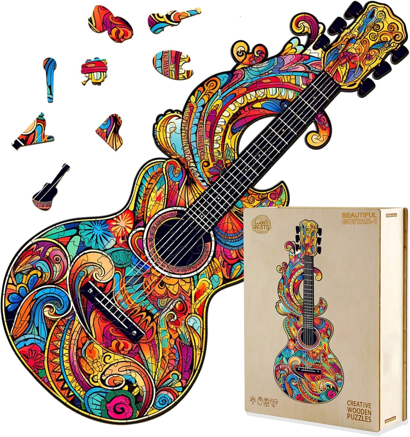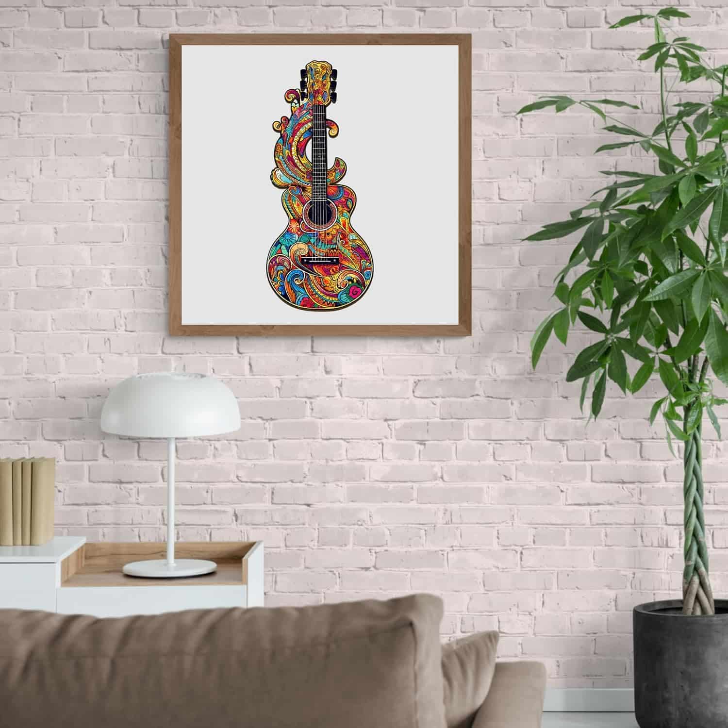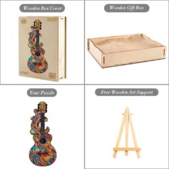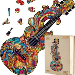 The Beautiful Guitar wooden puzzle showcases a vibrant, intricately designed guitar adorned with swirling patterns and bold, colorful motifs. The artistic blend of warm and cool tones creates a dynamic and eye-catching piece, perfect for those who appreciate music and art. Every curve and detail of the guitar is highlighted by elaborate designs, giving the puzzle a unique and lively appeal. Crafted from premium wood, the puzzle offers a durable and enjoyable experience. This creative and vibrant design makes it a wonderful challenge for puzzle enthusiasts and music lovers alike