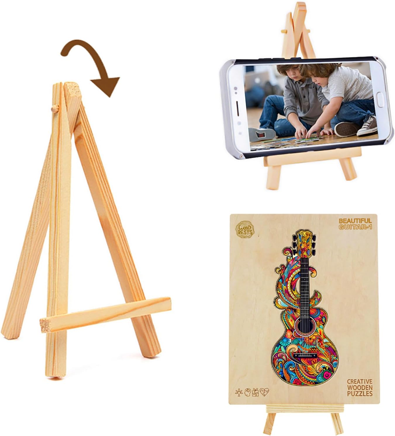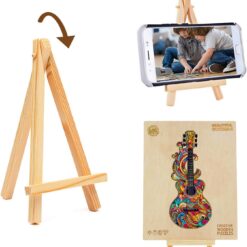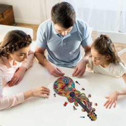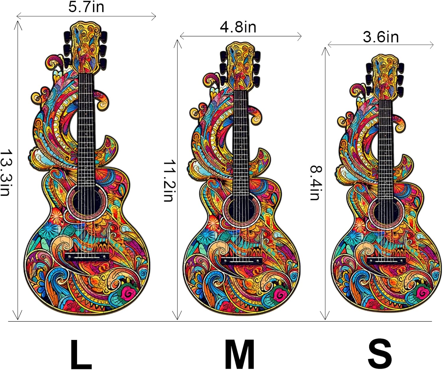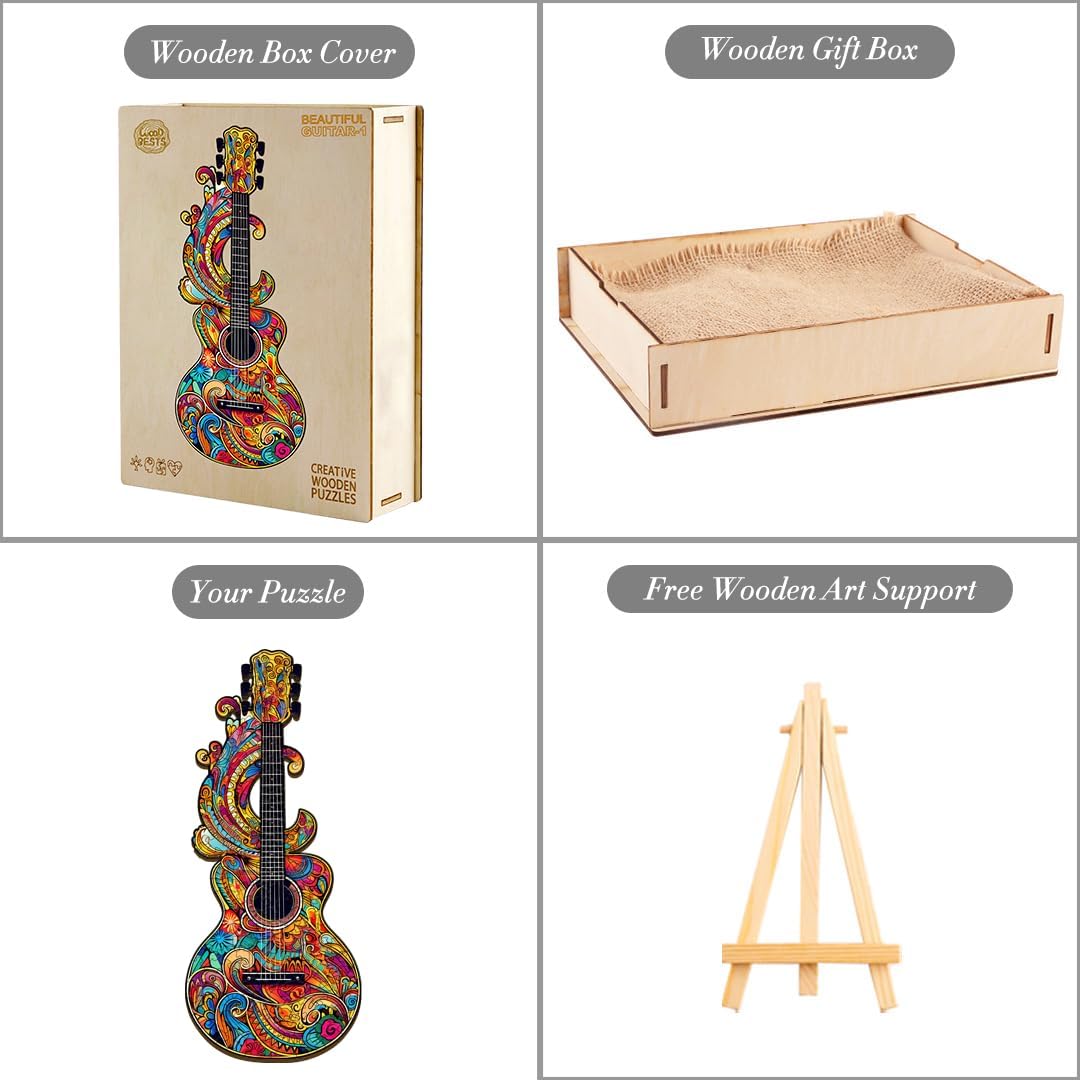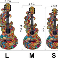 The Beautiful Guitar wooden puzzle showcases a vibrant, intricately designed guitar adorned with swirling patterns and bold, colorful motifs. The artistic blend of warm and cool tones creates a dynamic and eye-catching piece, perfect for those who appreciate music and art. Every curve and detail of the guitar is highlighted by elaborate designs, giving the puzzle a unique and lively appeal. Crafted from premium wood, the puzzle offers a durable and enjoyable experience. This creative and vibrant design makes it a wonderful challenge for puzzle enthusiasts and music lovers alike