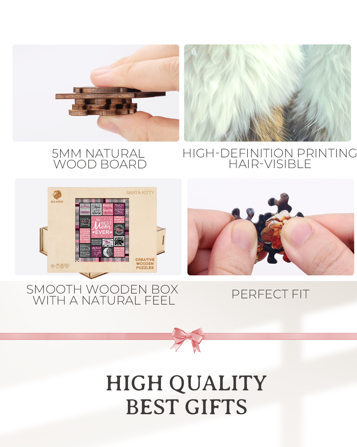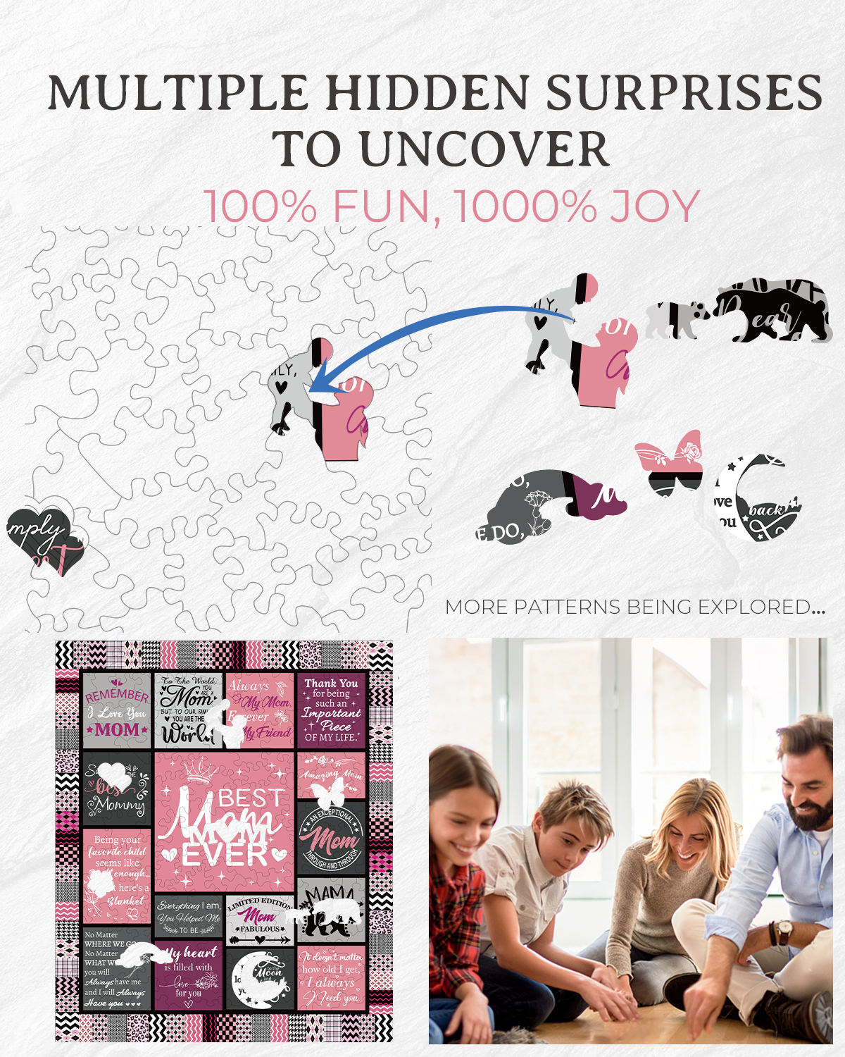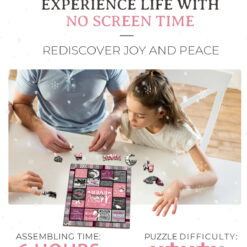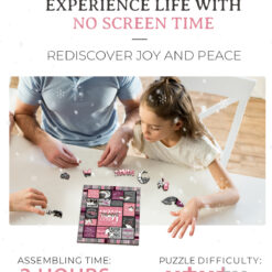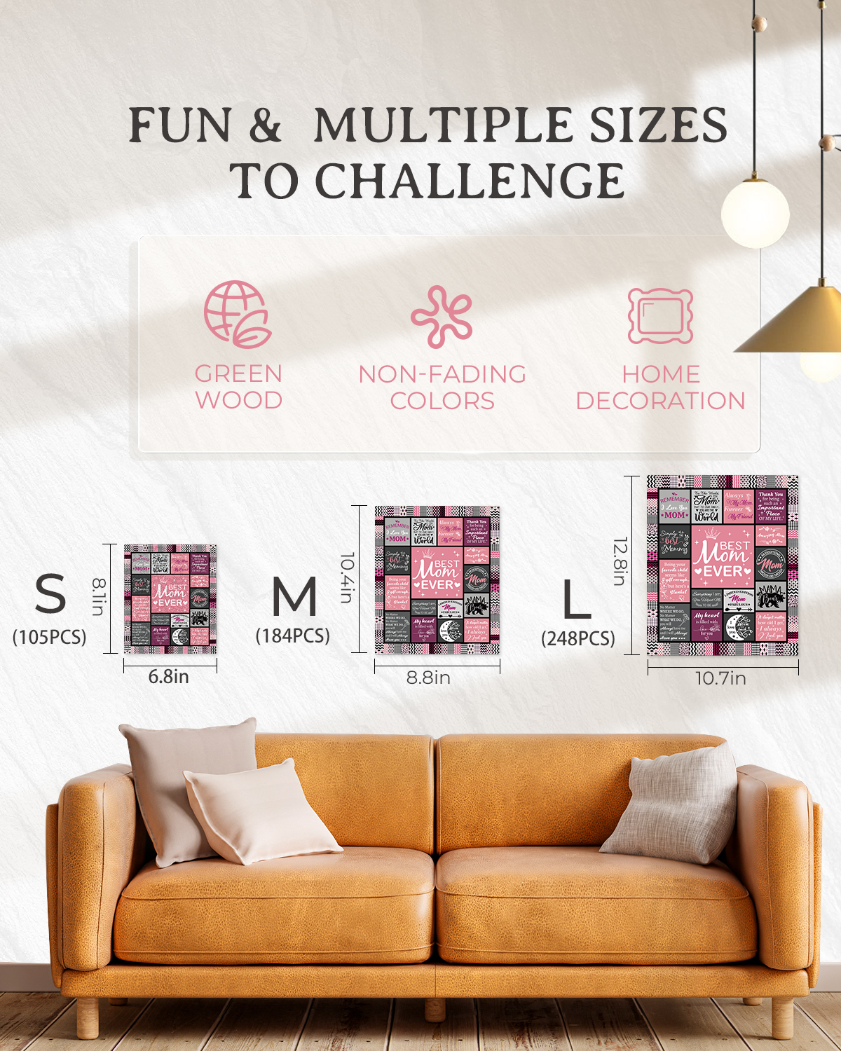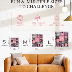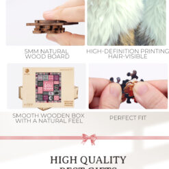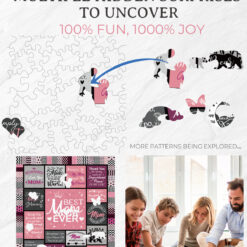 This heartwarming Kaayee wooden puzzle features a beautiful quilt-like design celebrating mothers. The puzzle is divided into numerous squares, each containing a unique and loving message or a charming graphic dedicated to “Mom,” such as “Best Mom Ever,” “Mama Bear,” and “Simply the best Mommy.” The pink, purple, and black color scheme gives the puzzle a cozy, sentimental feel. This is a perfect gift for Mother’s Day, a birthday, or any occasion to show appreciation for the moms in your life. The unique wooden pieces make this a special and lasting keepsake.