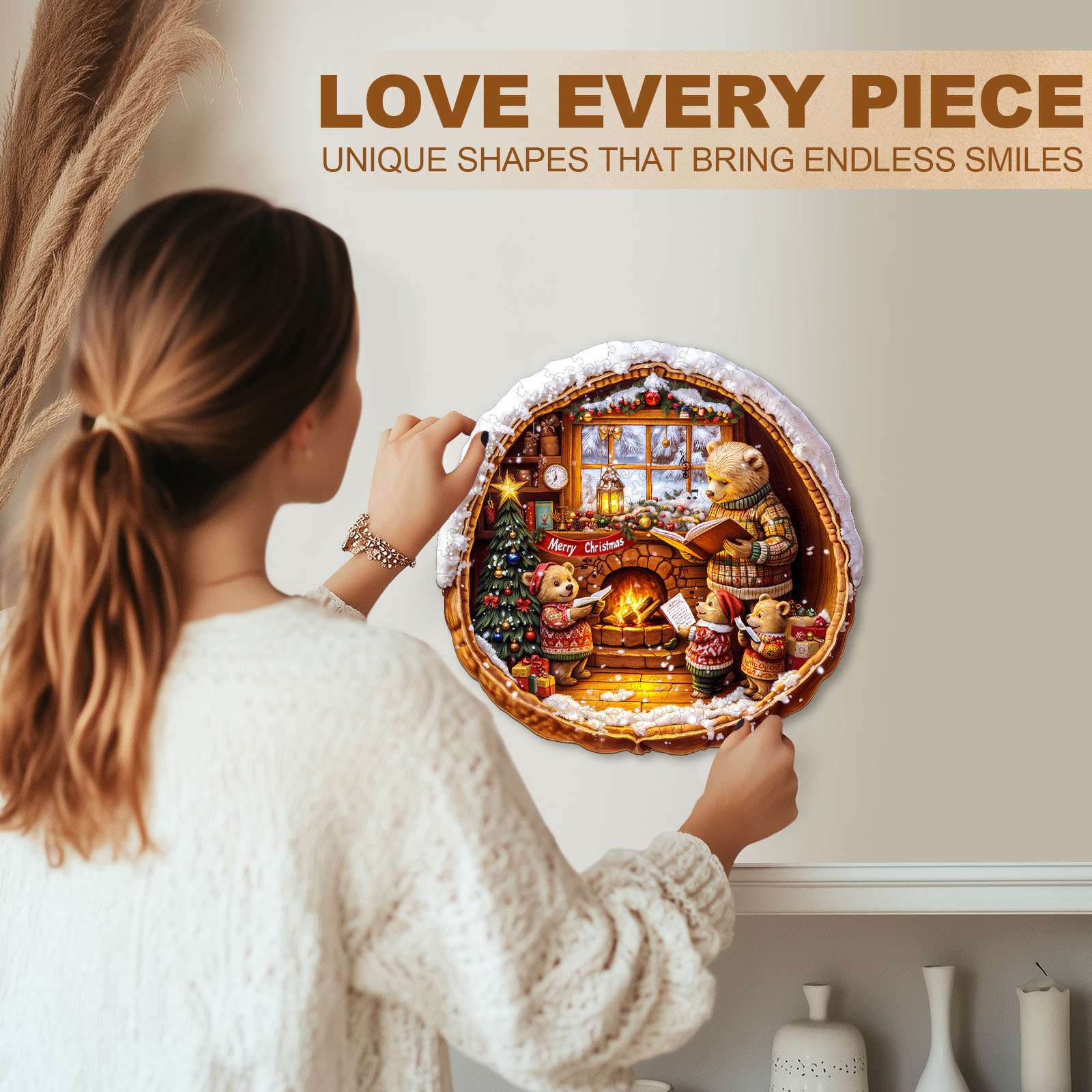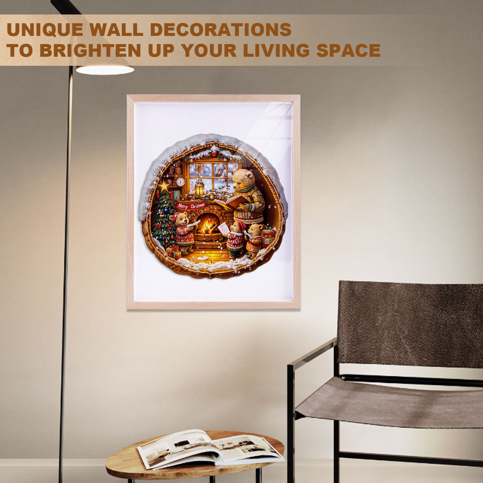 This charming Kaayee wooden puzzle features a cozy holiday scene set inside a hollowed-out log or a walnut shell. The image depicts a family of bears celebrating Christmas in their warm home, complete with a decorated tree, a roaring fireplace, and festive presents. A parent bear reads a book while three younger bears sing from sheet music. The puzzle’s unique circular shape and intricate details make it a delightful and challenging piece to assemble. It’s a perfect gift for families and anyone who loves the warm, festive spirit of the holiday season.