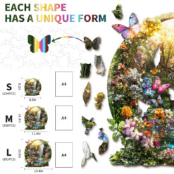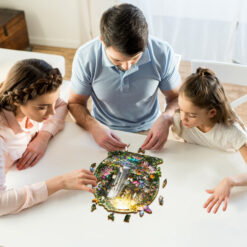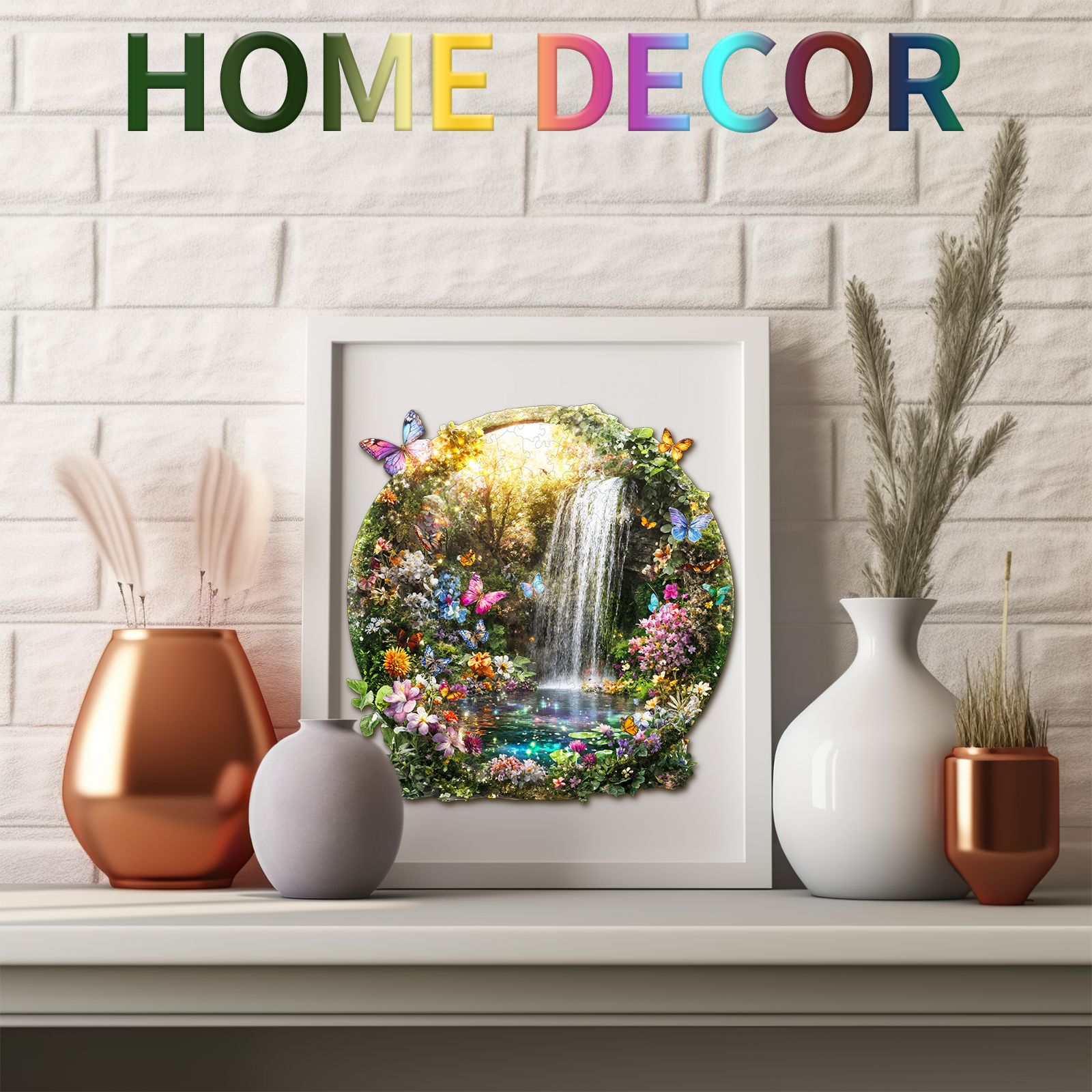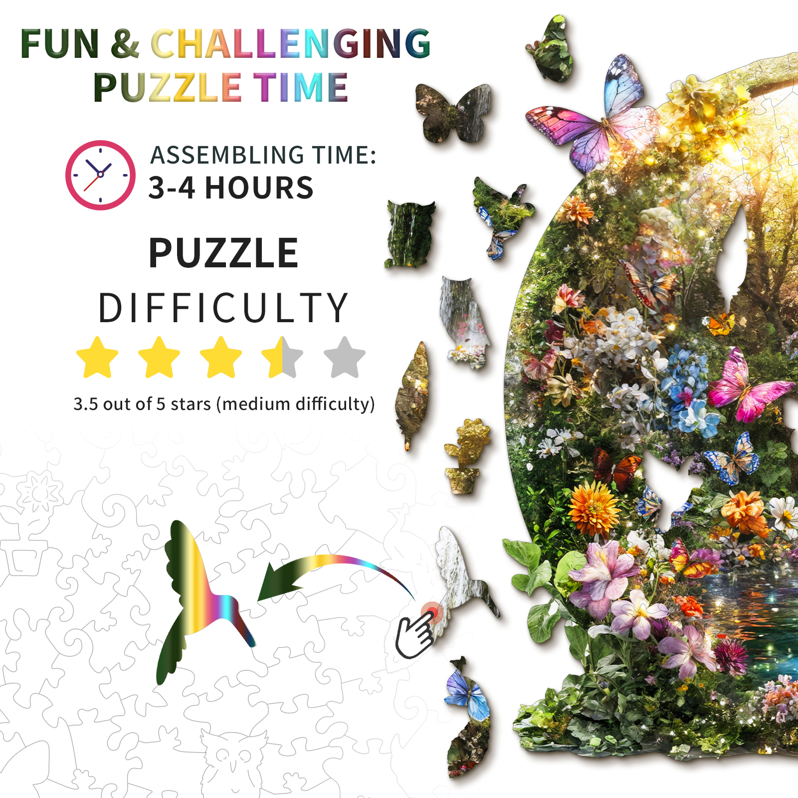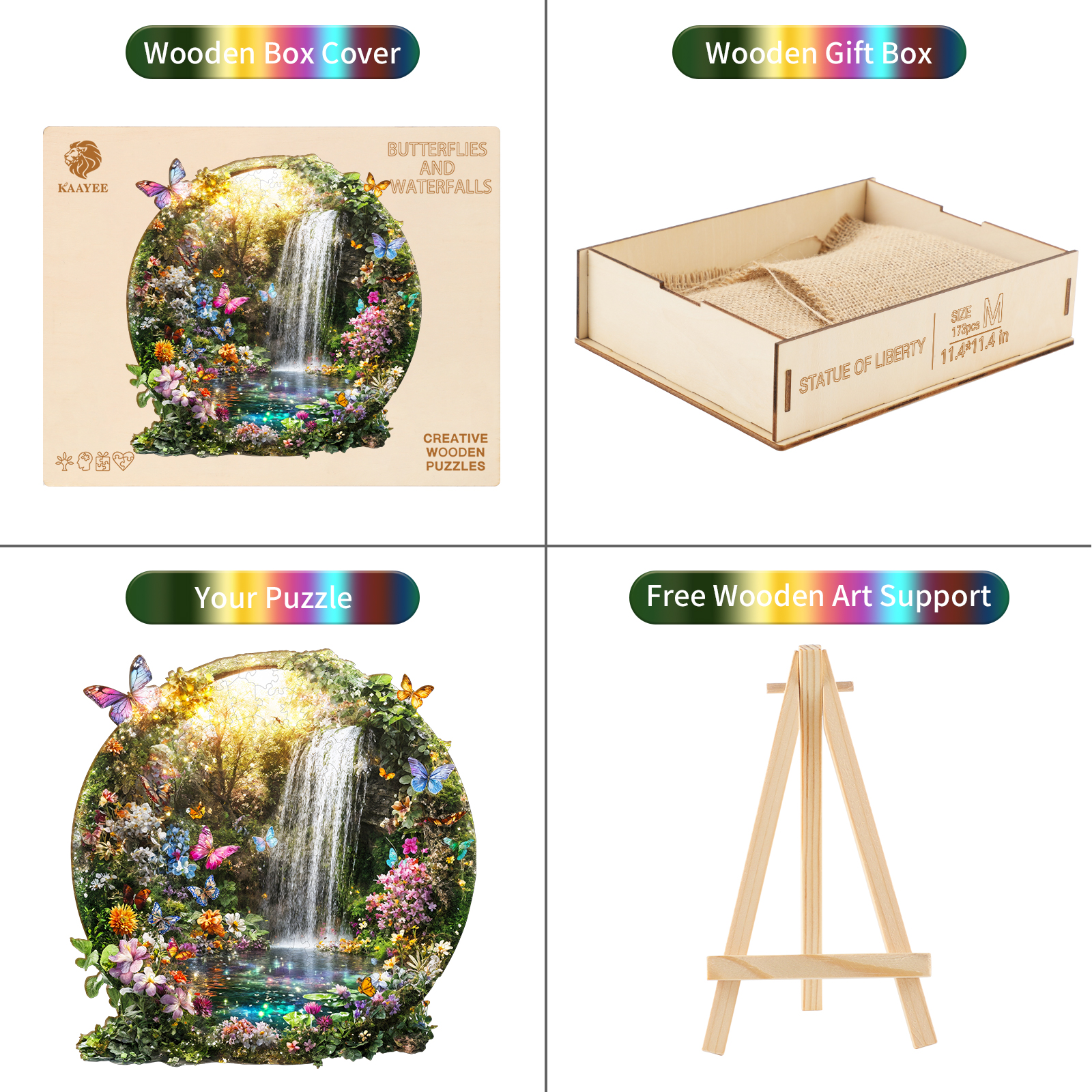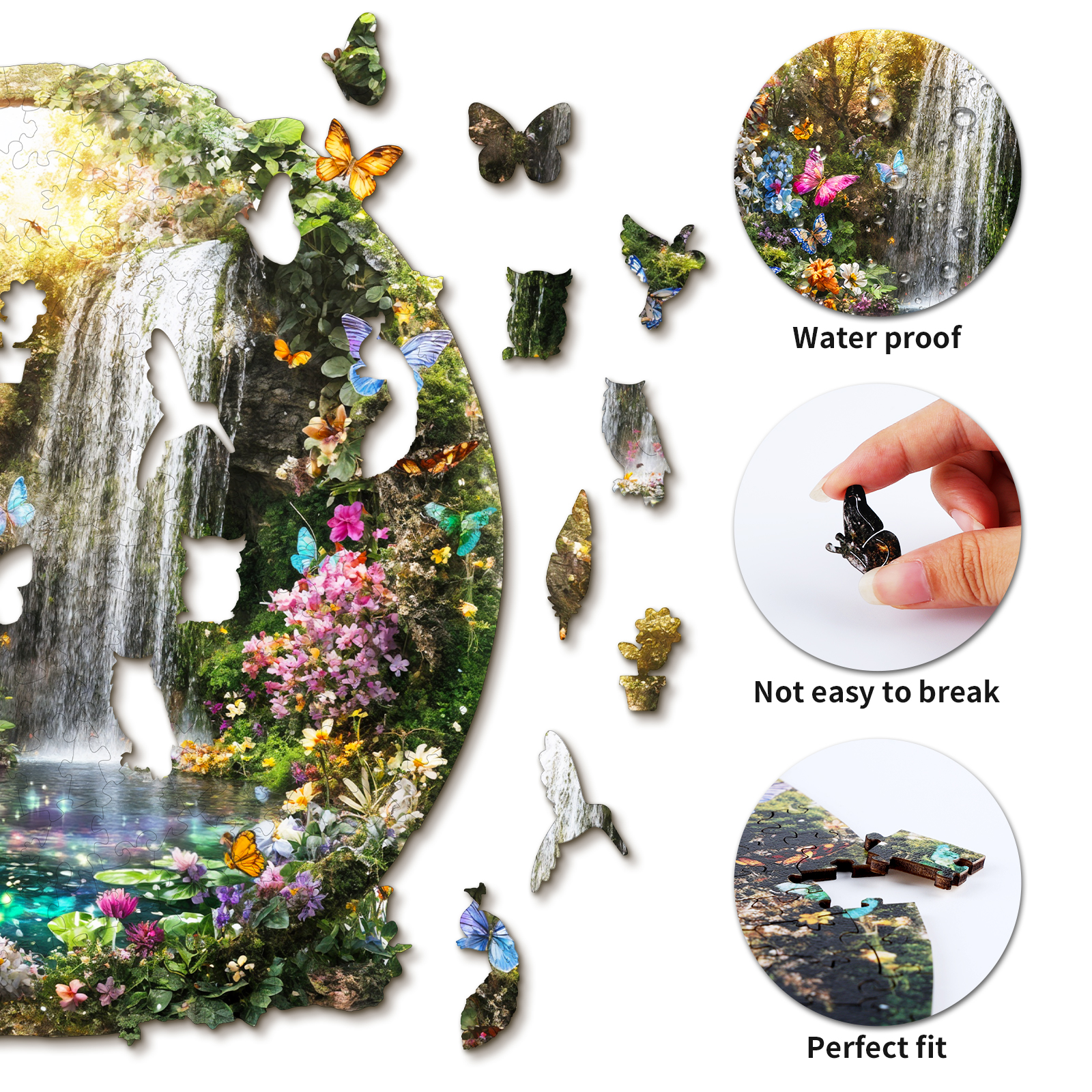 This vibrant Kaayee wooden puzzle captures the enchanting beauty of a magical secret garden, a truly immersive scene to piece together. At its heart lies a majestic waterfall cascading into a shimmering pond, reflecting the soft glow of what appears to be fireflies or sparkling sunlight. The entire circular frame is overflowing with an abundance of colorful flowers in full bloom, from delicate pinks and blues to warm oranges and yellows, creating a rich tapestry of flora. Numerous iridescent butterflies with wings in various shades of purple, pink, and blue flutter gracefully throughout the scene, adding to the whimsical atmosphere.