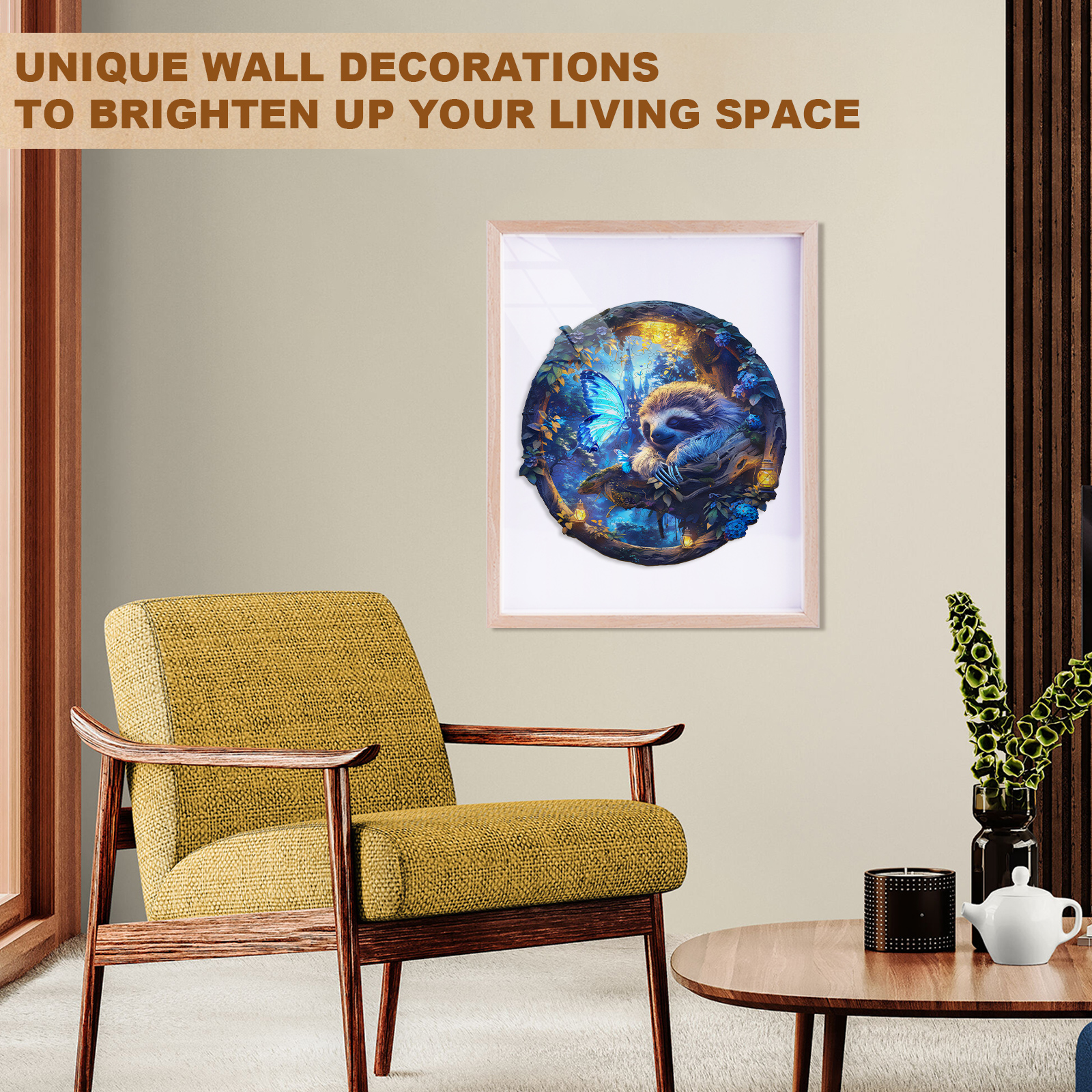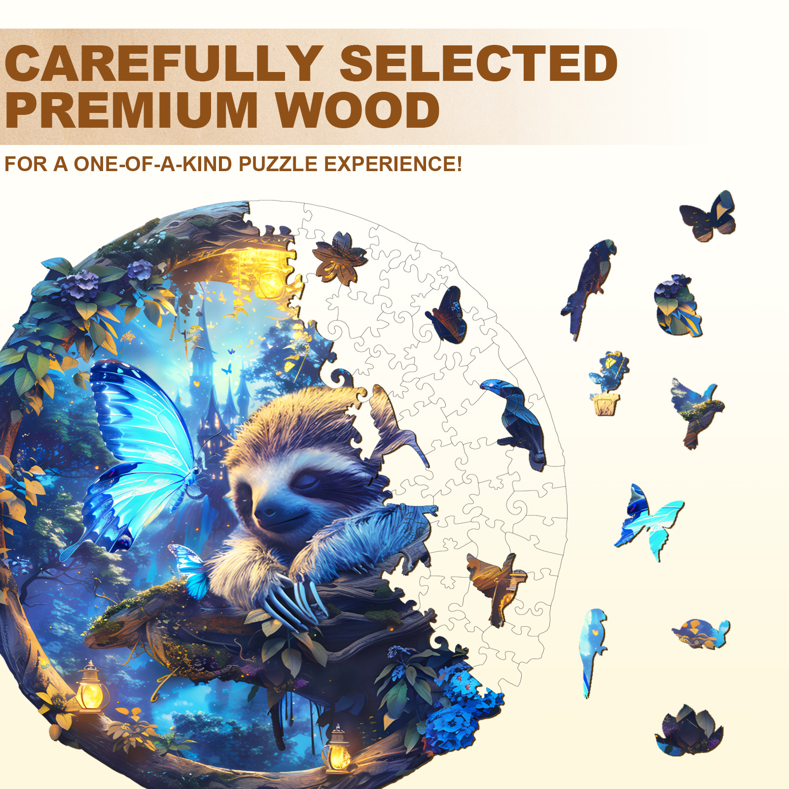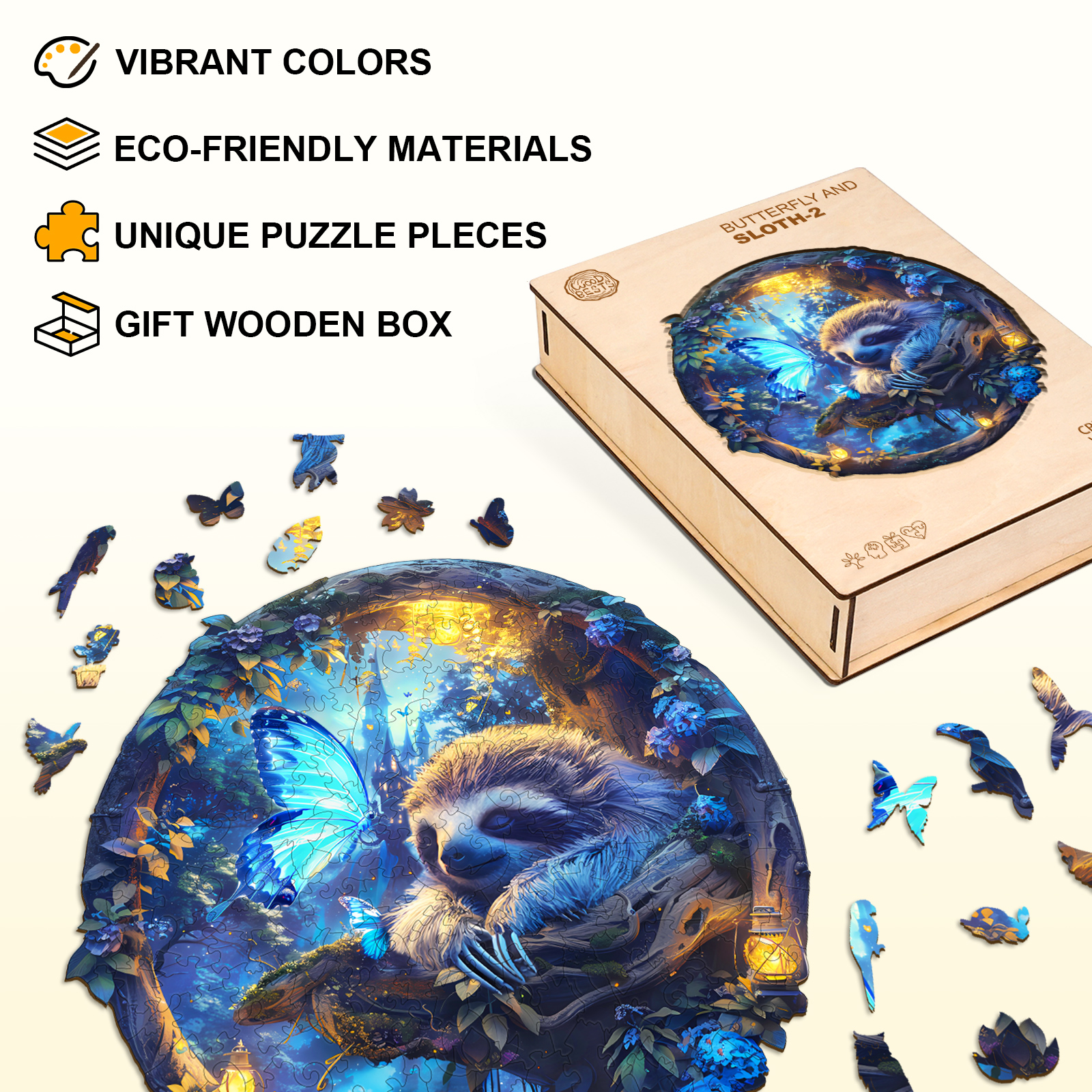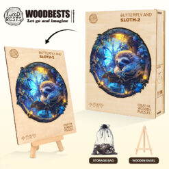 Drift into a world of wonder with the Kaayee Wooden Jigsaw Puzzle – Dreamy Sloth & Butterfly. This enchanting round puzzle captures a serene sloth resting among glowing lanterns and vibrant blue blossoms, while luminous butterflies bring a touch of magic to the forest night. Crafted from premium wood, each piece is precisely cut to ensure a satisfying fit and a smooth assembling experience. A blend of relaxation and artistry, this puzzle is perfect for nature lovers, dreamers, and anyone who enjoys a calming escape into imaginative worlds.
