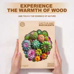 This beautiful Kaayee wooden puzzle features a vibrant and unique arrangement of various cacti and succulents. The intricate design showcases a rich palette of greens, pinks, yellows, and blues, highlighting the diverse textures and forms of these desert plants. The puzzle’s high-quality, irregular-shaped pieces fit together to create a stunning botanical artwork. This challenging and visually appealing puzzle is a perfect choice for nature lovers and puzzle enthusiasts seeking a unique and rewarding experience.