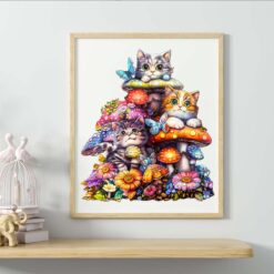 In a whimsical forest clearing, three kittens frolic atop a cluster of colorful mushrooms. The vibrant caps, painted in shades of red, blue, and yellow, create a fantastical playground for the curious trio. One kitten, a fluffy orange tabby, bats at a fluttering butterfly, its eyes wide with excitement. A sleek black kitten pounces from one mushroom to another, its graceful movements almost dance-like. The third, a white kitten with a tiny pink nose, tumbles off a mushroom and lands softly in the lush grass, only to spring back up with boundless energy. The scene is alive with their playful meows and the gentle rustle of the forest around them