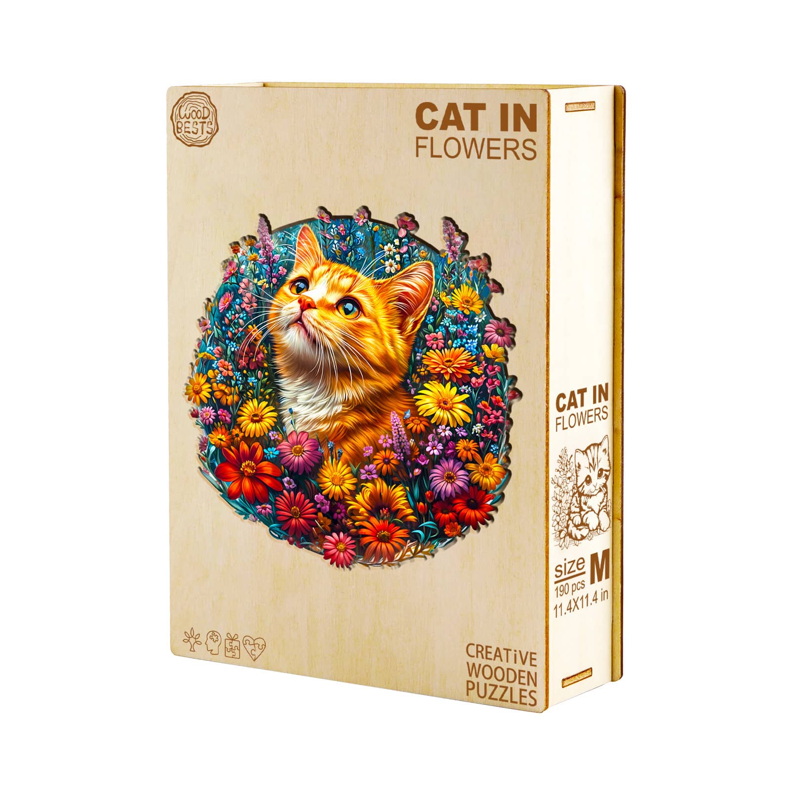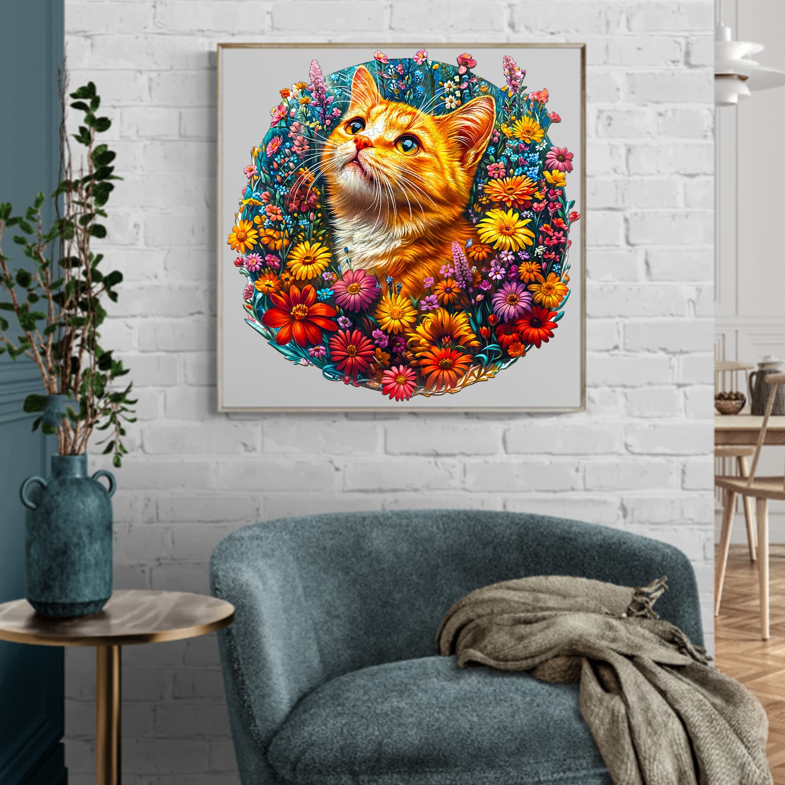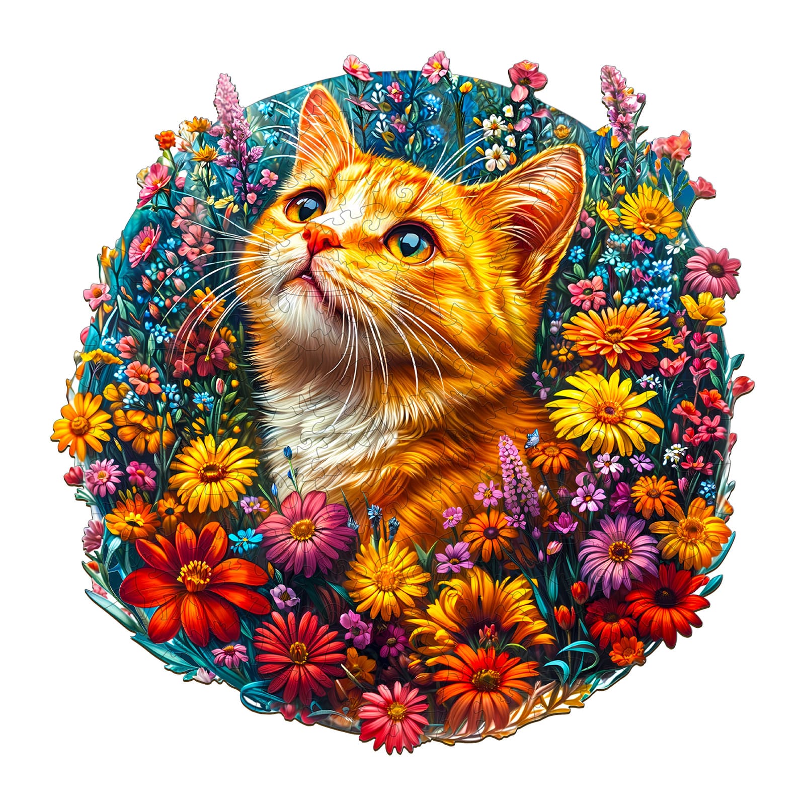 This wooden jigsaw puzzle features a delightful and colorful scene of a curious orange cat surrounded by a beautiful array of vibrant flowers. The intricate details of both the cat and the flowers come together in this circular design, creating a charming and peaceful atmosphere. Crafted from high-quality wood, the puzzle pieces fit together seamlessly, offering both a relaxing challenge and a visually stunning result. Once completed, the puzzle transforms into a heartwarming piece of art that captures the beauty of nature and the innocence of a cat, making it perfect for display or gifting.