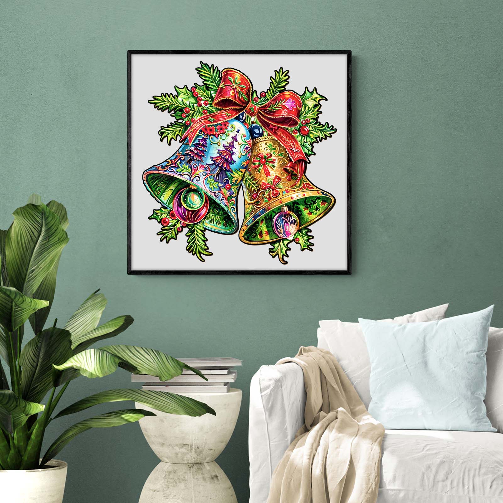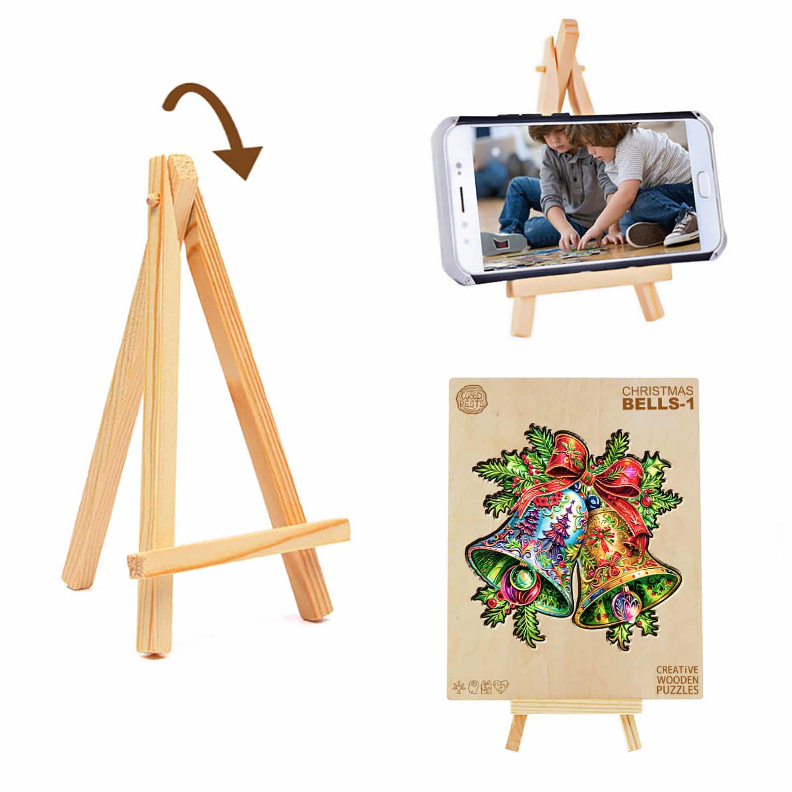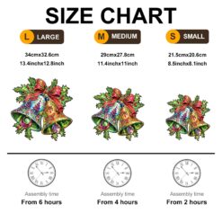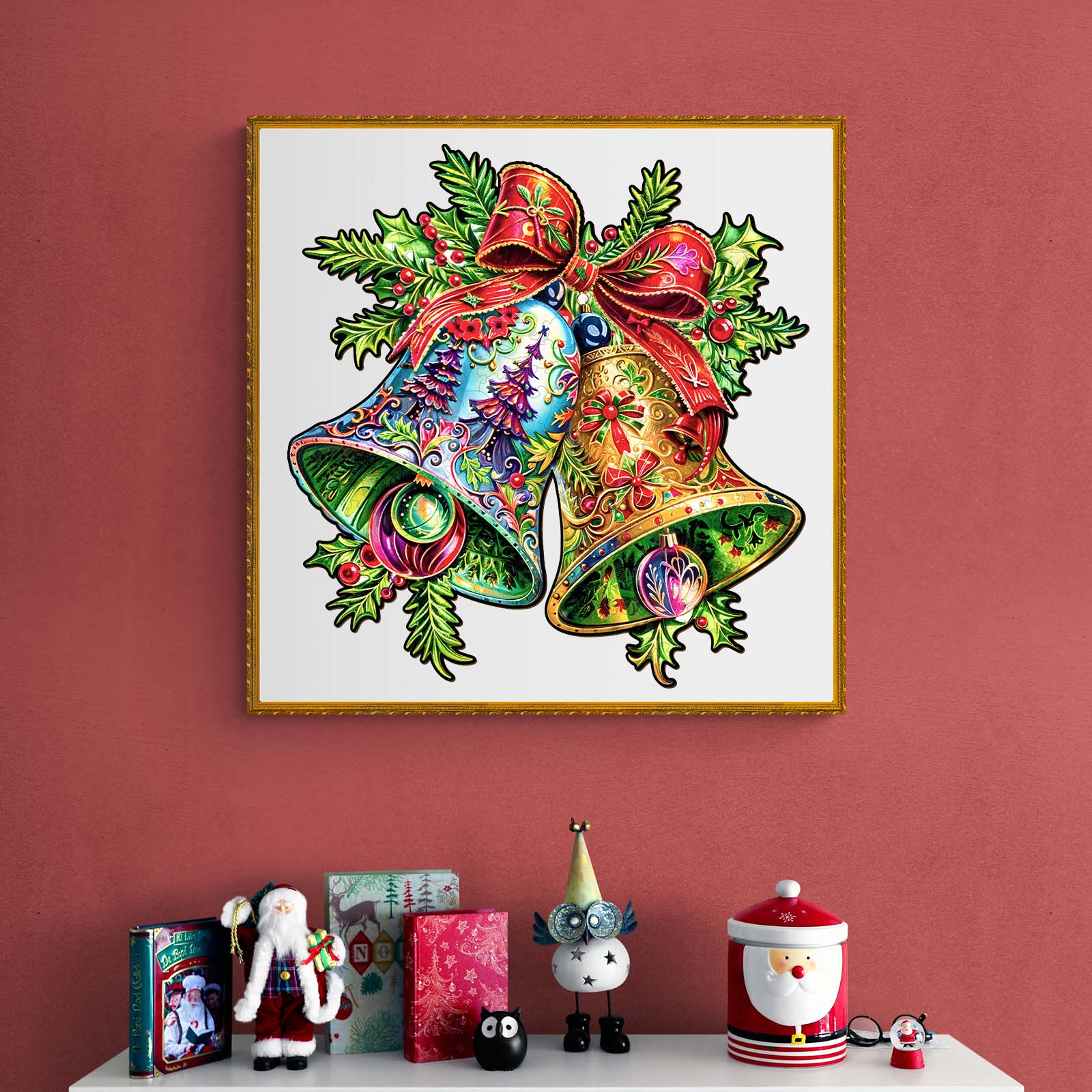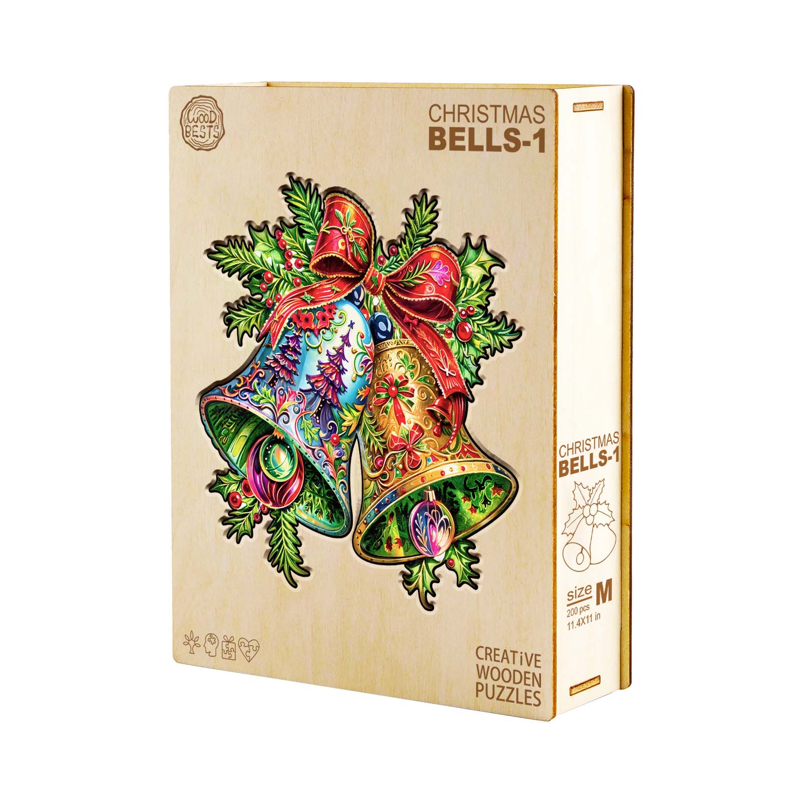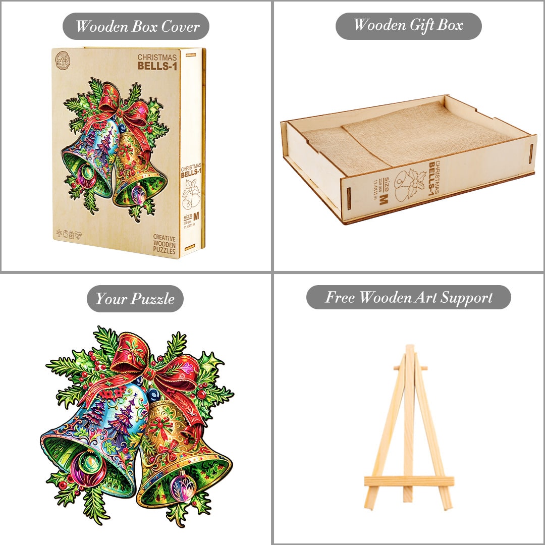Celebrate the holiday season with this Christmas Bells wooden puzzle, featuring two ornate bells adorned with intricate designs. Tied together with a festive red ribbon and surrounded by holly leaves and berries, these bells bring a joyful touch to any holiday display. One bell glows with rich gold hues, while the other pops with vibrant blues and Christmas tree details. Crafted with attention to detail, this puzzle makes a perfect seasonal decoration or gift, adding a burst of color and Christmas spirit to any setting. Assemble this piece for a fun and festive activity.