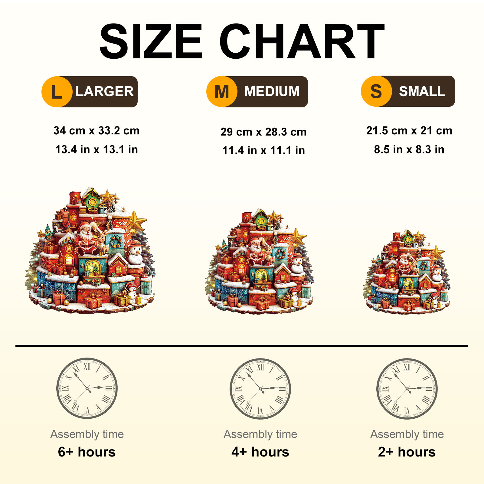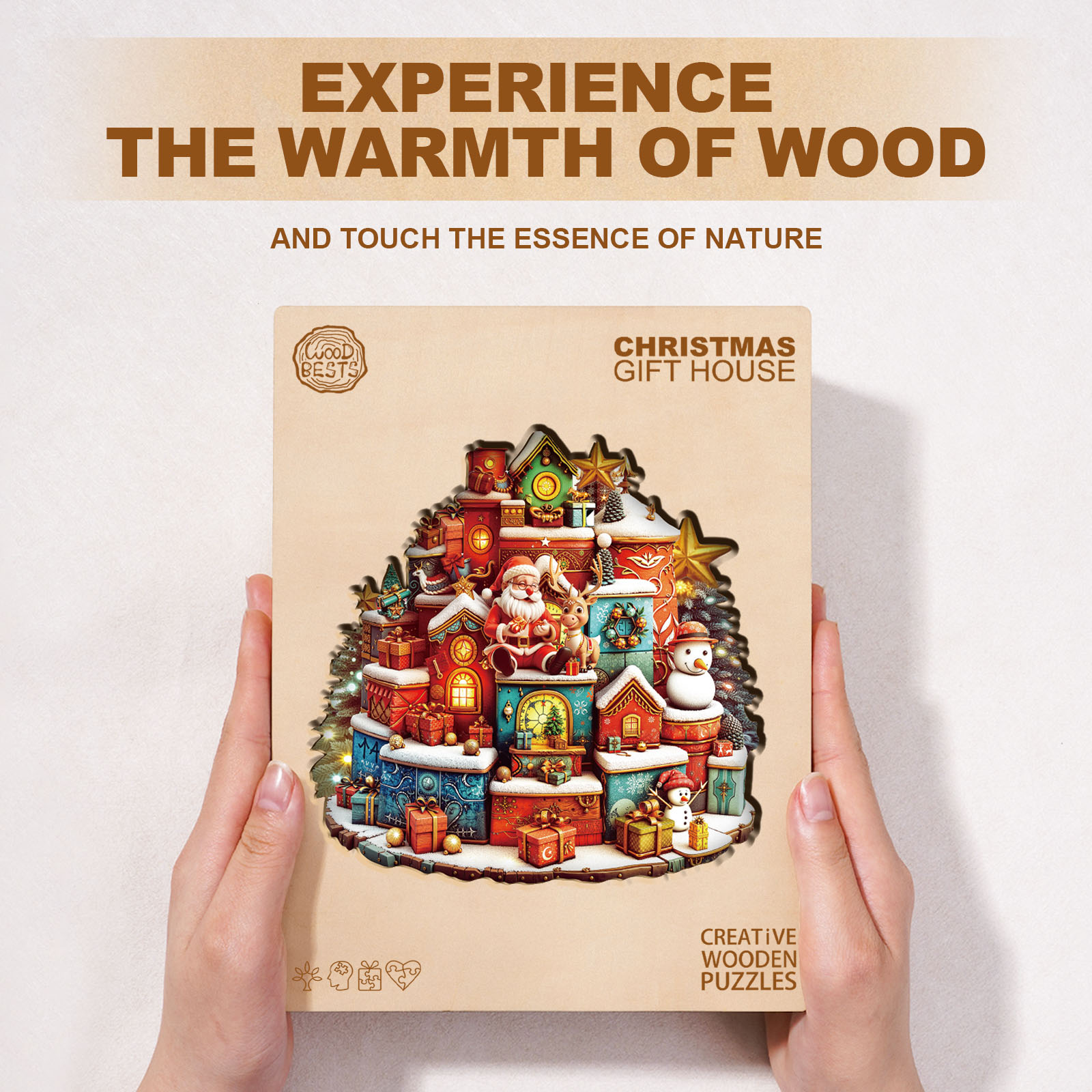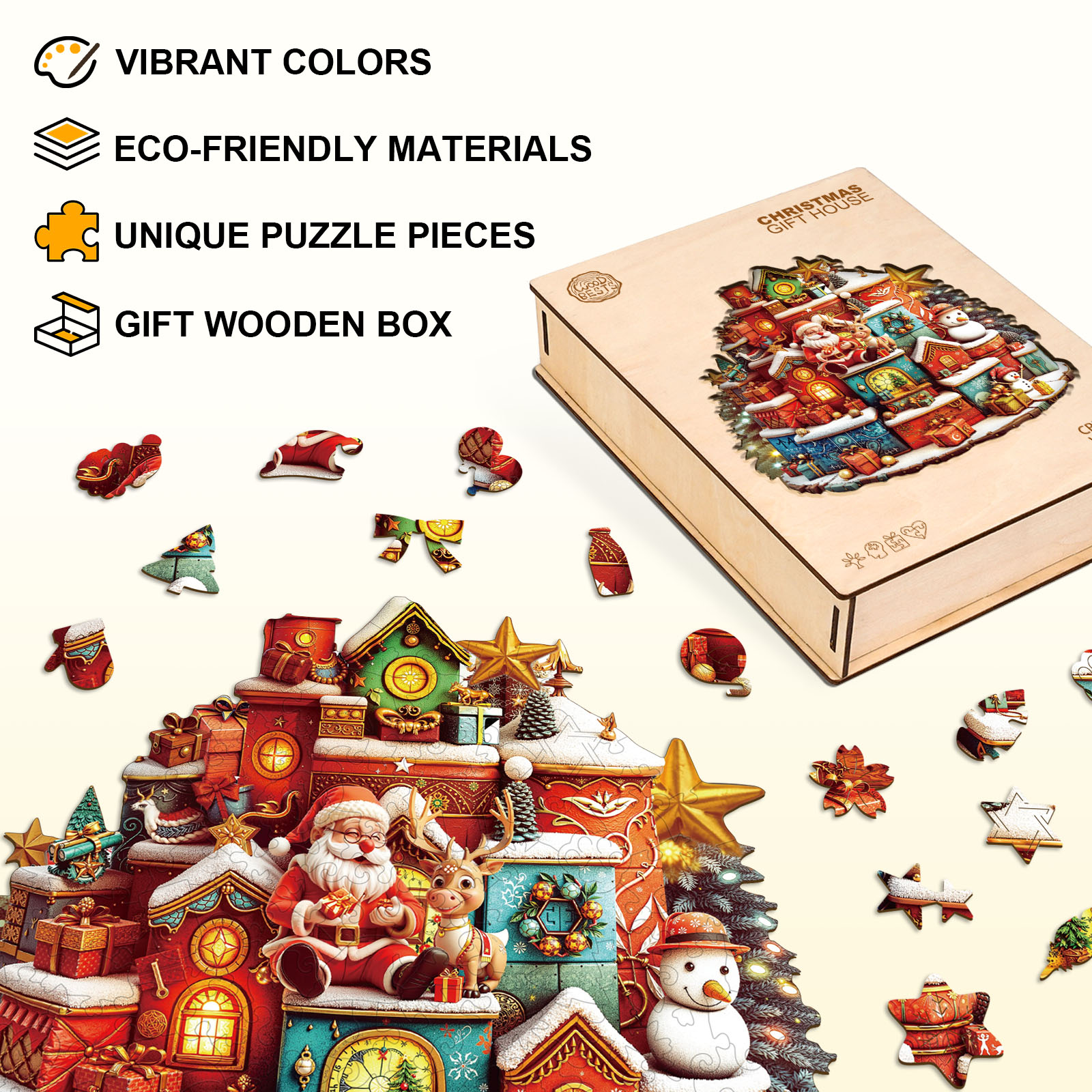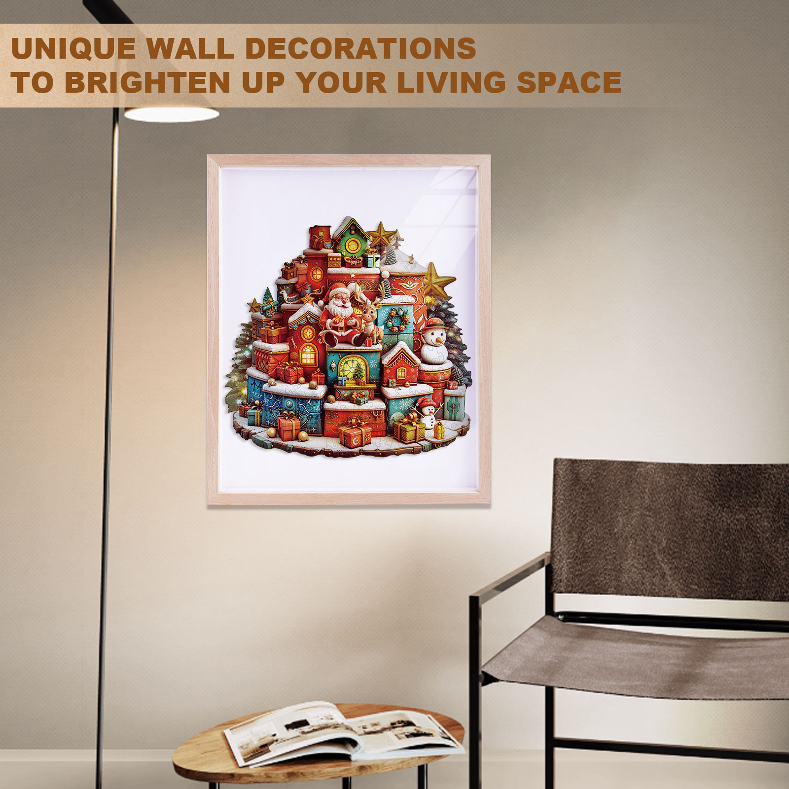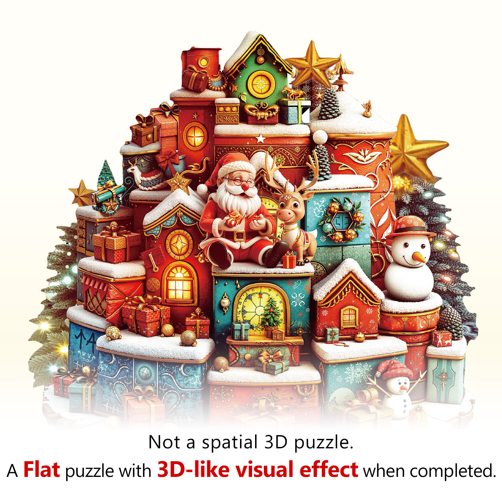 This delightful Kaayee wooden puzzle features a whimsical Christmas scene of a house built from a stack of wrapped gifts. The design shows Santa Claus and a reindeer sitting atop the colorful, snow-dusted presents, while a friendly snowman stands nearby. The gifts themselves are decorated with ribbons, bows, and festive patterns, with some having glowing windows that suggest they are tiny, cozy homes. The puzzle’s unique, irregular shape outlines the entire stack, making it a challenging and charming piece. It’s a perfect way to celebrate the holiday season and a wonderful gift for puzzle enthusiasts.