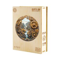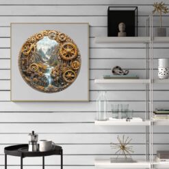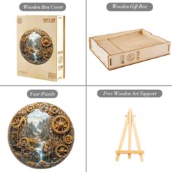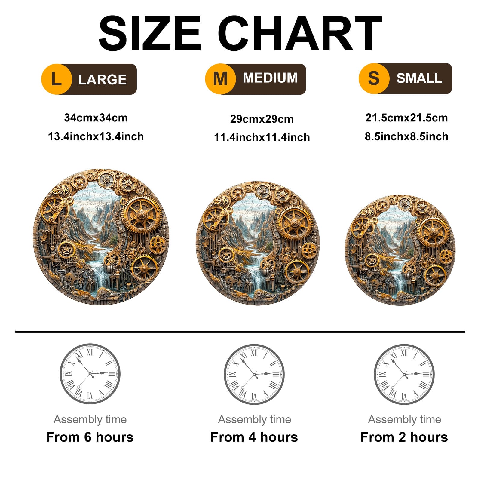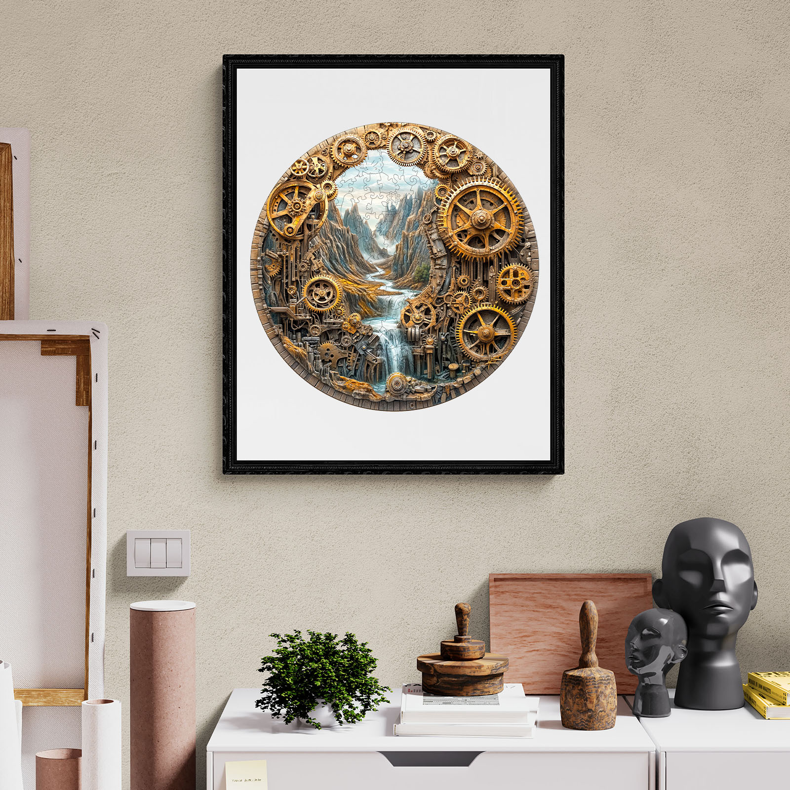 This exquisite wooden jigsaw puzzle features a captivating steampunk-inspired design, blending intricate golden gears with a breathtaking mountainous landscape. The circular frame seamlessly integrates mechanical elements with the natural beauty of cascading waterfalls and towering peaks, creating a mesmerizing fusion of industry and nature. Each wooden piece is precision-cut, offering a unique and engaging challenge for puzzle enthusiasts. Made from high-quality, eco-friendly materials, this puzzle is perfect for those who appreciate steampunk aesthetics, fantasy landscapes, and mechanical artistry. Once completed, it becomes a stunning decorative piece that embodies both innovation and adventure.