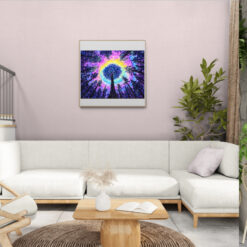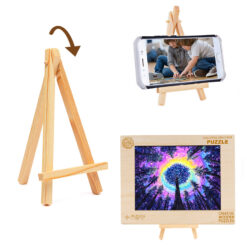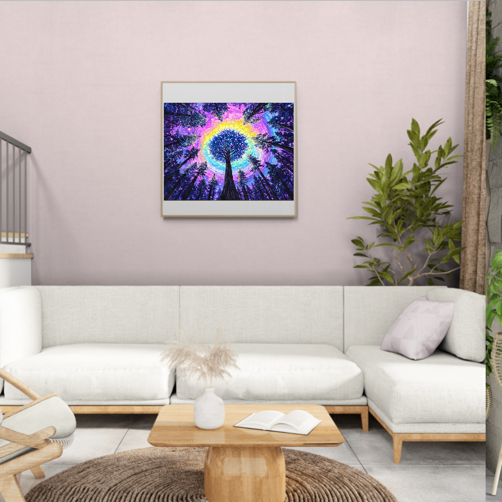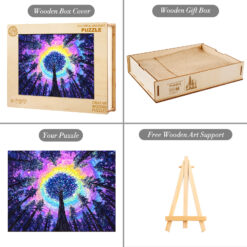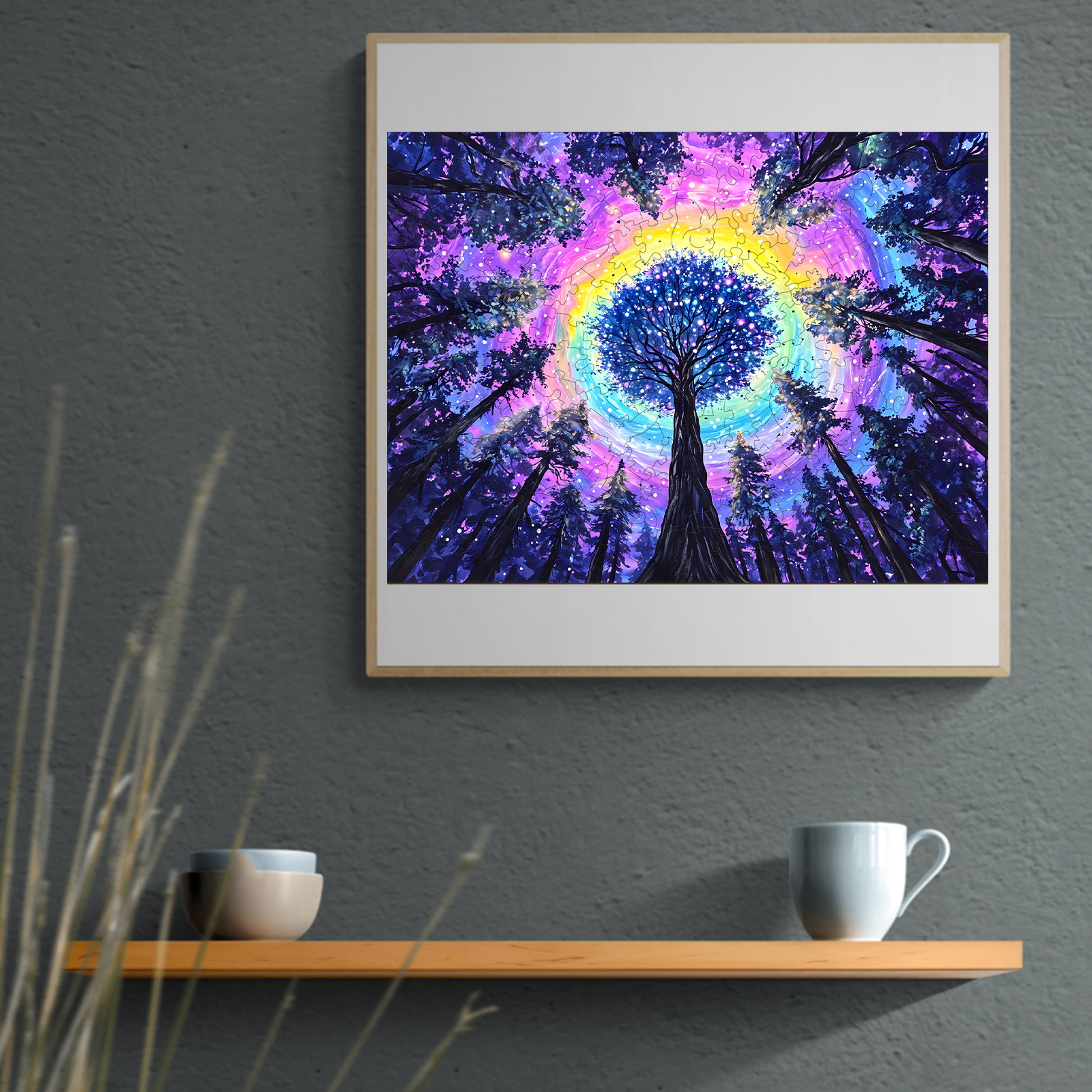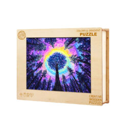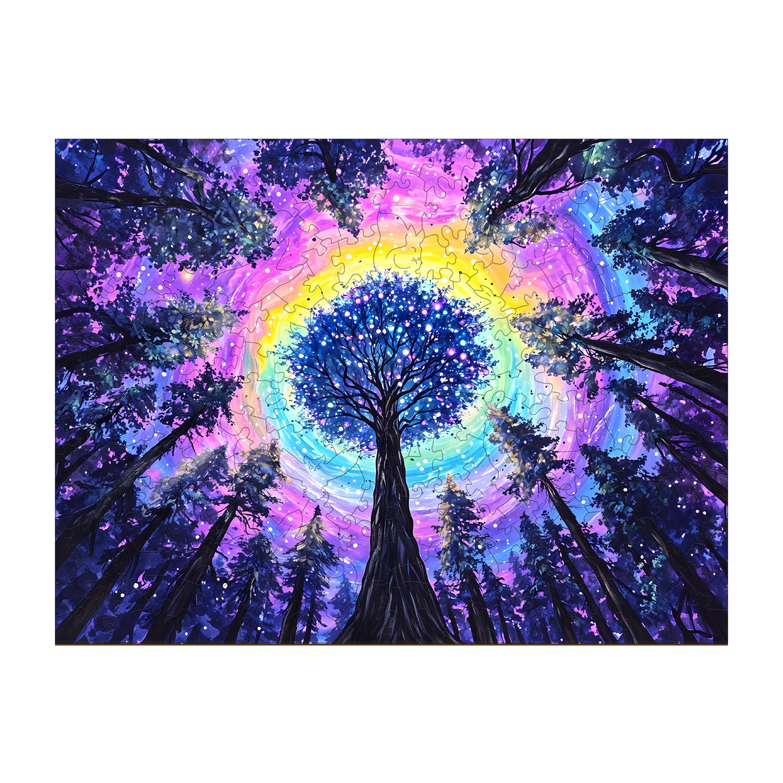 This wooden jigsaw puzzle features a stunning fantasy-style illustration of a vibrant, star-filled forest. The central tree reaches skyward, its glowing branches forming a luminous canopy surrounded by swirling colors of purple, blue, pink, and yellow, evoking a magical night sky. The upward perspective, with tall trees encircling the center, creates a captivating sense of depth and wonder. Made from high-quality wood, the puzzle pieces are precisely cut and durable, offering both a visually enchanting and satisfying hands-on experience—perfect for puzzle lovers and nature art enthusiasts alike.