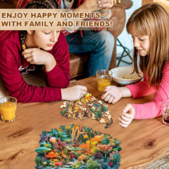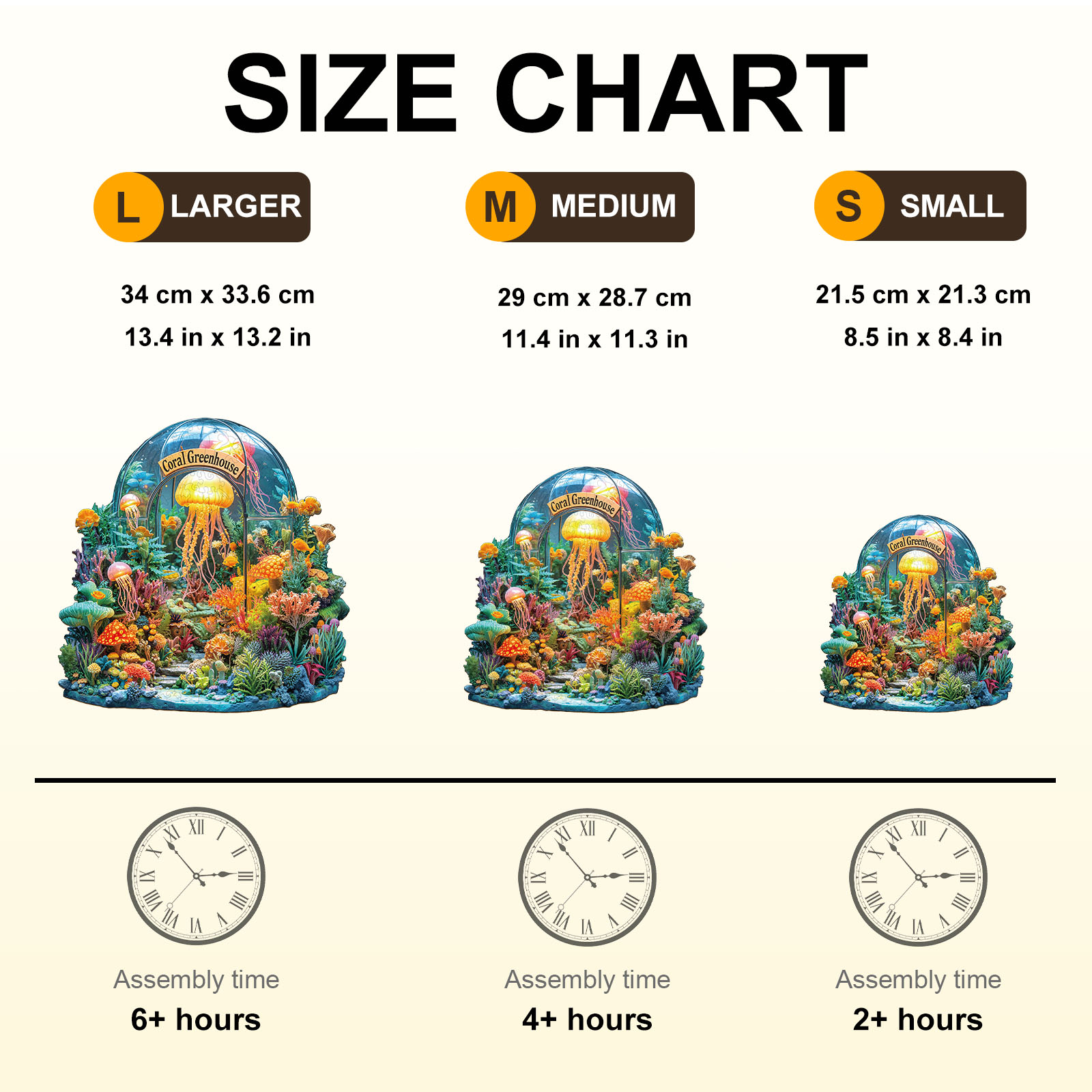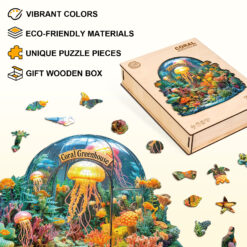 This beautiful Kaayee wooden puzzle features a vibrant and imaginative “Coral Greenhouse.” The puzzle’s design is a blend of a classic greenhouse structure and a fantastical underwater world. Inside the glass dome, a large, glowing jellyfish hangs like a chandelier, illuminating a lush landscape of colorful corals, anemones, and other unique marine life. Small fish swim through the scene, adding a sense of movement. The puzzle’s unique, irregular shape outlines the entire diorama, making it a challenging and visually stunning piece. This is a perfect gift for ocean lovers and anyone who enjoys a creative, high-quality, and magical puzzle experience.