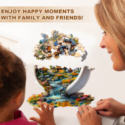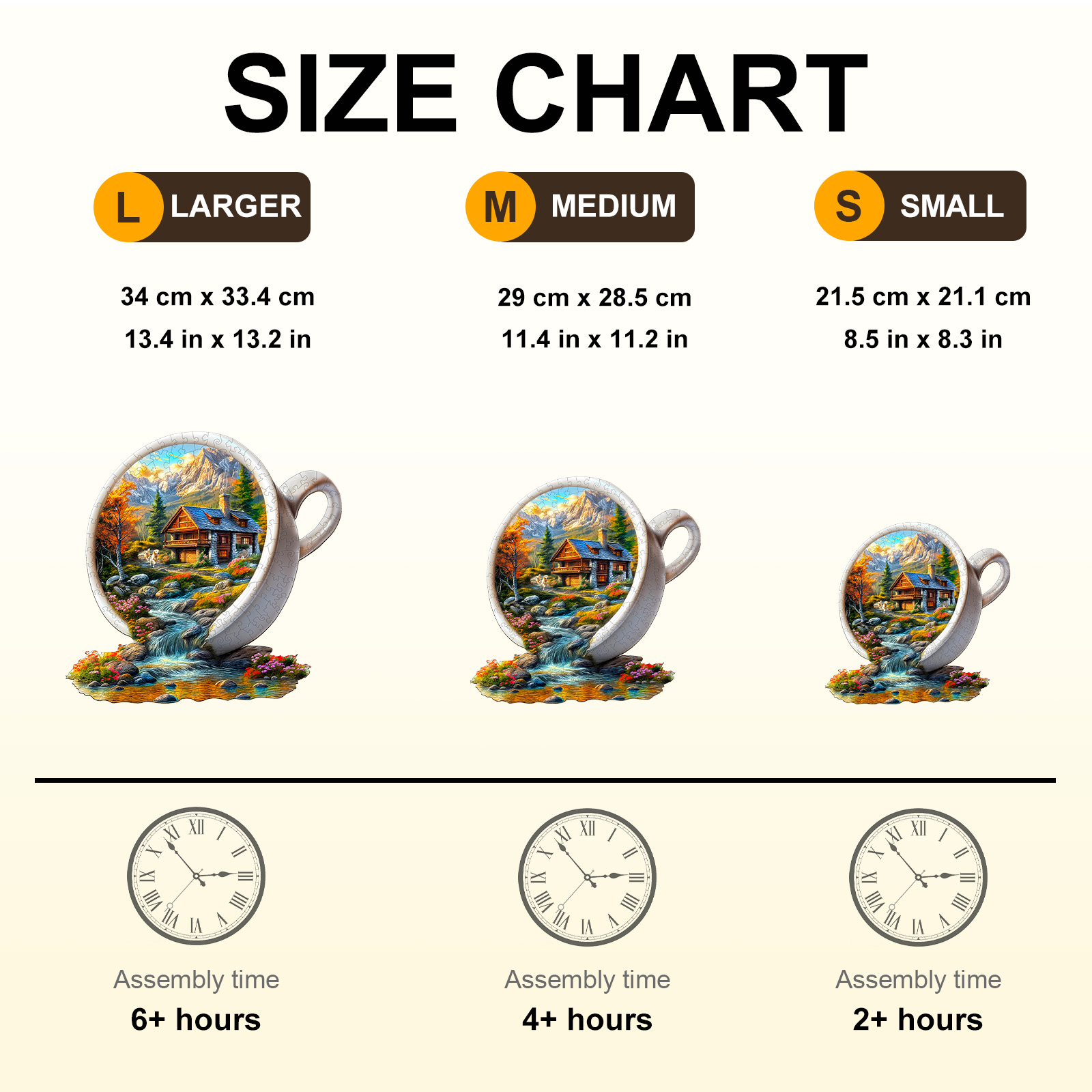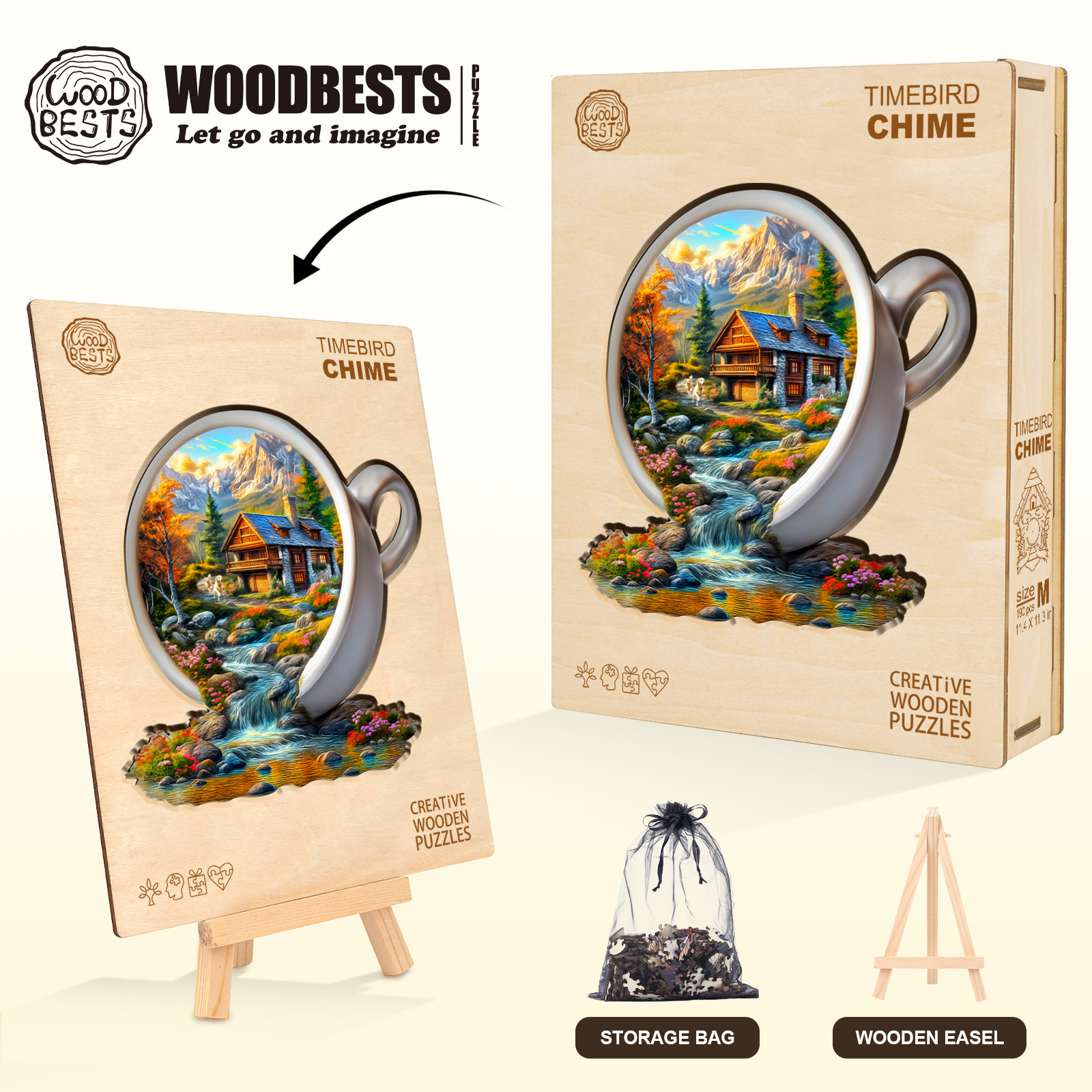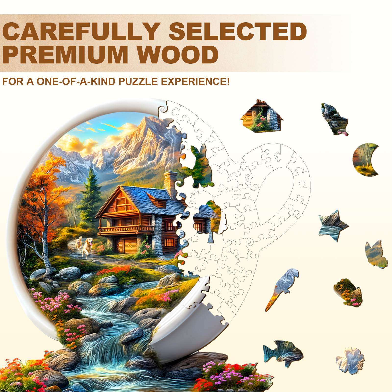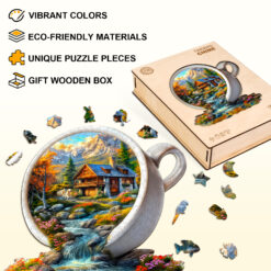 This is a stunning Kaayee wooden jigsaw puzzle featuring a tranquil cabin scene captured within the shape of a teacup. The intricate design showcases a cozy log cabin nestled in a mountainous landscape during autumn. A gentle stream flows past vibrant foliage and colorful flowers, creating a serene and picturesque image. This unique puzzle is a delightful challenge for puzzle lovers and a beautiful piece of art once completed, perfect for anyone who appreciates nature and creative design.