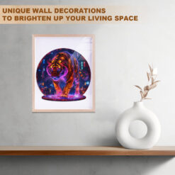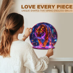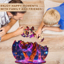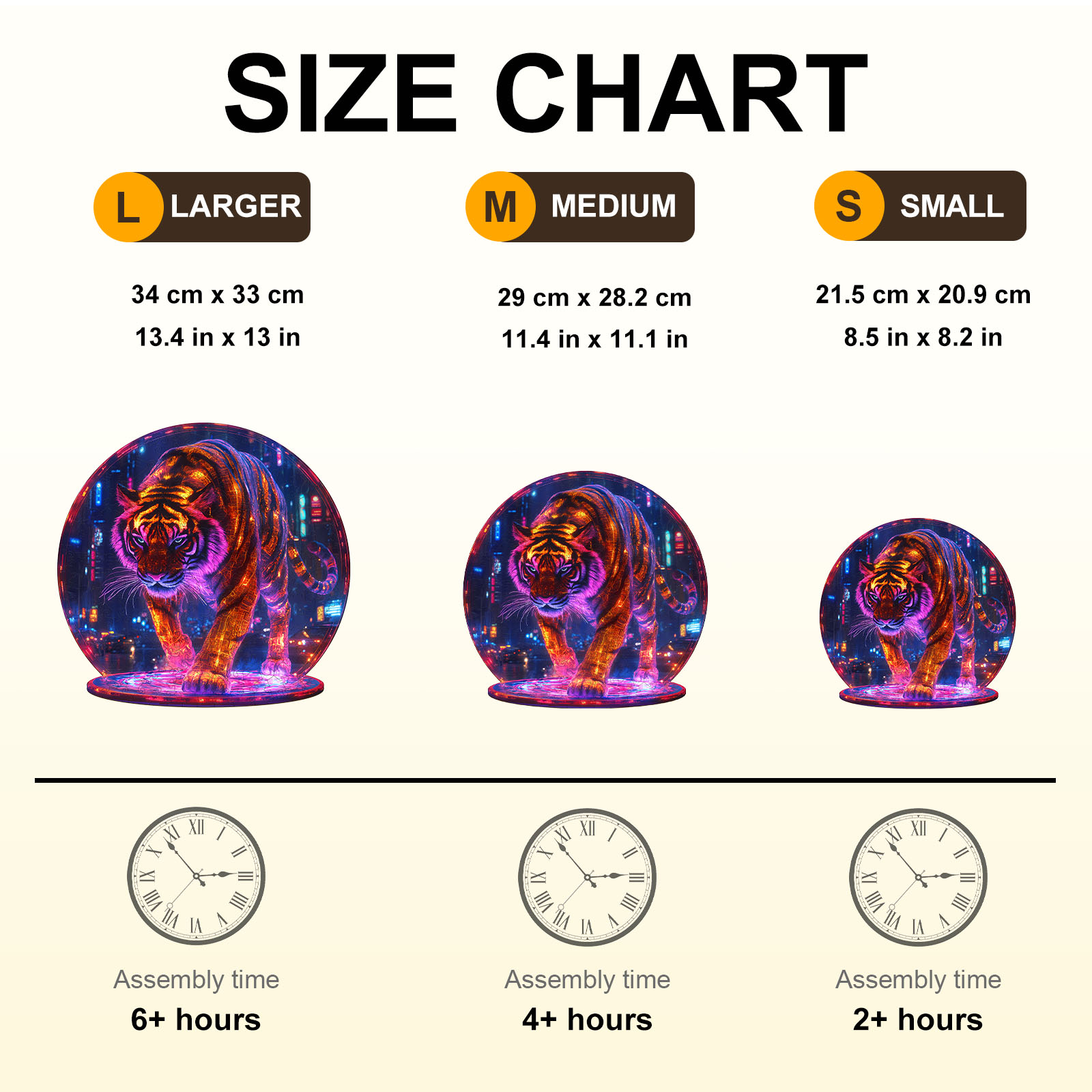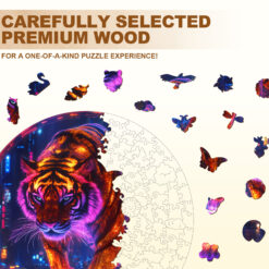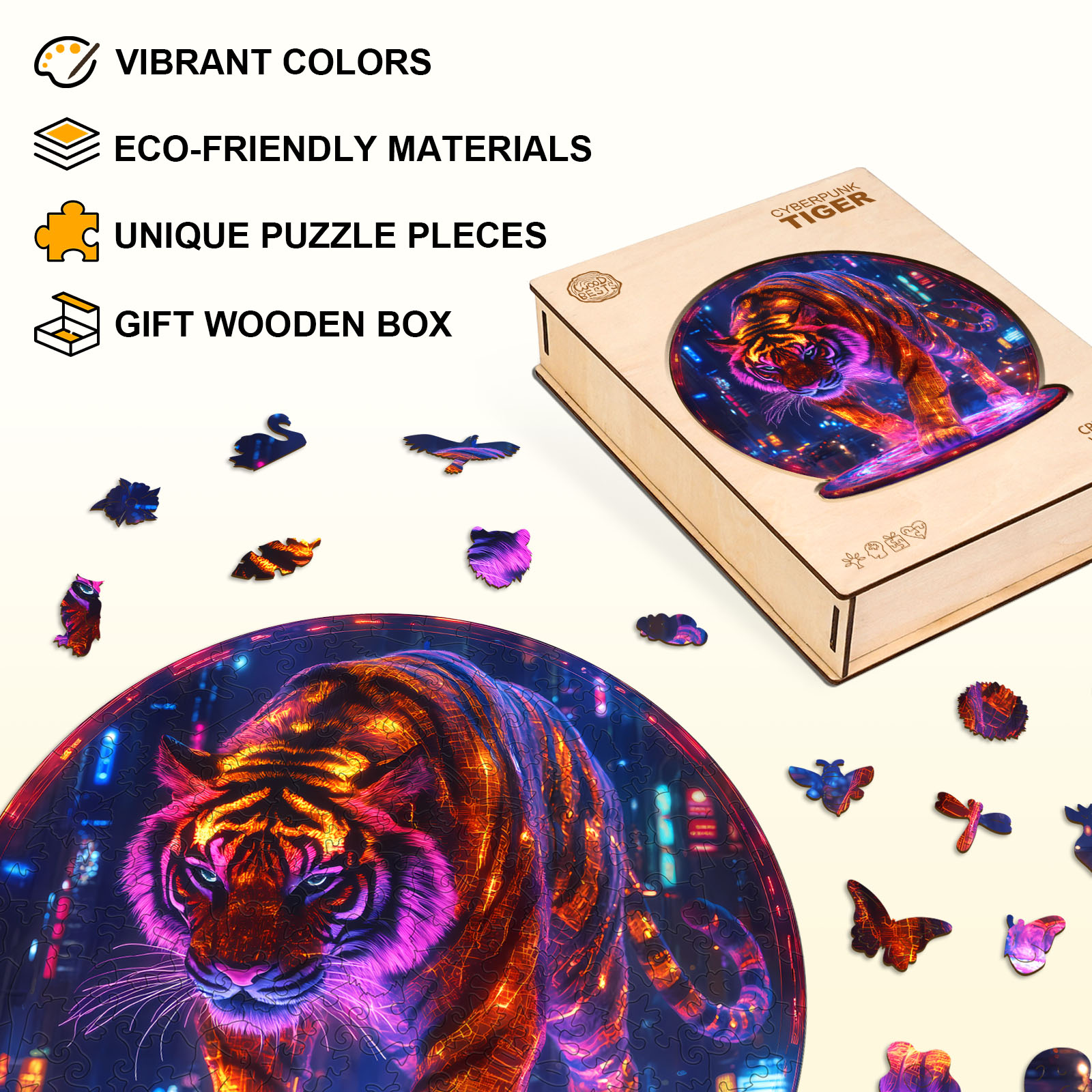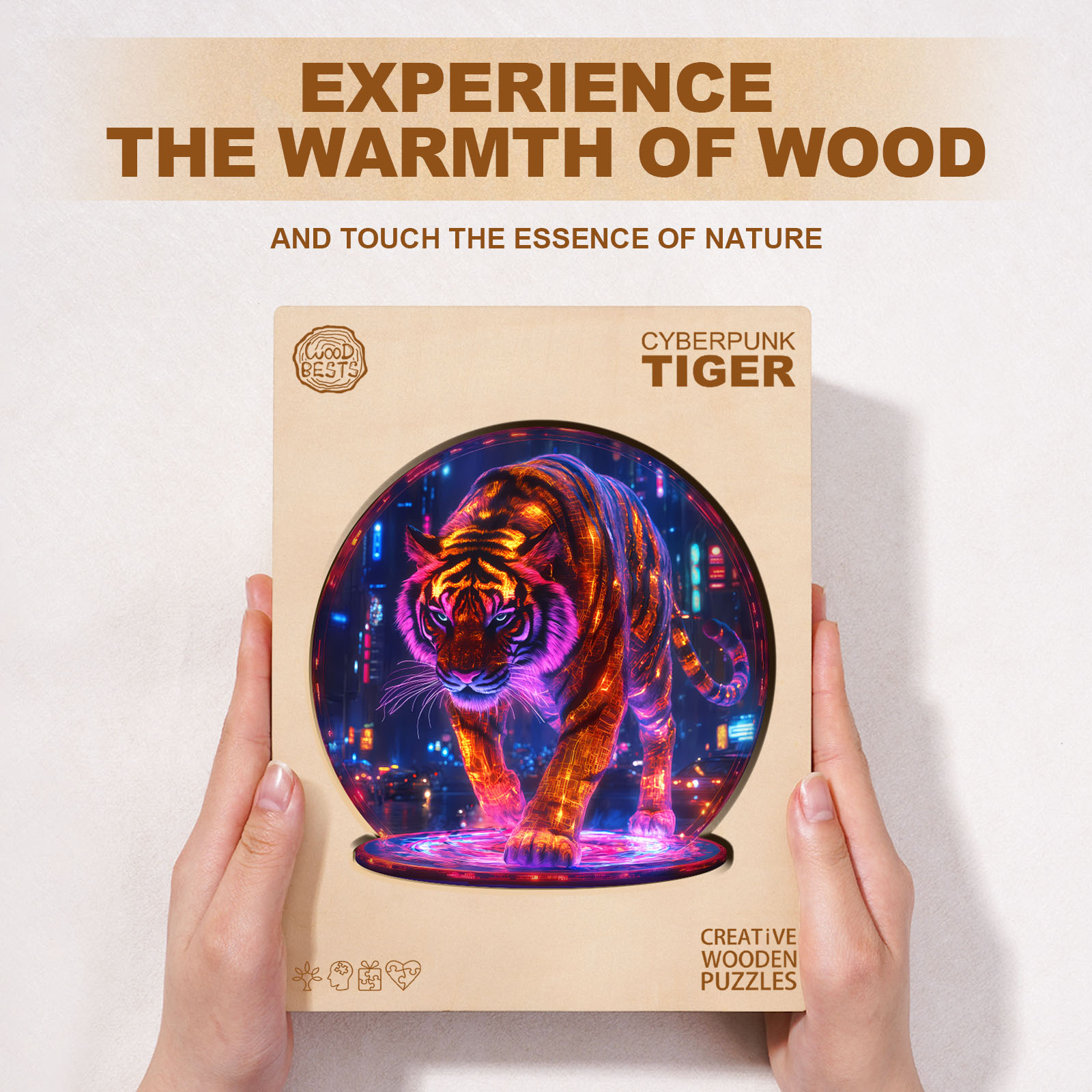 This captivating Kaayee wooden puzzle features a striking, futuristic tiger in a neon-lit, cyberpunk cityscape. The tiger glows with vibrant orange and purple light, its form appearing almost digital against the blurred backdrop of towering skyscrapers and bright signs. The puzzle is designed with a unique circular shape, and its wooden pieces are intricately cut to follow the contours of this dynamic scene. This puzzle is a perfect choice for those who love modern, imaginative art and want a unique and visually thrilling challenge.