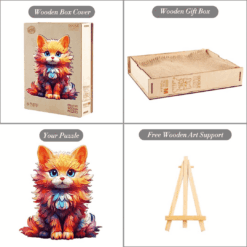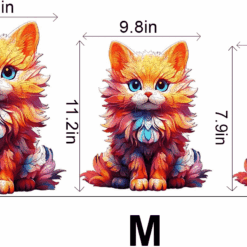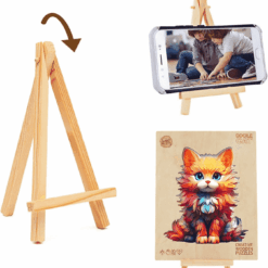 The Docile Cat wooden puzzle is a vibrant, eye-catching piece that showcases a charming and colorful cat with large, expressive eyes. Each wooden piece is uniquely shaped, contributing to the intricate assembly of this fluffy feline. The vivid colors blend beautifully, creating a dynamic visual effect that brings the cat’s soft fur and calm demeanor to life. Crafted from high-quality wood, this puzzle is durable and satisfying to complete
