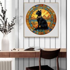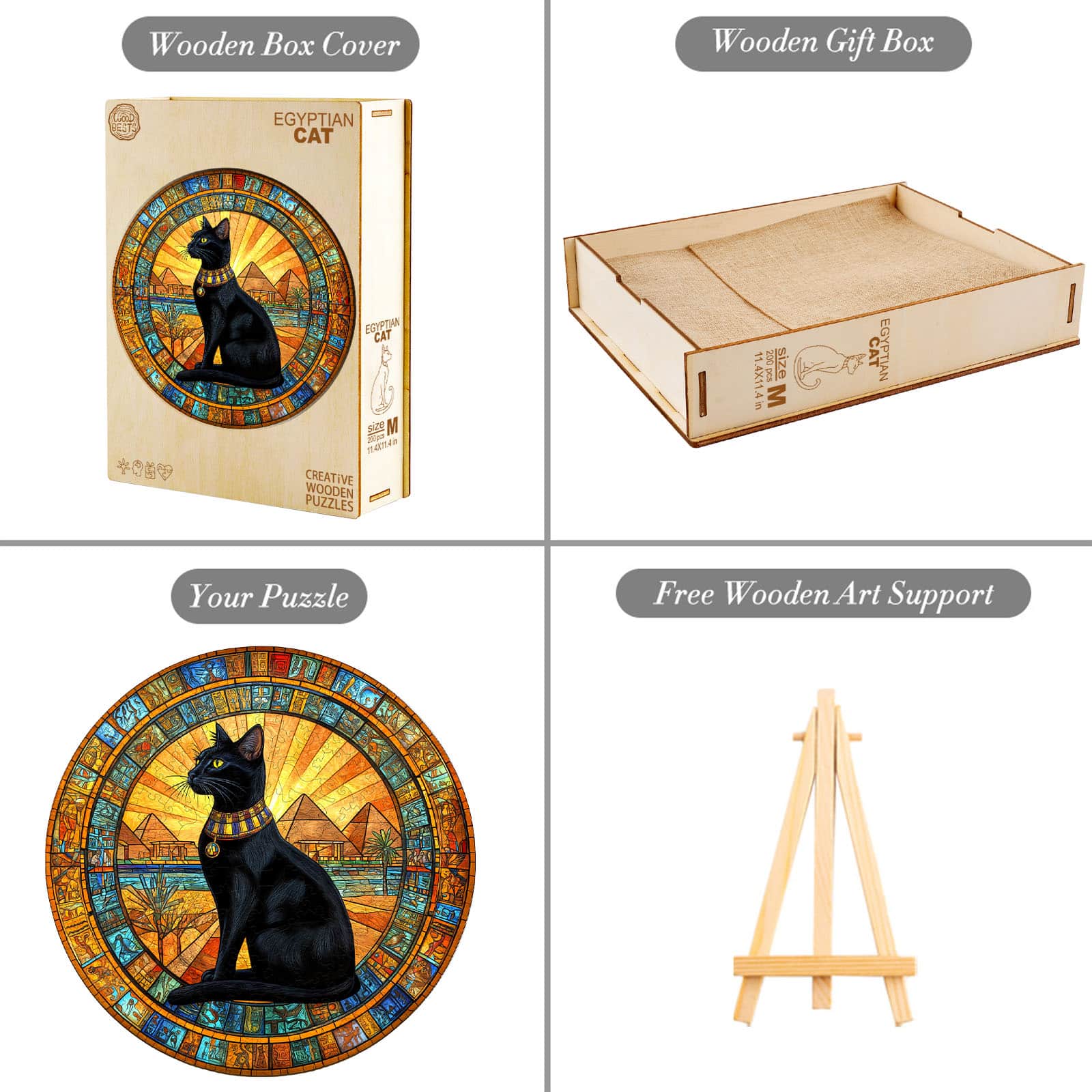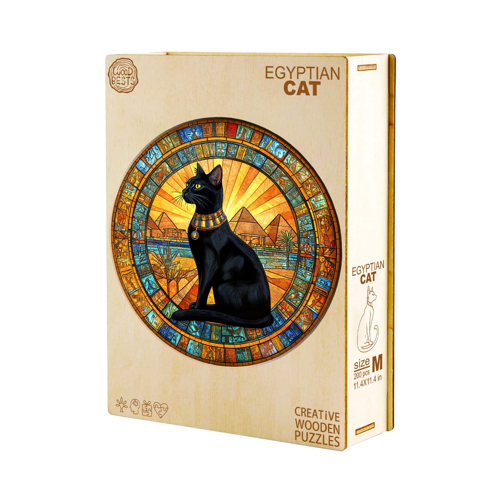 Step into the mystical world of ancient Egypt with this stunning wooden puzzle featuring a regal black cat adorned with a traditional collar. Set against a breathtaking backdrop of the Great Pyramids and a radiant golden sunset, this artwork is framed by intricate hieroglyphic details, evoking the beauty and mystery of Egyptian culture. Each precisely cut wooden piece fits together seamlessly, offering a rewarding and immersive puzzle experience. Perfect for cat lovers, history enthusiasts, and puzzle collectors, this exquisite design makes for a unique gift and a captivating display piece once completed!
